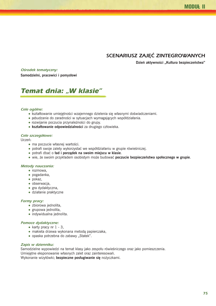 MODUŁ II SCENARIUSZ ZAJĘĆ ZINTEGROWANYCH Dzieñ aktywnoœci „Kultura bezpieczeñstwa” Ośrodek tematyczny: Samodzielni, pracowici i pomys³owi Temat dnia: „W klasie” Cele ogólne: • kszta³towanie umiejêtnoœci wzajemnego dzielenia siê w³asnymi doœwiadczeniami. • pobudzanie do zaradnoœci w sytuacjach wymagaj¹cych wspó³dzia³ania. • rozwijanie poczucia przynale¿noœci do grupy. • kszta³towanie odpowiedzialnoœci za drugiego cz³owieka. Cele szczegółowe: Uczeñ: • ma poczucie w³asnej wartoœci. • potrafi swoje zalety wykorzystaæ we wspó³dzia³aniu w grupie rówieœniczej. • potrafi dbaæ o ³ad i porz¹dek na swoim miejscu w klasie. • wie, ¿e swoim przyk³adem osobistym mo¿e budowaæ poczucie bezpieczeñstwa spo³ecznego w grupie. Metody nauczania: • rozmowa, • pogadanka, • pokaz, • obserwacja, • gra dydaktyczna, • dzia³anie praktyczne Formy pracy: • zbiorowa jednolita, • grupowa jednolita, • indywidualna jednolita. Pomoce dydaktyczne: • karty pracy nr 1 - 3, • makieta drzewa wykonana metod¹ papierczaka, • opaska potrzebna do zabawy „Statek”. Zapis w dzienniku: Samodzielne wypowiedzi na temat klasy jako zespo³u rówieœniczego oraz jako pomieszczenia. Umiejêtne eksponowanie w³asnych zalet oraz zainteresowañ. Wykonanie wizytówki; bezpieczne pos³ugiwanie siê no¿yczkami. 75 ZASADY BEZPIECZNEGO ZACHOWANIA W SZKOLE Cele operacyjne Zadania dla uczniów Czynnoœci uczniów Pomoce dydaktyczne Potrafi rozwi¹zaæ rebus i odczytaæ has³o. Zna zasady pracy zespo³owej. Wyznaczenie kapitana zespo³u. Odczytanie has³a: „NASZA KLASA”. Dy¿urni rozk³adaj¹ na sto³ach rebusy. Po rozwi¹zaniu, w sposób kulturalny, zg³aszaj¹ siê do odpowiedzi przez podniesienie rêki. Karta pracy nr 1 Umie samodzielnie u³o¿yæ zdania na temat wygl¹du pomieszczenia klasowegoi odpowiedzieæ na pytanie: Czy kolorowa i piêknie umeblowana klasa wystarczy, aby dzieci by³y bezpieczne i mia³y dobre samopoczucie? Omówienie wystroju sali lekcyjnej wg planu: – kolor œcian, – zas³onki, – stoliki i krzes³a, – rodzaj oœwietlenia, – porz¹dek i estetyka. Spontaniczne wypowiadanie siê. Wskazuj¹ cechy w³asne i rówieœników, które warunkuj¹ dobr¹ atmosferê w grupie. Czuje siê doceniony przez rówieœników. Sprawnie i bezpiecznie umie pos³ugiwaæ siê no¿yczkami. Rozumie zalety pracy zespo³owej. Montowanie na œcianie, z pomoc¹ nauczyciela, makiety drzewa. Swobodne wypowiedzi, dokonanie samooceny. Odpowiadaj¹ na pytanie: Które moje zalety mog¹ przydaæ siê, we wspó³¿yciu i wspó³dzia³aniu w zespole klasowym? Wykonuj¹ samodzielnie swoj¹ wizytówkê. Materia³ pomocniczy dla nauczyciela Karta pracy nr 2. Potrafi dzieliæ siê w³asnymi doœwiadczeniami.Ma poczucie w³asnej wartoœci. Dba o bezpieczeñstwo spo³eczne w grupie rówieœniczej. Sk³adanie rozsypanki sylabowej. Umieszczanie wizytówek na drzewie. G³oœne czytanie. Otrzymane has³o „NASZA KLASA” przypinaj¹ pod makiet¹ drzewa. Formu³uj¹ wniosek i zapisuj¹ do zeszytu: Dobre samopoczucie w klasie zale¿y od nas wszystkich. B¹dŸmy uprzejmi i odpowiedzialni, szanujmy siê wzajemnie. Karta pracy nr 3. Indywidualne wyposa¿enie uczniów. Rozumie wagê zaufania i odpowiedzialnoœci za drugiego cz³owieka. Zabawa integruj¹ca: „UWAGA SKA£A”. Jedno z dzieci bêdzie „statkiem”, Opaska a pozosta³e ska³ami. „Ska³y” zas³aniaj¹ca oczy. siadaj¹ na pod³odze w nieregularnych odstêpach. „Statek” z zawi¹zanymi oczyma przemierza morze (klasê). Kiedy statkowi bêdzie grozi³o rozbicie o ska³ê, pozosta³e dzieci naœladuj¹ szum morza. Zadaniem statku jest bezpieczne dotarcie do portu. Gdy statek dotrze do brzegu, inne dziecko przejmuje tê rolê. 76 MODUŁ II MATERIAŁ POMOCNICZY DLA NAUCZYCIELA Makieta drzewa wykonana metodą papierczaka (gnieciony szary papier, wysokość 2 m) 77 ZASADY BEZPIECZNEGO ZACHOWANIA W SZKOLE KARTA PRACY UCZNIA NR 1. Rozwiąż rebusy. tka + sa = ................. 78 MODUŁ II KARTA PRACY UCZNIA NR 2. Na podstawie przedstawionych wzorów wykonaj w³asn¹ wizytówkê. 79 ZASADY BEZPIECZNEGO ZACHOWANIA W SZKOLE KARTA PRACY UCZNIA NR 3. Po³¹cz prawid³owo sylaby, odczytaj has³o. NA KLA SA SZA 80