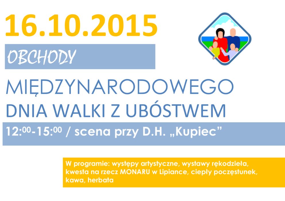 16.10.2015 OBCHODY MIĘDZYNARODOWEGO DNIA WALKI Z UBÓSTWEM 12:00-15:00 / scena przy D.H. „Kupiec” W programie: występy artystyczne, wystawy rękodzieła, kwesta na rzecz MONARU w Lipiance, ciepły poczęstunek, kawa, herbata