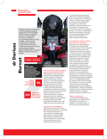 Historie sukcesu stypendystów SCIEX w ramach kolejnego stypendium SCIEX i kilku mniejszych projektów. Zatem: zacząłem coś, co okazało się użyteczne i dobre do tego stopnia, że zainteresował się tym biznes. Na swoim koncie mam kilka publikacji w wysoko punktowanych czasopismach naukowych (np. „International Journal of Hydrogen Energy”, „Fuel Cells”) i prezentacje na dobrych konferencjach naukowych, na które prawdopodobnie nigdy bym nie pojechał, gdyby nie SCIEX i moja późniejsza praca. dr Dariusz Burnat Studiował inżynierię materiałową w Państwowej Wyższej Szkole Zawodowej w Tarnowie (2002-2006), a potem na Akademii Górniczo-Hutniczej (AGH) w Krakowie na Wydziale Inżynierii Materiałowej i Ceramiki. W 2008 r. ukończył studia z wyróżnieniem i rozpoczął na AGH studia doktoranckie – badania kontynuował w ramach szwajcarskiego Funduszu Stypendialnego SCIEX w instytucie EMPA. Pracę doktorską obronił w 2012 r. Czas realizacji stypendium SCIEX: 1.11.2009 – 30.04.2011 Projekt: NANO-SOFC – Preparation and Characterization of Nanostructured, Alternative Solid Oxide Fuel Cell (SOFC) Anodes with Focus on Carbon Containing Fuels Akademia Górniczo-Hutnicza im. Stanisława Staszica w Krakowie CH PL Swiss Federal Laboratoires for Materials Science and Technology Jaki był cel Pana projektu realizowanego w ramach programu SCIEX? Najważniejszym dla mnie celem było skończyć studia doktoranckie za granicą, zebrać materiał do rozprawy doktorskiej i napisać doktorat. I to się udało. Natomiast konkretnym zadaniem projektu było opracowanie anod, które mogłyby się dobrze sprawdzić w podwyższonej temperaturze i mogłyby być wydajne przez dłuższy okres niż te obecnie wykorzystywane. Miałem zaproponować nowe materiały stosowane w ogniwach paliwowych, które to materiały rozwiązywałyby pewne pojawiające się stale problemy (np. niskie przewodnictwo elektronowe, mała odporność na procesy utleniania). Jakie były rezultaty projektu? Opracowaliśmy materiały, którymi zainteresował się partner w przemyśle. Sam zakończyłem projekt i od razu zacząłem zwyczajną pracę jako postdoc w instytucie EMPA (Swiss Federal Laboratoires for Materials Science and Technology), natomiast badania nad tym rozwiązaniem kontynuowano Jak stypendium wpłynęło na Pana życie zawodowe i prywatne? Wybór pracy za granicą sprawił, że mogłem się o wiele bardziej rozwinąć naukowo. Praca zawodowa w Szwajcarii, jeśli chodzi o moją dziedzinę, daje duże pole do popisu – można tam zrobić o wiele więcej, być może też lepiej niż gdzie indziej. Moje obecne życie zawodowe jest bezpośrednim wynikiem właśnie stypendium SCIEX, np. to dzięki niemu moja kolejna praca sama mnie znalazła, poza tym gdyby nie stypendium, na pewno nie współpracowałbym przy projektach, które realizuję. SCIEX pomógł mi również zbudować ważną sieć kontaktów, co jest współcześnie bardzo ważne w karierze zawodowej. W kategoriach prywatnych: mogę się pochwalić lepszą znajomością języków obcych. Do angielskiego dodałem już niemiecki, którym dziś posługuję się swobodnie na co dzień, a przede mną opanowanie francuskiego, którego właśnie się uczę. Zdobyłem też kwalifikacje z zakresu zarządzania projektem, pracy w międzynarodowym i wielokulturowym środowisku, lepszego zarządzania czasem i inne. Gdyby nie stypendium… … nie byłoby mnie dzisiaj tutaj, gdzie jestem. Nie miałbym szansy się tak bardzo rozwinąć, tyle osiągnąć w tak krótkim czasie. To było nieocenione doświadczenie.