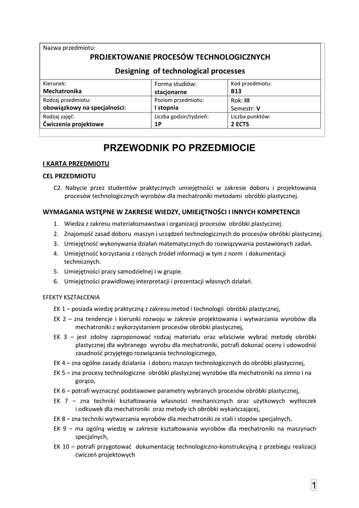 Nazwa przedmiotu: PROJEKTOWANIE PROCESÓW TECHNOLOGICZNYCH Designing of technological processes Kierunek: Kod przedmiotu: Mechatronika Forma studiów: stacjonarne Rodzaj przedmiotu: Poziom przedmiotu: obowiązkowy na specjalności: I stopnia B13 Rok: III Semestr: V Rodzaj zajęć: Liczba godzin/tydzień: Liczba punktów: Ćwiczenia projektowe 1P 2 ECTS PRZEWODNIK PO PRZEDMIOCIE I KARTA PRZEDMIOTU CEL PRZEDMIOTU C2. Nabycie przez studentów praktycznych umiejętności w zakresie doboru i projektowania procesów technologicznych wyrobów dla mechatroniki metodami obróbki plastycznej. WYMAGANIA WSTĘPNE W ZAKRESIE WIEDZY, UMIEJĘTNOŚCI I INNYCH KOMPETENCJI 1. 2. 3. 4. Wiedza z zakresu materiałoznawstwa i organizacji procesów obróbki plastycznej. Znajomość zasad doboru maszyn i urządzeń technologicznych do procesów obróbki plastycznej. Umiejętność wykonywania działań matematycznych do rozwiązywania postawionych zadań. Umiejętność korzystania z różnych źródeł informacji w tym z norm i dokumentacji technicznych. 5. Umiejętności pracy samodzielnej i w grupie. 6. Umiejętności prawidłowej interpretacji i prezentacji własnych działań. EFEKTY KSZTAŁCENIA EK 1 – posiada wiedzę praktyczną z zakresu metod i technologii obróbki plastycznej, EK 2 – zna tendencje i kierunki rozwoju w zakresie projektowania i wytwarzania wyrobów dla mechatroniki z wykorzystaniem procesów obróbki plastycznej, EK 3 – jest zdolny zaproponować rodzaj materiału oraz właściwie wybrać metodę obróbki plastycznej dla wybranego wyrobu dla mechatroniki, potrafi dokonać oceny i udowodnić zasadność przyjętego rozwiązania technologicznego, EK 4 – zna ogólne zasady działania i doboru maszyn technologicznych do obróbki plastycznej, EK 5 – zna procesy technologiczne obróbki plastycznej wyrobów dla mechatroniki na zimno i na gorąco, EK 6 – potrafi wyznaczyć podstawowe parametry wybranych procesów obróbki plastycznej, EK 7 – zna techniki kształtowania własności mechanicznych oraz użytkowych wytłoczek i odkuwek dla mechatroniki oraz metody ich obróbki wykańczającej, EK 8 – zna techniki wytwarzania wyrobów dla mechatroniki ze stali i stopów specjalnych, EK 9 – ma ogólną wiedzę w zakresie kształtowania wyrobów dla mechatroniki na maszynach specjalnych, EK 10 – potrafi przygotować dokumentację technologiczno-konstrukcyjną z przebiegu realizacji ćwiczeń projektowych 1 TREŚCI PROGRAMOWE Forma zajęć – ĆWICZENIA PROJEKTOWE P 1 – Analiza założeń projektowych, technologiczność tłoczonych i kutych przedmiotów dla mechatroniki, nowoczesność wyrobu, baza danych wyjściowych. P 2 – Metodyka projektowania i zasady opracowywania procesów technologicznych z zastosowaniem obróbki plastycznej na zimno, ciepło i gorąco. P 3 – Analiza techniczno-ekonomiczna wyboru technologii wykonania, wytyczne projektowania optymalnych procesów obróbki plastycznej wyrobów dlamechatroniki. P 4 – Systemy CAD/CAM w projektowaniu procesów technologicznych obróbki plastycznej, komputerowe metody projektowania procesów technologicznych. P 5 – Opracowanie dokumentacji technologicznej procesów obróbki plastycznej wyrobów dla mechatroniki, dobór maszyn i urządzeń technologicznych. P 6 – Projektowanie procesów technologicznych tłoczenia wyrobów cylindrycznych dla mechatroniki, opracowanie dokumentacji technologicznej. P 7 – Projektowanie procesów technologicznych tłoczenia wyrobów prostokątnych dla mechatroniki, opracowanie dokumentacji technologicznej. P 8 – Projektowanie procesów technologicznych elementów dla mechatroniki z wykorzystaniem specjalnych metod tłoczenia, opracowanie dokumentacji technologicznej. P 9 – Projektowanie procesów technologicznych wykonania elementów dla mechatroniki z wykorzystaniem procesów wyciskania, opracowanie dokumentacji technologicznej. P 10 – Projektowanie technologii kształtowania odkuwek matrycowych dla mechatroniki na młotach, opracowanie dokumentacji technologicznej. P 11 – Projektowanie technologii kształtowania odkuwek matrycowych dla mechatroniki na prasach, opracowanie dokumentacji technologicznej. P 12 – Projektowanie operacji zamykających proces kucia matrycowego elementów dla mechatroniki na młotach i prasach, opracowanie dokumentacji technologicznej. P 13 – Projektowanie technologii kształtowania precyzyjnych odkuwek matrycowych dla mechatroniki na kowarkach, opracowanie dokumentacji technologicznej. P 14 – Projektowanie technologii kształtowania odkuwek matrycowych dla mechatroniki z wykorzystaniem maszyn specjalnych, opracowanie dokumentacji technologicznej. P 15 – Organizacja i rozplanowanie gniazda roboczego, projektowanie zmechanizowanej lub automatycznej linii produkcyjnej do wykonania wyrobów dla mechatroniki metodami obróbki plastycznej. Liczba godzin 1 1 1 1 1 1 1 1 1 1 1 1 1 1 1 NARZĘDZIA DYDAKTYCZNE 1. – ćwiczenia projektowe, opracowanie dokumentacji technologicznych dla wybranego procesu obróbki plastycznej o zakresie zgodnym z realizacją przebiegu ćwiczeń 2. – pokaz procesów technologicznych tłoczenia, kucia na młotach, prasach i maszynach specjalnych 3. – baza danych materiałowych, normy dotyczące technologii obróbki plastycznej 4. – literatura przedmiotu do wykonania ćwiczeń projektowych 5. – przykłady gotowych wyrobów i półwyrobów wytworzonych różnymi technologiami obróbki plastycznej 2 SPOSOBY OCENY ( F – FORMUJĄCA, P – PODSUMOWUJĄCA) F1. – ocena przygotowania do ćwiczeń projektowych F2. – ocena umiejętności stosowania zdobytej wiedzy podczas wykonywania prac projektowych F3. – ocena dokumentacji technologicznych z realizacji ćwiczeń projektowych objętych programem nauczania F4. – ocena aktywności podczas zajęć P1. – ocena umiejętności rozwiązywania postawionych problemów oraz sposobu prezentacji wykonanych prac projektowych – zaliczenie na ocenę* *) warunkiem uzyskania zali