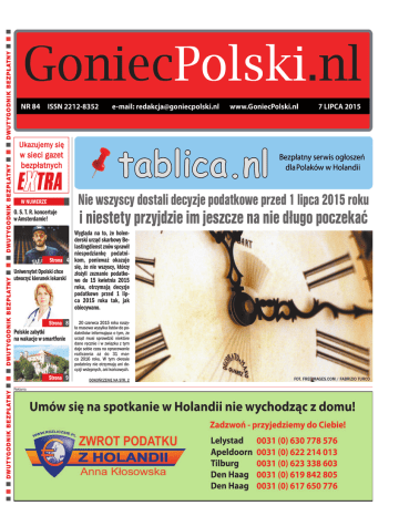 n n n DWUTYGODNIK BEZPŁATNY n n n DWUTYGODNIK BEZPŁATNY n n n DWUTYGODNIK BEZPŁATNY n n n DWUTYGODNIK BEZPŁATNY n n n Ukazujemy się w sieci gazet bezpłatnych W NUMERZE Nie wszyscy dostali decyzje podatkowe przed 1 lipca 2015 roku O. S. T. R. koncertuje w Amsterdamie! i niestety przyjdzie im jeszcze na nie długo poczekać Wygląda na to, że holenderski urząd skarbowy Belastingdienst znów sprawił niespodziankę podatniStrona 4 kom, ponieważ okazuje się, że nie wszyscy, którzy Uniwersytet Opolski chce złożyli zeznanie podatkoutworzyć kierunek lekarski we do 15 kwietnia 2015 roku, otrzymają decyzje podatkowe przed 1 lipca 2015 roku tak, jak obiecywano. Strona 8 Polskie zabytki na wakacje w smartfonie Strona 9 Reklama 20 czerwca 2015 roku ruszyła masowa wysyłka listów do podatników informująca o tym, że urząd musi sprawdzić niektóre dane ręcznie i w związku z tym daje sobie czas na opracowanie rozliczenia aż do 31 marca 2016 roku. W tym okresie podatnicy nie otrzymają ani decyzji wstępnych, ani końcowych. DOKOŃCZENIE NA STR. 2 FOT. FREEIMAGES.COM / FABRIZIO TURCO 2 Praca i życie w Holandii Nie wszyscy dostali decyzje podatkowe przed 1 lipca 2015 roku PRACA l Opiekunki poporodowe. Praca w KAJTEK Polski Kraamzorg. KAJTEK Polski Kraamzorg zatrudni dyplomowane opiekunki poporodowe, jak również osoby, które chciałyby kształcić się jako kraamverzorgende. Oferujemy dobre warunki pracy, szkolenie i staż. Szukamy chętnych z całej prowincji Zuid – Holland. Wymagamy dobrej znajomości języka polskiego i niderlandzkiego (B1, B2). Zainteresowanych prosimy o kontakt na nasz adres mailowy: [email protected] lub telefonicznie: 070 – 3077 – 778. l Blacharze samochodowi do pracy w Holandii. Dla naszego klienta w Holandii poszukujemy blacharzy samochodowych. Wymagania: wykształcenie i doświadczenie w zawodzie; dobra znajomość języka angielskiego. Oferujemy: wynagrodzenie w wysokości 9,41 euro netto / godz. po odliczeniu kosztów zakwaterowania i ubezpieczenia; kompensatę za transport prywatnym samochodem w wysokości 0,19 euro za km.; zakwaterowanie: pokoje jednoosobowe / dwuosobowe z Internetem; wynagrodzenie płatne na okres 4 tygodni, możliwość pobierania zaliczek; godziny pracy: min. 160 na okres 4 tyg. + możliwość wykonywania nadgodzin; umowę o pracę na warunkach holenderskich z pracodawcą holenderskim. Przy zainteresowaniu niniejszą ofertą pracy, proszę o kontakt pod numerem telefonu komórkowego +48 668 453 738 lub na mail [email protected]. Stefan Lagae, REGON: 361177150. l Zbieranie zamówień Den Bosch SPS. Agencja pra- cy Job Investment do jednego ze swoich najlepszych klientów, którym jest firma SPS B. V mieszcząca się w Den Bosch i poszukuje pracowników na stanowisko: * pracownik magazynu (zbieranie zamówień). Wymagamy: doświadczenie na podobnym stanowisku, (operator wózka widłowego bocznego, expedycji, pracownik produkcji, zbieranie zamówień), znajomość zasad funkcjonowania magazynu, certyfikaty, porozumiewanie się w języku obcym (angielski, holenderski), dokładność i rzetelność w wykonywaniu zadań. Oferujemy: Umowę o prace oparta o holenderskie warunki pracy, ciekawe wynagrodzenie, ciekawą i odpowiedzialną pracę opiekę polskich koordynatorów. Jeśli jesteś zainteresowany powyższą oferta oraz spełniasz wymagania, skontaktuj WTOREK, 7 lipca 2015 się z nami pod numerem telefonu: 073-711-3-717 lub 073711-3-712 oraz prześlij nam swoje CV na adres mailowy: [email protected] z góry dziękujemy za aplikacje, Grupa Job Investment. l Avon-Zostań Konsultantką w Holandii. Serdecznie zapraszam do współpracy w branży kosmetycznej na terenie Holandii. Pracujemy na polskich katalogach, a co za tym idzie, wszystkie produkty są w polskich cenach. Ceny zatem, w przeliczeniu na EURO, są naprawdę niskie, a to z kolei jest doskonały argument do zachęcenia klientek do wypróbowania dobrej jakości kosmetyków. Avon oferuje: -Upusty od 15% do 40%, --Wpisowe 0 zł!!, -Nagrody i upusty w ofertach promocyjnych, -Dostęp do produktów przedpremierowych, -Przywileje, konkursy, super nagrody, -Prezenty i atrakcyjne oferty w ramach specjalnego programu dla nowej konsultantki. Poza tym ode mnie: -pakiet startowy (w tym katalogi i próbki), -pewny kurier z kosmetykami Polska –Holandia, -opieka i pomoc. Darmowa rejestracja Ty planujesz ile godzin pracujesz. Zapraszam. Skontaktuj się ze mną: Angelika, tel: 0617 800 383, email:[email protected]. l PRACOWNIK BIUROWY W TILBURGU. Kancelaria Po- datkowa Anna Kłosowska poszukuje: PRACOWNIKA BIUROWEGO W TILBURGU. Od kandydatów oczekujemy: biegłej znajomości jednego z języków obcych: holenderskiego lub angielskiego, wykształcenie wyższe mile widziane ekonomiczne, wysokiej kultury osobistej, sumienności i dokładności, dobrej organizacji czasu i pracy, umiejętności pracy w zespole i pod presją czasu, dyspozycyjności, prawo jazdy kategorii B. W zamian oferujemy: pracę w dynamicznie rozwijającej się firmie o ugruntowanej pozycji na rynku już od 1999 r. i zatrudniającej kilkadziesiąt osób, pracę w młodym i dynamicznym zespole, motywacyjny system wynagrodzeń (stała pensja + premia), mieszkanie służbowe w Tilburgu, samochód służbowy, laptop, telefon komórkowy, stała umowa o pracę bezpośrednio z pracodawcą. CV – proszę przesłać na maila: [email protected]. i niestety przyjdzie im jeszcze na nie długo poczekać DOKOŃCZENIE ZE STR. 1 Dokładną wersję pisma w oryginale (Fot. 1), jak i w polskim tłumaczeniu (Fot. 2) załączamy do niniejszego artykułu. Z informacji udzielanych na infolinii Belastingdienst przez urzędników wynika, że inspektorzy będą chcieli dokładnie sprawdzić dochody światowe podatników, być może zatem zobligują podatników do wysłania potwierdzeń o wysokości ‹ ‹ ‹ FOT. FREEIMAGES. COM / FELIPE WIECHETECK Praca i życie w Holandii ‹ ‹ ‹ dochodów z urzędów podatkowych z kraju zameldowania.