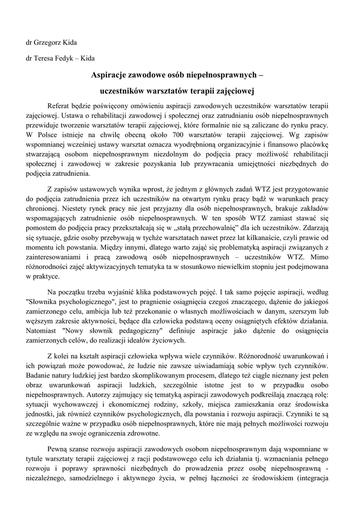 dr Grzegorz Kida dr Teresa Fedyk – Kida Aspiracje zawodowe osób niepełnosprawnych – uczestników warsztatów terapii zajęciowej Referat będzie poświęcony omówieniu aspiracji zawodowych uczestników warsztatów terapii zajęciowej. Ustawa o rehabilitacji zawodowej i społecznej oraz zatrudnianiu osób niepełnosprawnych przewiduje tworzenie warsztatów terapii zajęciowej, które formalnie nie są zaliczane do rynku pracy. W Polsce istnieje na chwilę obecną około 700 warsztatów terapii zajęciowej. Wg zapisów wspomnianej wcześniej ustawy warsztat oznacza wyodrębnioną organizacyjnie i finansowo placówkę stwarzającą osobom niepełnosprawnym niezdolnym do podjęcia pracy moŜliwość rehabilitacji społecznej i zawodowej w zakresie pozyskania lub przywracania umiejętności niezbędnych do podjęcia zatrudnienia. Z zapisów ustawowych wynika wprost, Ŝe jednym z głównych zadań WTZ jest przygotowanie do podjęcia zatrudnienia przez ich uczestników na otwartym rynku pracy bądź w warunkach pracy chronionej. Niestety rynek pracy nie jest przyjazny dla osób niepełnosprawnych, brakuje zakładów wspomagających zatrudnienie osób niepełnosprawnych. W ten sposób WTZ zamiast stawać się pomostem do podjęcia pracy przekształcają się w „stałą przechowalnię” dla ich uczestników. Zdarzają się sytuacje, gdzie osoby przebywają w tychŜe warsztatach nawet przez lat kilkanaście, czyli prawie od momentu ich powstania. Między innymi, dlatego warto zająć się problematyką aspiracji związanych z zainteresowaniami i pracą zawodową osób niepełnosprawnych – uczestników WTZ. Mimo róŜnorodności zajęć aktywizacyjnych tematyka ta w stosunkowo niewielkim stopniu jest podejmowana w praktyce. Na początku trzeba wyjaśnić klika podstawowych pojęć. I tak samo pojęcie aspiracji, według "Słownika psychologicznego", jest to pragnienie osiągnięcia czegoś znaczącego, dąŜenie do jakiegoś zamierzonego celu, ambicja lub teŜ przekonanie o własnych moŜliwościach w danym, szerszym lub węŜszym zakresie aktywności, będące dla człowieka podstawą oceny osiągniętych efektów działania. Natomiast "Nowy słownik pedagogiczny" definiuje aspiracje jako dąŜenie do osiągnięcia zamierzonych celów, do realizacji ideałów Ŝyciowych. Z kolei na kształt aspiracji człowieka wpływa wiele czynników. RóŜnorodność uwarunkowań i ich powiązań moŜe powodować, Ŝe ludzie nie zawsze uświadamiają sobie wpływ tych czynników. Badanie natury ludzkiej jest bardzo skomplikowanym procesem, dlatego teŜ ciągle nieznany jest pełen obraz uwarunkowań aspiracji ludzkich, szczególnie istotne jest to w przypadku osobo niepełnosprawnych. Autorzy zajmujący się tematyką aspiracji zawodowych podkreślają znaczącą rolę: sytuacji wychowawczej i ekonomicznej rodziny, szkoły, miejsca zamieszkania oraz środowiska jednostki, jak równieŜ czynników psychologicznych, dla powstania i rozwoju aspiracji. Czynniki te są szczególnie waŜne w przypadku osób niepełnosprawnych, które nie mają pełnych moŜliwości rozwoju ze względu na swoje ograniczenia zdrowotne. Pewną szanse rozwoju aspiracji zawodowych osobom niepełnosprawnym dają wspomniane w tytule warsztaty terapii zajęciowej z racji podstawowego celu ich działania tj. wzmacniania pełnego rozwoju i poprawy sprawności niezbędnych do prowadzenia przez osobę niepełnosprawną niezaleŜnego, samodzielnego i aktywnego Ŝycia, w pełnej łączności ze środowiskiem (integracja społeczna). Cel ten jest realizowany poprzez ogólne usprawnianie psychofizyczne (rehabilitacja lecznicza i psychologiczna), rozwijanie umiejętności wykonywania czynności Ŝycia codziennego, przygotowanie do Ŝycia w środowisku społecznym (rehabilitacja społeczna), rozwijanie podstawowych i specjalistycznych umiejętności zawodowych umoŜliwiających podjęcie pracy zarobkowej bądź szkolenia zawodowego (rehabilitacja zawodowa). W trakcie przeprowadzanych warsztatów aktywizacyjnych z uczestnikami WTZ przeprowadzono na podstawie badań ankietowych ich krótką diagnozę aspiracji edukacyjno – zawodowych. Większość uczestników nie wyobraŜa sobie „Ŝycia” bez warsztatu terapii zajęciowej. Tylko nieliczni z nich mają jakikolwiek pomysł na „Ŝycie”, widząc inne moŜliwości działania poza strukturami warsztatów. Mimo bardzo pozytywnej roli WTZ, zamiast otwarcia ich uczestników na inne środowiska i aktywność zawodową poza ich ramami, stają się one dla nich „drugim domem”. To moŜe powodować obniŜenie poziomu aspiracji zawodowych, a co za tym idzie, równieŜ edukacyjnych. I tak największym powodzeniem w WTZ cieszą się „łatwe i przyjemne” pracownie, najczęściej jest to pracownia komputerowa, rzadziej inne, które wymagają od nich większego wysiłku, czyli np. pracownie rękodzielnicze. Prawie nikt z uczestników WTZ nie pracuje zawodowo. Większość z nich nie szuka pracy. Jedynie kilka osób planuje dalszą naukę. Wpływ na to na pewno ma obecna sytuacja na rynku pracy i uboga oferta edukacyjna dla osób niepełnosprawnych, decydującym czynnikiem jest teŜ bierność tych osób. Najczęstszym motywem wyboru zawodu jest wpływ innych oraz ograniczenia zdrowotne. Wartościami cenionymi w pracy zawodowej są dobre układy z ludźmi, praca z przyjaciółmi i znajomymi. Z ankiety wynika, iŜ Warsztat Terapii Zajęciowej nie jest traktowany przez osoby niepełnosprawne jako szansa zdobycia nowych umiejętności, tylko jako dobre miejsce spędzania czasu. To nie napawa optymizmem. Wynika z tego, Ŝe poziom aspiracji zawodowych osób niepełnosprawnych – uczestników WTZ jest stosunkowo niski. Potwierdzają to wyniki badań przeprowadzonych przez ekspertów z Instytutu Spraw Publicznych (ISP). 72 proc. badanych młodych niepełnosprawnych nie pracowało zarobkowo, a 80 proc. spośród nich swój status zawodowy określało jako „rencista”. Dwie piąte badanych nie było