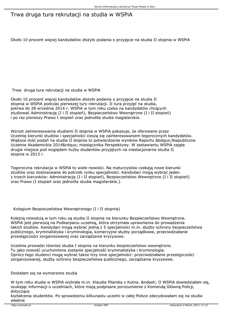 Serwis Informacyjny ustrzyki.pl Twoje Miasto w Sieci Trwa druga tura rekrutacji na studia w WSPiA Około 10 procent więcej kandydatów złożyło podania o przyjęcie na studia II stopnia w WSPiA Trwa druga tura rekrutacji na studia w WSPiA Około 10 procent więcej kandydatów złożyło podania o przyjęcie na studia II stopnia w WSPiA podczas pierwszej tury rekrutacji. II tura przyjęć na studia, potrwa do 28 września 2014 r. WSPiA w tym roku czeka na kandydatów chcących studiować Administrację (I i II stopień), Bezpieczeństwo Wewnętrzne (I i II stopień) i po raz pierwszy Prawo I stopień oraz jednolite studia magisterskie. Wzrost zainteresowania studiami II stopnia w WSPiA pokazuje, że oferowane przez Uczelnię kierunki studiów i specjalności cieszą się zainteresowaniem tegorocznych kandydatów. Większa ilość podań na studia II stopnia to potwierdzenie wyników Raportu „Niepubliczne Uczelnie Akademickie 2014” miesięcznika Perspektywy. W zestawieniu WSPiA zajęła drugie miejsce pod względem liczby studentów przyjętych na niestacjonarne studia II stopnia w 2013 r. Tegoroczna rekrutacja w WSPiA to wiele nowości. Na maturzystów czekają nowe kierunki studiów oraz dostosowane do potrzeb rynku specjalności. Kandydaci mogą wybrać jeden z trzech kierunków: Administrację (I i II stopień), Bezpieczeństwo Wewnętrzne (I i II stopień) oraz Prawo (I stopień oraz jednolite studia magisterskie.). Kolegium Bezpieczeństwa Wewnętrznego (I i II stopnia) Kolejną nowością w tym roku są studia II stopnia na kierunku Bezpieczeństwo Wewnętrzne. WSPiA jest pierwszą na Podkarpaciu uczelnią, która otrzymała uprawnienia do prowadzenia takich studiów. Kandydaci mogą wybrać jedną z 5 specjalności m.in. służby ochrony bezpieczeństwa publicznego, kryminalistyka i kryminologia, komercyjne służby porządkowe, przeciwdziałanie przestępczości zorganizowanej oraz zarządzanie kryzysowe. Uczelnia prowadzi również studia I stopnia na kierunku bezpieczeństwo wewnętrzne. Tu jako nowość uruchomiona zostanie specjalność kryminalistyka i kryminologia. Oprócz tego studenci mogą wybrać także trzy inne specjalności: przeciwdziałanie przestępczości zorganizowanej, służby ochrony bezpieczeństwa publicznego, zarządzanie kryzysowe. Dostałam się na wymarzone studia W tym roku studia w WSPiA wybrała m.in. Klaudia Pilarska z Kutna. – O WSPiA dowiedziałam się, szukając informacji o uczelniach, które mają podpisane porozumienie z Komendą Główną Policji, dotyczące kształcenia studentów. Po sprawdzeniu kilkunastu uczelni w całej Polsce zdecydowałam się na studia właśnie http://ustrzyki.pl Kreator PDF Utworzono 3 March, 2017, 11:15 Serwis Informacyjny ustrzyki.pl Twoje Miasto w Sieci w Wyższej Szkole Prawa i Administracji w Rzeszowie. Tę Uczelnię wybrała też ze względu na doskonałą\ i atrakcyjną ofertę dydaktyczną. Wiem, że tu zdobędę dobre wykształcenie. W WSPiA podoba mi się m.in. laboratorium kryminalistyczne, strzelnice elektroniczną i sale do ćwiczenia sztuk walki. Mocnym atutem jest też system praktyk oferowany przez WSPiA – tłumaczy Klaudia Pilarska z Kutna, przyjęta na studia I stopnia na kierunku Bezpieczeństwo Wewnętrzne w WSPiA. Kolegium Administracji i Biznesu (I i II stopnia) – Nowy Wymiar Administracji Administracja w WSPiA to studia I i II stopnia, stacjonarne i niestacjonarne. Nowoczesny program studiów dostosowany jest do potrzeb rynku pracy. W tym roku WSPiA wprowadza trzy nowe specjalności: e–administracja, stosunki międzynarodowe oraz zarządzanie w biznesie. Oprócz tego kandydaci mają do wyboru jedną z piętnastu specjalności m.in. administrację celną i skarbową, administrację publiczną, administrację wymiaru sprawiedliwości i prokuratury, administrację bezpieczeństwa wewnętrznego, administrowanie w służbie zdrowia, organizację pracy socjalnej i resocjalizację, studia europejskie, proces inwestycyjny czy też zarządzanie zasobami ludzkimi. Kolegium Prawa (I stopnia oraz jednolite magisterskie) W roku akademickim 2014/2015 Wyższa Szkoła Prawa i Administracji proponuje kandydatom na studia kilka nowości. Przede wszystkim studia I stopnia na kierunku prawo. Tu kandydaci mają do wyboru, jedną z 5 specjalności: prawnik korporacyjny, prawo w biznesie, prawnik w systemie bezpieczeństwa, referent prawny w administracji publicznej oraz prawnik w systemie wymiaru sprawiedliwości. Oprócz studiów pierwszego stopnia, WSPiA jako jedyna uczelnia niepubliczna na Podkarpaciu zaprasza również na jednolite studia magisterskie na kierunku prawo. Studenci tego kierunku są kompleksowo przygotowywani do podjęcia aplikacji w zakresie zawodów prawniczych. Więcej o studiach w WSPiA znajdziesz tutaj!!! Zapraszamy do naszych biurach rekrutacyjnych. – w Rzeszowie ul. Cegielniana 14, telefon 17 867 04 80, 17 867 04 81, 17 867 04 82. – w Przemyślu ul. Wybrzeże Ojca Świętego Jana Pawła II 2 telefon 16 679 13 30, 16 679 13 31, 16 667 90 60. Informacje o Rekrutacji znajdziesz również na stronie: www.rekrutacja.wspia.eu. Informacja: TEKST SPONSOROWANY http://ustrzyki.pl Kreator PDF Utworzono 3 March, 2017, 11:15