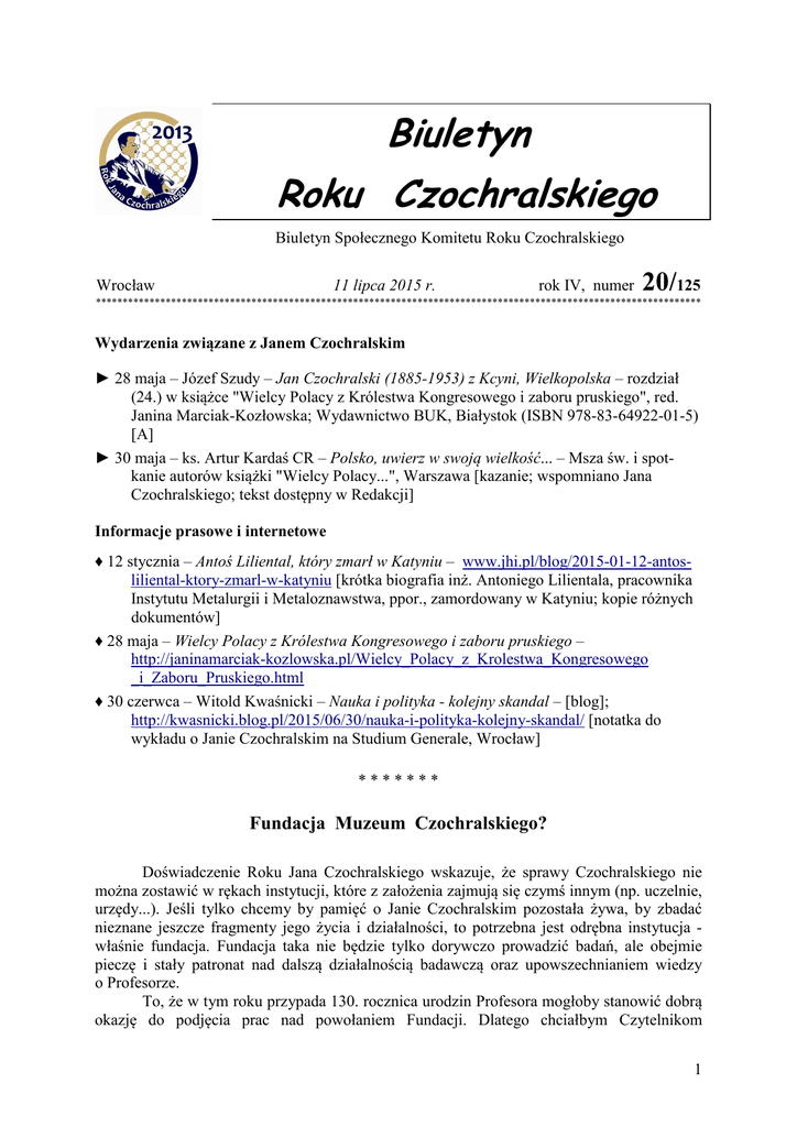 Biuletyn Roku Czochralskiego Biuletyn Społecznego Komitetu Roku Czochralskiego Wrocław 11 lipca 2015 r. rok IV, numer 20/125 ***************************************************************************************************************** Wydarzenia związane z Janem Czochralskim ► 28 maja – Józef Szudy – Jan Czochralski (1885-1953) z Kcyni, Wielkopolska – rozdział (24.) w książce "Wielcy Polacy z Królestwa Kongresowego i zaboru pruskiego", red. Janina Marciak-Kozłowska; Wydawnictwo BUK, Białystok (ISBN 978-83-64922-01-5) [A] ► 30 maja – ks. Artur Kardaś CR – Polsko, uwierz w swoją wielkość... – Msza św. i spotkanie autorów książki "Wielcy Polacy...", Warszawa [kazanie; wspomniano Jana Czochralskiego; tekst dostępny w Redakcji] Informacje prasowe i internetowe ♦ 12 stycznia – Antoś Liliental, który zmarł w Katyniu – www.jhi.pl/blog/2015-01-12-antosliliental-ktory-zmarl-w-katyniu [krótka biografia inż. Antoniego Lilientala, pracownika Instytutu Metalurgii i Metaloznawstwa, ppor., zamordowany w Katyniu; kopie różnych dokumentów] ♦ 28 maja – Wielcy Polacy z Królestwa Kongresowego i zaboru pruskiego – http://janinamarciak-kozlowska.pl/Wielcy_Polacy_z_Krolestwa_Kongresowego _i_Zaboru_Pruskiego.html ♦ 30 czerwca – Witold Kwaśnicki – Nauka i polityka - kolejny skandal – [blog]; http://kwasnicki.blog.pl/2015/06/30/nauka-i-polityka-kolejny-skandal/ [notatka do wykładu o Janie Czochralskim na Studium Generale, Wrocław] ******* Fundacja Muzeum Czochralskiego? Doświadczenie Roku Jana Czochralskiego wskazuje, że sprawy Czochralskiego nie można zostawić w rękach instytucji, które z założenia zajmują się czymś innym (np. uczelnie, urzędy...). Jeśli tylko chcemy by pamięć o Janie Czochralskim pozostała żywa, by zbadać nieznane jeszcze fragmenty jego życia i działalności, to potrzebna jest odrębna instytucja właśnie fundacja. Fundacja taka nie będzie tylko dorywczo prowadzić badań, ale obejmie pieczę i stały patronat nad dalszą działalnością badawczą oraz upowszechnianiem wiedzy o Profesorze. To, że w tym roku przypada 130. rocznica urodzin Profesora mogłoby stanowić dobrą okazję do podjęcia prac nad powołaniem Fundacji. Dlatego chciałbym Czytelnikom 1 "Biuletynu..." zaproponować podjęcie pewnego wysiłku intelektualnego i organizacyjnego. Myślę bowiem o założeniu... fundacji, która miałaby kilka celów do spełnienia. Przede wszystkim byłyby to jakieś ramy organizacyjne do kultywowania i kształtowania pamięci o Janie Czochralskim i do popularyzacji jego osoby i dokonań. Zwrócono mi niedawno uwagę, że nie ma gdzie przekazywać nie tylko pieniędzy ale i darów materialnych (np. książek, rzeźby "Tancerki" Jackowskiego). Podobno takie niezależne od różnych władz ciało jest bardziej wiarygodne niż stowarzyszenia, szkoły czy muzea. A propos - najbliższym celem tej fundacji byłyby starania o... muzeum Jan Czochralskiego (oczywiście w Kcyni!). Byłoby to silne wsparcie dla władz Kcyni w staraniach o zagospodarowanie dworca kolejowego, a może i okazja do przejęcia "Margowa"?! Właścicielom "Margowa" byłoby pewno łatwiej i poręczniej ofiarować dom dla Fundacji niż dla miasta? Itp., itd. ... Podobno taka fundacja mogłaby uzyskać jakieś wsparcie z funduszy unijnych (nie tylko dla regionu). A i odnowa grobowca Profesora byłaby możliwa... "Fundacja Jana Czochralskiego" lub "Fundacja Muzeum Jana Czochralskiego", lub jakoś inaczej - myślę, że to miałoby większy zasięg w kraju i może poza granicami. Byłby to jakiś zorganizowany ośrodek, najlepiej z siedzibą w Kcyni. Twórcami i członkami Fundacji byłyby osoby znane w kręgach zainteresowanych Janem Czochralskim, osoby urzędowe (burmistrz. marszałek, ...) . Może taka Fundacja dotarłaby do serc (i kasy) firm korzystających z wynalazku Jan Czochralskiego? Kto chciałby podjąć się takiej pracy? Kto chciałby się włączyć w to dzieło? Potrzebna jest teraz szeroka działalność informacyjna o planowanej Fundacji. Może należałoby uruchomić media społecznościowe? P.Tom. ***** Odkrycia Nieznane publikacje (cd) W tym numerze opisano metodę Czochralskiego. To chyba pierwsza recenzja publikacji o metodzie - w dodatku ukazała się... zanim opublikowano oryginalną pracę! ***** Z dobrych nowin - licencję na 18 miesięcy na emisję filmu "Powrót chemika" zakupiła platforma PLANETE+. Tak więc od września będą emisje u nich. ********* Paweł Tomaszewski INTiBS PAN 2