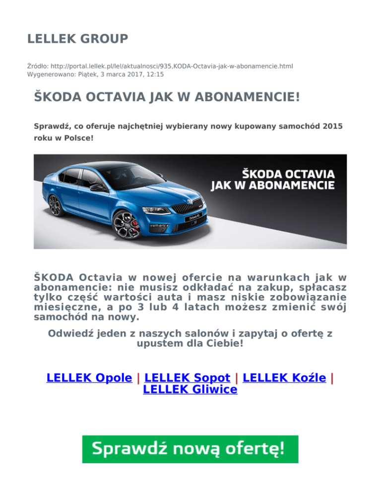 LELLEK GROUP Źródło: http://portal.lellek.pl/lel/aktualnosci/935,KODA-Octavia-jak-w-abonamencie.html Wygenerowano: Piątek, 3 marca 2017, 12:15 ŠKODA OCTAVIA JAK W ABONAMENCIE! Sprawdź, co oferuje najchętniej wybierany nowy kupowany samochód 2015 roku w Polsce! ŠKODA Octavia w nowej ofercie na warunkach jak w abonamencie: nie musisz odkładać na zakup, spłacasz tylko część wartości auta i masz niskie zobowiązanie miesięczne, a po 3 lub 4 latach możesz zmienić swój samochód na nowy. Odwiedź jeden z naszych salonów i zapytaj o ofertę z upustem dla Ciebie! LELLEK Opole | LELLEK Sopot | LELLEK Koźle | LELLEK Gliwice Tweetnij
