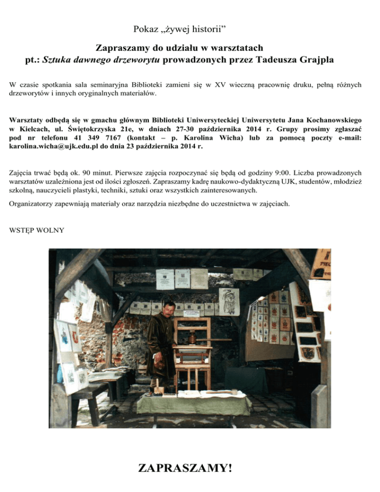Pokaz „żywej historii” Zapraszamy do udziału w warsztatach pt.: Sztuka dawnego drzeworytu prowadzonych przez Tadeusza Grajpla W czasie spotkania sala seminaryjna Biblioteki zamieni się w XV wieczną pracownię druku, pełną różnych drzeworytów i innych oryginalnych materiałów. Warsztaty odbędą się w gmachu głównym Biblioteki Uniwersyteckiej Uniwersytetu Jana Kochanowskiego w Kielcach, ul. Świętokrzyska 21e, w dniach 27-30 października 2014 r. Grupy prosimy zgłaszać pod nr telefonu 41 349 7167 (kontakt – p. Karolina Wicha) lub za pomocą poczty e-mail: [email protected] do dnia 23 października 2014 r. Zajęcia trwać będą ok. 90 minut. Pierwsze zajęcia rozpoczynać się będą od godziny 9:00. Liczba prowadzonych warsztatów uzależniona jest od ilości zgłoszeń. Zapraszamy kadrę naukowo-dydaktyczną UJK, studentów, młodzież szkolną, nauczycieli plastyki, techniki, sztuki oraz wszystkich zainteresowanych. Organizatorzy zapewniają materiały oraz narzędzia niezbędne do uczestnictwa w zajęciach. WSTĘP WOLNY ZAPRASZAMY! Program warsztatów Podczas warsztatów Tadeusz Grajpel zaprezentuje metody wycinania i odbijania drzeworytów, opowie o ich historii, ze szczególnym uwzględnieniem drzeworytów krakowskich, zwłaszcza oficyny Unglera, na tle historii drzeworytnictwa i historii druku. Pokaże również zasady działania zrekonstruowanej przez siebie prasy Gutenberga. Przedstawi dzieje piśmiennictwa począwszy od starożytności skończywszy na książce dzisiejszej. Dla pokazania dziejów kultury materialnej – repliki zabytków archeologicznych z różnych okresów, od narzędzi krzemiennych, kościanych, rogowych, poprzez miedź, brąz do epoki żelaza. Dzieje piśmiennictwa – m.in. tabliczki gliniane, papirus, pergamin, tabliczki woskowe, łupkowe, ołowiane, papier czerpany i inne materiały, historia książki. Szczególną rolę odgrywają prezentacje dawnej typografii, połączone z wykonywaniem reprintów starodruków. Obejmują one m.in. fragmenty polskiej Biblii Gutenberga, najstarszego tekstu drukowanego w języku polskim (1475), kronik, dawnych tekstów militarnych itp. Zostaną wydrukowane również teksty średniowiecznych dokumentów, aby umożliwić ich odczytanie współczesnemu odbiorcy, np.: Akt Lokacji Łodzi przez Władysława Jagiełłę (XV w), dokument fundacyjny Zbyluta dla klasztoru Cystersów w Łeknie (XII w). Przy omawianiu dziejów drukarstwa, szczególna uwaga zostanie poświęcam oczywiście postaci Jana Gutenberga, jego życiu i działalności. Jednym z ważniejszych tematów będzie również historia polskiego drukarstwa. Drzeworyt – rekonstrukcje klocków drzeworytniczych, głównie od XIV do XVI wieku, służą kilku celom: - pokazaniu metod pracy nad nimi (od wykonania klocka do druku); - prezentacji różnorodności zastosowań (druk na tkaninie, produkcja kart do gry, kalendarzy, map, ilustracja książkowa); - wydobyciu maksimum informacji zawartych w ich treści (analiza drzeworytu jako źródła historycznego) Najstarsze wyobrażenie oficyny drukarskiej z „Dance Macabre”, Lyon 1499 (z lewej: klocek drzeworytniczy, z prawej: odbitka) Heraldyka – w oparciu o wyobrażenia herbowe występujące w demonstrowanych drzeworytach i drukach oraz kopiach ilustracji z dawnych herbarzy, zostanie omówiona rola i znaczenie herbu w dziejach. Warsztaty mają na celu popularyzację wiedzy historycznej. Połączone są z rozbudowanym komentarzem słownym, obejmującym szeroki kontekst kulturowy omawianych zagadnień. Tadeusz Grajpel, mieszka w Końskich, w woj. Świętokrzyskim, tam też stworzył i prowadzi autorską Pracownię Badań i Edukacji Historycznej. Od 20 lat zajmuje się odtwarzaniem dawnych technologii i rzemiosł związanych z dziejami książki, dokumentu i drzeworytu. Wykonał rekonstrukcję prasy drukarskiej Gutenberga, oraz około stu replik klocków drzeworytniczych, głównie średniowiecznych i renesansowych. Odtwarzanie tych obiektów wiąże się z badaniami w zakresie historii kultury, tworzeniem kopii dla wielu muzeów, wreszcie z prowadzonymi na szeroką skalę zajęciami edukacyjnymi. Prowadzi wykłady, warsztaty i pokazy dla muzeów, uczelni, bibliotek, szkół, nauczycieli, bierze udział w wielu przedsięwzięciach otwartych, popularyzujących wiedzę historyczną. Współpracuje m.in. z: Państwowym Muzeum Archeologicznym w Warszawie, Muzeum Archeologicznym w Poznaniu, Muzeum w Biskupinie, Muzeum Papiernictwa w Dusznikach-Zdroju, Muzeum Początków Państwa Polskiego w Gnieźnie, Muzeum Drukarstwa Warszawskiego, Muzeum Historii Katowic, Centrum Nauki Kopernik, Ossolineum, Stowarzyszeniem Naukowym Archeologów Polskich, Małopolskim Instytutem Kultury, Krakowskim Biurem Festiwalowym i wieloma innymi. Zajęcia dla studentów Uniwersytetu Jagiellońskiego, Warszawskiego, UMCS, Uniwersytetu Pedagogicznego w Krakowie, Uniwersytetu Jana Kochanowskiego w Kielcach. Autor należy do Świętokrzyskiego Stowarzyszenia Dziedzictwa Przemysłowego, oraz, co ceni sobie szczególnie, Rycerskiego Zakonu Bibliofilskiego z Kapitułą orderu Białego Kruka w Krakowie.