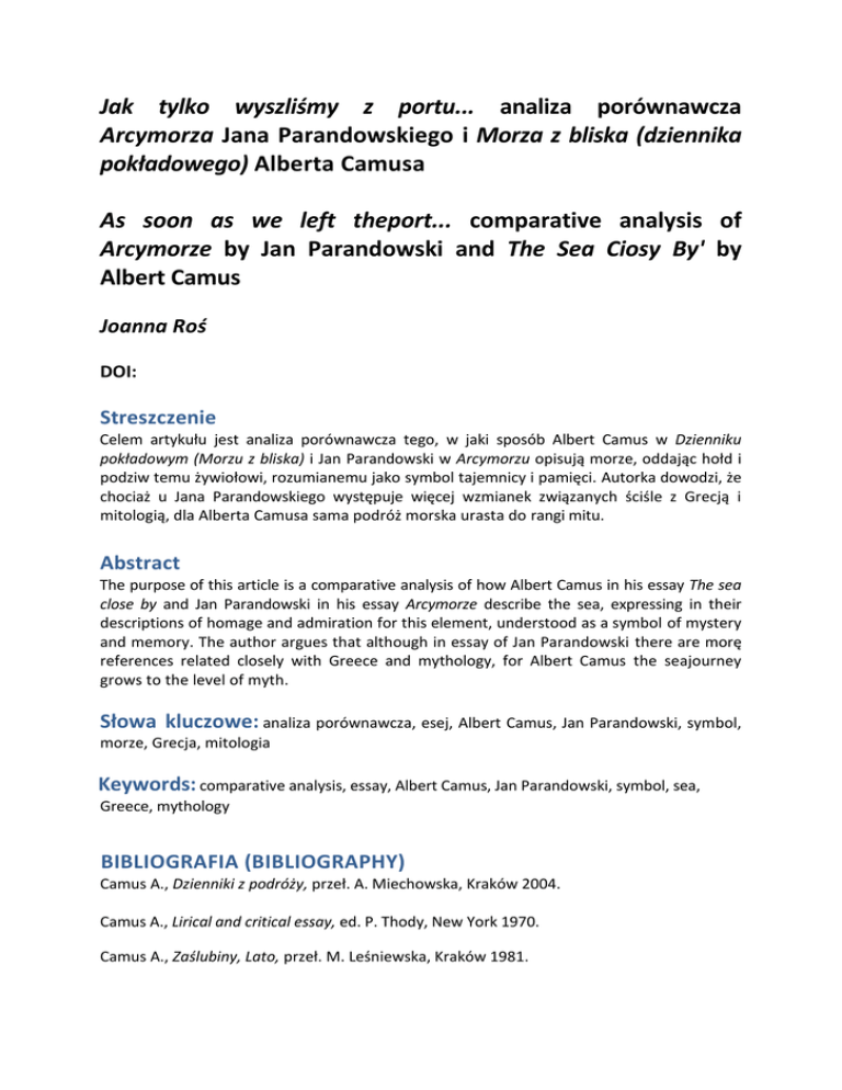 Jak tylko wyszliśmy z portu... analiza porównawcza Arcymorza Jana Parandowskiego i Morza z bliska (dziennika pokładowego) Alberta Camusa As soon as we left theport... comparative analysis of Arcymorze by Jan Parandowski and The Sea Ciosy By' by Albert Camus Joanna Roś DOI: Streszczenie Celem artykułu jest analiza porównawcza tego, w jaki sposób Albert Camus w Dzienniku pokładowym (Morzu z bliska) i Jan Parandowski w Arcymorzu opisują morze, oddając hołd i podziw temu żywiołowi, rozumianemu jako symbol tajemnicy i pamięci. Autorka dowodzi, że chociaż u Jana Parandowskiego występuje więcej wzmianek związanych ściśle z Grecją i mitologią, dla Alberta Camusa sama podróż morska urasta do rangi mitu. Abstract The purpose of this article is a comparative analysis of how Albert Camus in his essay The sea close by and Jan Parandowski in his essay Arcymorze describe the sea, expressing in their descriptions of homage and admiration for this element, understood as a symbol of mystery and memory. The author argues that although in essay of Jan Parandowski there are morę references related closely with Greece and mythology, for Albert Camus the seajourney grows to the level of myth. Słowa kluczowe: analiza porównawcza, esej, Albert Camus, Jan Parandowski, symbol, morze, Grecja, mitologia Keywords: comparative analysis, essay, Albert Camus, Jan Parandowski, symbol, sea, Greece, mythology BIBLIOGRAFIA (BIBLIOGRAPHY) Camus A., Dzienniki z podróży, przeł. A. Miechowska, Kraków 2004. Camus A., Lirical and critical essay, ed. P. Thody, New York 1970. Camus A., Zaślubiny, Lato, przeł. M. Leśniewska, Kraków 1981. Libera Z., Jan Parandowski - mistrz literackiego eseju, „Twórczość” 1994, nr 3. Parandowski J., Pisma wybrane, Warszawa 1955. Skwarnicki M., Kapłan i błazen, „Wprost” 2008, nr 46, http://www.wprost. pl/ar/12967/Kaplan-i-blazen/ [data dostępu: 15 listopada 2008]. Todd O., Albert Camus, Biografia, Warszawa 2009. Tomkowski J., Szept Mointaigne 'a. O eseistyce Jana Parandowskiego, „Nauka” 2013, nr 3. Żółciński T. J, Od antyku do współczesności (O eseistyce Jana Parandowskiego), „Więź” 1966, nr 9.