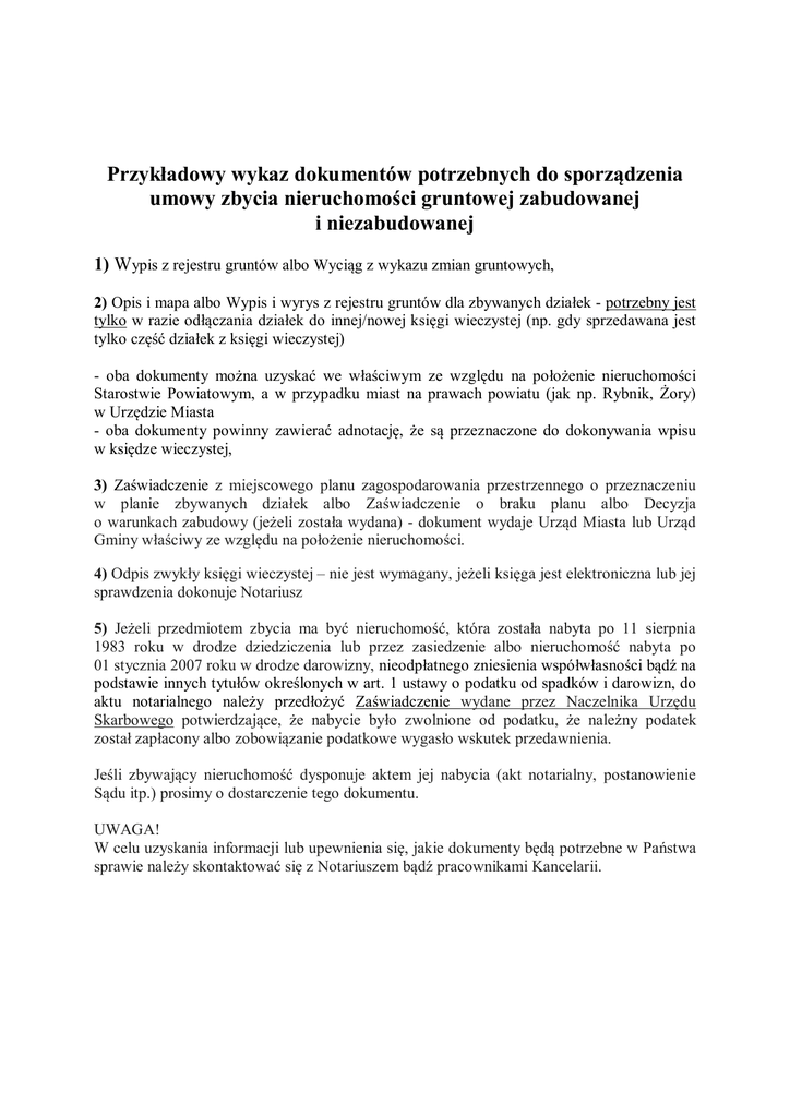 Przykładowy wykaz dokumentów potrzebnych do sporządzenia umowy zbycia nieruchomości gruntowej zabudowanej i niezabudowanej 1) Wypis z rejestru gruntów albo Wyciąg z wykazu zmian gruntowych, 2) Opis i mapa albo Wypis i wyrys z rejestru gruntów dla zbywanych działek - potrzebny jest tylko w razie odłączania działek do innej/nowej księgi wieczystej (np. gdy sprzedawana jest tylko część działek z księgi wieczystej) - oba dokumenty można uzyskać we właściwym ze względu na położenie nieruchomości Starostwie Powiatowym, a w przypadku miast na prawach powiatu (jak np. Rybnik, Żory) w Urzędzie Miasta - oba dokumenty powinny zawierać adnotację, że są przeznaczone do dokonywania wpisu w księdze wieczystej, 3) Zaświadczenie z miejscowego planu zagospodarowania przestrzennego o przeznaczeniu w planie zbywanych działek albo Zaświadczenie o braku planu albo Decyzja o warunkach zabudowy (jeżeli została wydana) - dokument wydaje Urząd Miasta lub Urząd Gminy właściwy ze względu na położenie nieruchomości. 4) Odpis zwykły księgi wieczystej – nie jest wymagany, jeżeli księga jest elektroniczna lub jej sprawdzenia dokonuje Notariusz 5) Jeżeli przedmiotem zbycia ma być nieruchomość, która została nabyta po 11 sierpnia 1983 roku w drodze dziedziczenia lub przez zasiedzenie albo nieruchomość nabyta po 01 stycznia 2007 roku w drodze darowizny, nieodpłatnego zniesienia współwłasności bądź na podstawie innych tytułów określonych w art. 1 ustawy o podatku od spadków i darowizn, do aktu notarialnego należy przedłożyć Zaświadczenie wydane przez Naczelnika Urzędu Skarbowego potwierdzające, że nabycie było zwolnione od podatku, że należny podatek został zapłacony albo zobowiązanie podatkowe wygasło wskutek przedawnienia. Jeśli zbywający nieruchomość dysponuje aktem jej nabycia (akt notarialny, postanowienie Sądu itp.) prosimy o dostarczenie tego dokumentu. UWAGA! W celu uzyskania informacji lub upewnienia się, jakie dokumenty będą potrzebne w Państwa sprawie należy skontaktować się z Notariuszem bądź pracownikami Kancelarii.