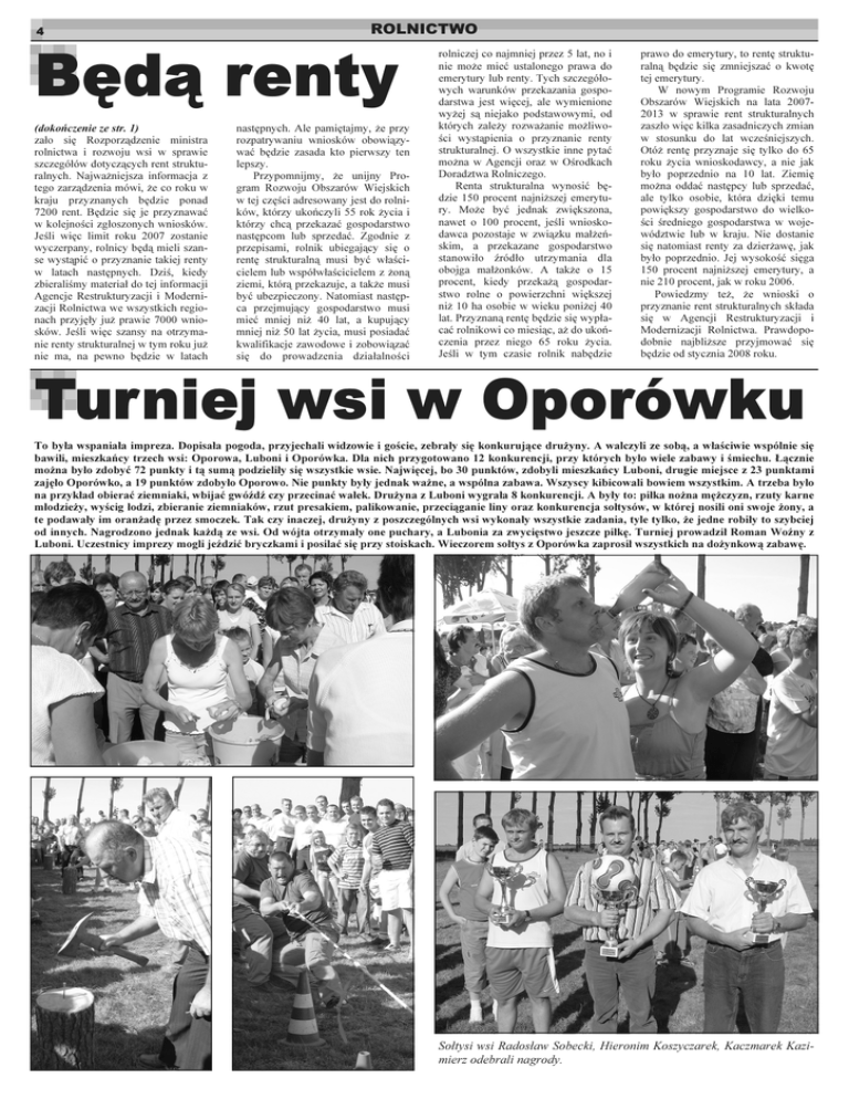 Będą renty 4 (dokończenie ze str. 1) zało się Rozporządzenie ministra rolnictwa i rozwoju wsi w sprawie szczegółów dotyczących rent strukturalnych. Najważniejsza informacja z tego zarządzenia mówi, że co roku w kraju przyznanych będzie ponad 7200 rent. Będzie się je przyznawać w kolejności zgłoszonych wniosków. Jeśli więc limit roku 2007 zostanie wyczerpany, rolnicy będą mieli szanse wystąpić o przyznanie takiej renty w latach następnych. Dziś, kiedy zbieraliśmy materiał do tej informacji Agencje Restrukturyzacji i Modernizacji Rolnictwa we wszystkich regionach przyjęły już prawie 7000 wniosków. Jeśli więc szansy na otrzymanie renty strukturalnej w tym roku już nie ma, na pewno będzie w latach ROLNICTWO następnych. Ale pamiętajmy, że przy rozpatrywaniu wniosków obowiązywać będzie zasada kto pierwszy ten lepszy. Przypomnijmy, że unijny Program Rozwoju Obszarów Wiejskich w tej części adresowany jest do rolników, którzy ukończyli 55 rok życia i którzy chcą przekazać gospodarstwo następcom lub sprzedać. Zgodnie z przepisami, rolnik ubiegający się o rentę strukturalną musi być właścicielem lub współwłaścicielem z żoną ziemi, którą przekazuje, a także musi być ubezpieczony. Natomiast następca przejmujący gospodarstwo musi mieć mniej niż 40 lat, a kupujący mniej niż 50 lat życia, musi posiadać kwalifikacje zawodowe i zobowiązać się do prowadzenia działalności rolniczej co najmniej przez 5 lat, no i nie może mieć ustalonego prawa do emerytury lub renty. Tych szczegółowych warunków przekazania gospodarstwa jest więcej, ale wymienione wyżej są niejako podstawowymi, od których zależy rozważanie możliwości wystąpienia o przyznanie renty strukturalnej. O wszystkie inne pytać można w Agencji oraz w Ośrodkach Doradztwa Rolniczego. Renta strukturalna wynosić będzie 150 procent najniższej emerytury. Może być jednak zwiększona, nawet o 100 procent, jeśli wnioskodawca pozostaje w związku małżeńskim, a przekazane gospodarstwo stanowiło źródło utrzymania dla obojga małżonków. A także o 15 procent, kiedy przekażą gospodarstwo rolne o powierzchni większej niż 10 ha osobie w wieku poniżej 40 lat. Przyznaną rentę będzie się wypłacać rolnikowi co miesiąc, aż do ukończenia przez niego 65 roku życia. Jeśli w tym czasie rolnik nabędzie prawo do emerytury, to rentę strukturalną będzie się zmniejszać o kwotę tej emerytury. W nowym Programie Rozwoju Obszarów Wiejskich na lata 20072013 w sprawie rent strukturalnych zaszło więc kilka zasadniczych zmian w stosunku do lat wcześniejszych. Otóż rentę przyznaje się tylko do 65 roku życia wnioskodawcy, a nie jak było poprzednio na 10 lat. Ziemię można oddać następcy lub sprzedać, ale tylko osobie, która dzięki temu powiększy gospodarstwo do wielkości średniego gospodarstwa w województwie lub w kraju. Nie dostanie się natomiast renty za dzierżawę, jak było poprzednio. Jej wysokość sięga 150 procent najniższej emerytury, a nie 210 procent, jak w roku 2006. Powiedzmy też, że wnioski o przyznanie rent strukturalnych składa się w Agencji Restrukturyzacji i Modernizacji Rolnictwa. Prawdopodobnie najbliższe przyjmować się będzie od stycznia 2008 roku. Turniej wsi w Oporówku To była wspaniała impreza. Dopisała pogoda, przyjechali widzowie i goście, zebrały się konkurujące drużyny. A walczyli ze sobą, a właściwie wspólnie się bawili, mieszkańcy trzech wsi: Oporowa, Luboni i Oporówka. Dla nich przygotowano 12 konkurencji, przy których było wiele zabawy i śmiechu. Łącznie można było zdobyć 72 punkty i tą sumą podzieliły się wszystkie wsie. Najwięcej, bo 30 punktów, zdobyli mieszkańcy Luboni, drugie miejsce z 23 punktami zajęło Oporówko, a 19 punktów zdobyło Oporowo. Nie punkty były jednak ważne, a wspólna zabawa. Wszyscy kibicowali bowiem wszystkim. A trzeba było na przykład obierać ziemniaki, wbijać gwóźdź czy przecinać wałek. Drużyna z Luboni wygrała 8 konkurencji. A były to: piłka nożna mężczyzn, rzuty karne młodzieży, wyścig łodzi, zbieranie ziemniaków, rzut presakiem, palikowanie, przeciąganie liny oraz konkurencja sołtysów, w której nosili oni swoje żony, a te podawały im oranżadę przez smoczek. Tak czy inaczej, drużyny z poszczególnych wsi wykonały wszystkie zadania, tyle tylko, że jedne robiły to szybciej od innych. Nagrodzono jednak każdą ze wsi. Od wójta otrzymały one puchary, a Lubonia za zwycięstwo jeszcze piłkę. Turniej prowadził Roman Woźny z Luboni. Uczestnicy imprezy mogli jeździć bryczkami i posilać się przy stoiskach. Wieczorem sołtys z Oporówka zaprosił wszystkich na dożynkową zabawę. Sołtysi wsi Radosław Sobecki, Hieronim Koszyczarek, Kaczmarek Kazimierz odebrali nagrody.