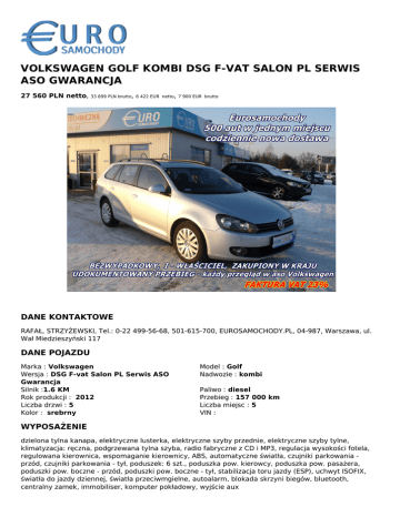 VOLKSWAGEN GOLF KOMBI DSG F-VAT SALON PL SERWIS ASO GWARANCJA 27 560 PLN netto, 33 899 PLN brutto, 6 422 EUR netto, 7 900 EUR brutto DANE KONTAKTOWE RAFAŁ, STRZYŻEWSKI, Tel.: 0-22 499-56-68, 501-615-700, EUROSAMOCHODY.PL, 04-987, Warszawa, ul. Wał Miedzieszyński 117 DANE POJAZDU Marka : Volkswagen Wersja : DSG F-vat Salon PL Serwis ASO Gwarancja Silnik :1.6 KM Rok produkcji : 2012 Liczba drzwi : 5 Kolor : srebrny Model : Golf Nadwozie : kombi Paliwo : diesel Przebieg : 157 000 km Liczba miejsc : 5 VIN : WYPOSAŻENIE dzielona tylna kanapa, elektryczne lusterka, elektryczne szyby przednie, elektryczne szyby tylne, klimatyzacja: ręczna, podgrzewana tylna szyba, radio fabryczne z CD i MP3, regulacja wysokości fotela, regulowana kierownica, wspomaganie kierownicy, ABS, automatyczne światła, czujniki parkowania przód, czujniki parkowania - tył, poduszek: 6 szt., poduszka pow. kierowcy, poduszka pow. pasażera, poduszki pow. boczne - przód, poduszki pow. boczne - tył, stabilizacja toru jazdy (ESP), uchwyt ISOFIX, światła do jazdy dziennej, światła przeciwmgielne, autoalarm, blokada skrzyni biegów, bluetooth, centralny zamek, immobiliser, komputer pokładowy, wyjście aux WYPOSAŻENIE DODATKOWE bezwypadkowy, gwarancja, książka serwisowa, możliwa zamiana, serwisowany w ASO, stan bardzo dobry, właściciel niepalący OPIS POJAZDU Salon Polska WITAMY W NAJWIĘKSZYM W POLSCE SALONIE SAMOCHODÓW UŻYWANYCH SUPER PROMOCJA GWARANCJA TECHNICZNA NA 12 MIESIĘCY lub KOMPLET OPON ZIMOWYCH lub LETNICH GRATIS*(do wyczerpania zapasów, możliwość rozszerzenia gwarancji do 36 miesięcy) - 500 AUT Z GWARANCJĄ w jednym miejscu / różne marki , modele , wersje wyposażenia/ - 8 dni na zamianę auta - Sprawdzone pochodzenie pojazdów - bezwypadkowe - Gwarancja przebiegu - Gwarancja pełnej historii serwisowej - Samochody od I właściciela - dla klientów zamiejscowych rezerwacja auta do czasu przyjazdu - udzielamy 12-miesięcznej gwarancji technicznej, możliwość przedłużenia do 36-miesięcy /bez limitu kilometrów, ważna na terenie całej Polski + assistance- darmowe holowanie , potwierdzenie certyfikatem / Kupującemu oferujemy: 1. Jazdę próbną 2. Bezpłatny przegląd przedsprzedażowy obejmujący: - kontrolę amortyzatorów - hamulców - podwozia samochodu - pomiar geometrii - diagnoza komputerowa - pomiar grubości powłoki lakierniczej - możliwość sprawdzenia przed zakupem w serwisie lub stacji diagnostycznej lub za pośrednictwem niezależnego rzeczoznawcy na zlecenie kupującego /dla klientów zamiejscowych bez konieczności przyjazdu/. - wszystkie nasze samochody posiadają komplet dokumentów wymaganych do zarejestrowania bądź przerejestrowania samochodu - przyjmujemy auta w rozliczeniu oraz kupujemy /bez ograniczeń wiekowych/ - Zajmujemy się sprzedażą detaliczną oraz hurtową / zapraszamy do współpracy osoby prywatne, firmy również z branży i instytucje / -Kupujący otrzymuje fakturę VAT 23% /nie ponosi opłaty PCC w wysokości 2%/ -kredyt 0% wpłaty własnej,raty dopasowane do własnych potrzeb -leasing bez zaświadczeń ,również dla widniejących w BIK szybka obsługa na miejscu "Niniejsze ogłoszenia są wyłącznie informacją handlową i nie stanowią oferty w myśl art. 66, § 1. Kodeksu Cywilnego. Sprzedający nie odpowiada za ewentualne błędy lub nieaktualność ogłoszenia." Zapis ten został zamieszczony ze względu na możliwość niezamierzonych pomyłek. Jeżeli zauważysz nieścisłość napisz do nas. Szukasz pewnego używanego auta ? Tylko u nas sprawdzone samochody z polskich salonów To nie komis to salon aut używanych z wieloletnim doświadczeniem Więcej informacji na eurosamochody . pl ZADZWOŃ TERAZ!!! Rafał 501 615 700 Tomasz 512 345 150 Marcin 505 416 300 Piotr 501 087 038 Mariusz 500 130 727 QR CODE DLA OGŁOSZENIA Powered by TCPDF (www.tcpdf.org)