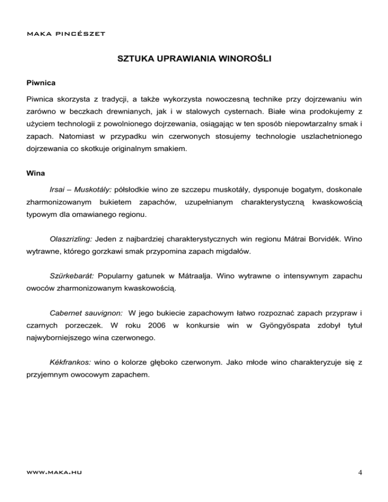 MAKA PINCÉSZET SZTUKA UPRAWIANIA WINOROŚLI Piwnica Piwnica skorzysta z tradycji, a także wykorzysta nowoczesną technike przy dojrzewaniu win zarówno w beczkach drewnianych, jak i w stalowych cysternach. Białe wina prodokujemy z użyciem technologii z powolnionego dojrzewania, osiągając w ten sposób niepowtarzalny smak i zapach. Natomiast w przypadku win czerwonych stosujemy technologie uszlachetnionego dojrzewania co skotkuje originalnym smakiem. Wina Irsai – Muskotály: półsłodkie wino ze szczepu muskotály, dysponuje bogatym, doskonale zharmonizowanym bukietem zapachów, uzupełnianym charakterystyczną kwaskowością typowym dla omawianego regionu. Olaszrizling: Jeden z najbardziej charakterystycznych win regionu Mátrai Borvidék. Wino wytrawne, którego gorzkawi smak przypomina zapach migdałów. Szürkebarát: Popularny gatunek w Mátraalja. Wino wytrawne o intensywnym zapachu owoców zharmonizowanym kwaskowością. Cabernet sauvignon: W jego bukiecie zapachowym łatwo rozpoznać zapach przypraw i czarnych porzeczek. W roku 2006 w konkursie win w Gyöngyöspata zdobył tytuł najwyborniejszego wina czerwonego. Kékfrankos: wino o kolorze głęboko czerwonym. Jako młode wino charakteryzuje się z przyjemnym owocowym zapachem. www.maka.hu 4