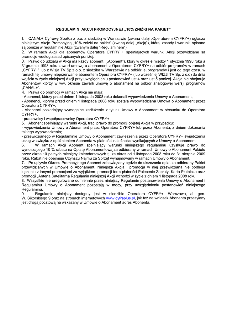 REGULAMIN AKCJI PROMOCYJNEJ „10% ZNIŻKI NA PAKIET” 1. CANAL+ Cyfrowy Spółka z o.o. z siedzibą w Warszawie (zwana dalej „Operatorem CYFRY+) ogłasza niniejszym Akcję Promocyjną „10% zniżki na pakiet” (zwaną dalej „Akcją”), której zasady i warunki opisane są poniżej w regulaminie Akcji (zwanym dalej "Regulaminem"). 2. W ramach Akcji dla abonentów Operatora CYFRY + spełniających warunki Akcji przewidziane są promocje według zasad opisanych poniżej. 3. Prawo do udziału w Akcji ma każdy abonent („Abonent”), który w okresie między 1 stycznia 1998 roku a 31grudnia 1998 roku zawarł umowę o abonament z Operatorem CYFRY+ na odbiór programów w ramach „CYFRY+” lub z Wizją TV Sp.z o.o. z siedzibą w Warszawie na odbiór jej programów i jest od tego czasu w ramach tej umowy nieprzerwanie abonentem Operatora CYFRY+ (lub wcześniej WIZJI TV Sp. z o.o) do dnia wejścia w życie niniejszej Akcji przy uwzględnieniu postanowień ust.4 oraz ust.5 poniżej. Akcja nie obejmuje Abonentów którzy w ww. okresie zawarli umowę o abonament na odbiór analogowej wersji programów „CANAL+”. 4. Prawa do promocji w ramach Akcji nie mają: - Abonenci, którzy przed dniem 1 listopada 2008 roku dokonali wypowiedzenia Umowy o Abonament, - Abonenci, którym przed dniem 1 listopada 2008 roku została wypowiedziana Umowa o Abonament przez Operatora CYFRY+, - Abonenci posiadający wymagalne zadłużenie z tytułu Umowy o Abonament w stosunku do Operatora CYFRY+, - pracownicy i współpracownicy Operatora CYFRY+. 5. Abonent spełniający warunki Akcji, traci prawo do promocji objętej Akcją w przypadku: - wypowiedzenia Umowy o Abonament przez Operatora CYFRY+ lub przez Abonenta, z dniem dokonania takiego wypowiedzenia; - przewidzianego w Regulaminie Umowy o Abonament zawieszenia przez Operatora CYFRY+ świadczenia usług w związku z opóźnieniem Abonenta w płatności należności wynikających z Umowy o Abonament. 6. W ramach Akcji Abonent spełniający warunki niniejszego regulaminu uzyskuje prawo do wynoszącego 10 % rabatu na Opłatę Abonamentową za odbierany w ramach Umowy o Abonament Pakietu przez okres 10 pełnych miesięcy kalendarzowych tj. za okres od 1 listopada 2008 roku do 31 sierpnia 2009 roku. Rabat nie obejmuje Czynszu Najmu za Sprzęt wynajmowany w ramach Umowy o Abonament. 7. Po upływie Okresu Promocyjnego Abonent zobowiązany będzie do uiszczania opłat za odbierany Pakiet przewidzianych w Umowie o Abonament. Niniejsza Akcja i promocja w niej przewidziana nie podlega łączeniu z innymi promocjami za wyjątkiem promocji form płatności Polecenie Zapłaty, Karta Płatnicza oraz promocji „Antena Satelitarna Regulamin niniejszej Akcji wchodzi w życie z dniem 1 listopada 2008 roku. 8. Wszystkie nie uregulowane odmiennie przez niniejszy Regulamin postanowienia Umowy o Abonament i Regulaminu Umowy o Abonament pozostają w mocy, przy uwzględnieniu postanowień niniejszego Regulaminu. 9. Regulamin niniejszy dostępny jest w siedzibie Operatora CYFRY+: Warszawa, al. gen. W. Sikorskiego 9 oraz na stronach internetowych www.cyfraplus.pl, jak też na wniosek Abonenta przesyłany jest drogą pocztową na wskazany w Umowie o Abonament adres Abonenta.