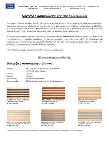 OPPOLD POLSKA Sp. z o.o. - ul. Niemodlińska 19/16 - PL 45-710 Opole - Tel: +48(0)77-4570101 - Fax: +48(0)77-4514230 www.oppold.pl e-mail: [email protected] [email protected] Obrzeża z naturalnego drewna i aluminium Oferujemy Państwu wysokiej jakości efektowne listwy obrzeżowe z różnych rodzajów drewna naturalnego i aluminium. Asortyment obejmuje obrzeża fornirowe, wielowarstwowe z jednego rodzaju drewna, Multiplex tj. z różnych gatunków drewna, Materialmix tj. drewno w połączeniu z aluminium czy warstwą substancji nieorganicznej. Listwy drewniane można bejcować na wybrany kolor i lakierować. W swojej ofercie mamy również prawdziwe, masywne obrzeża aluminiowe, różnych typów – od matowych, szczotkowanych, z wysokim połyskiem, po obrzeża imitujące stal szlachetną. Obrzeża aluminiowe do zastosowania w meblarstwie, np. do blatów kuchennych czy jako ramka przy frontach meblowych jak i przy produkcji skrzydeł drzwiowych jako ozdobne wstawki. Pełny katalog obrzeży na zapytanie lub ze strony www.oppold.pl Wybrane przykłady obrzeży: Obrzeża z naturalnego drewna Rodzaje Grubość: Długość: Powierzchnia: Ilość minimalna: MULTIPLEX (wszystkie warstwy wzdłużne) ALUPLEX (różne odmiany) 2,65 mm 4000 mm szlifowana i kalibrowana 110 mb każdego typu, mniejsze ilości na zapytanie MULTIPLEX KLON / WENGE szerokość do 105 mm Nr: MP 122 025 ALUPLEX KLON 4 X 3 MM ALU szerokości 40, 61, 83, 105 mm Nr: MM 250 025 MULTIPLEX MAHOŃ / KLON szerokość do 105 mm Nr: MP 125 040 ALUPLEX BUK 5 X 2 MM ALU szerokość 43 mm Nr: MM 150 031 MULTIPLEX BUK / KLON szerokość do 105 mm Nr: MP 107 099 ALUPLEX KLON 4 X 2 MM ALU szerokość 23 mm Nr: MM 060 025 Z powodów technicznych nie możemy zagwarantować, że prezentowane na tej stronie kolory będą identyczne z kolorami fabrycznymi. OPPOLD POLSKA Sp. z o.o. - ul. Niemodlińska 19/16 - PL 45-710 Opole - Tel: +48(0)77-4570101 - Fax: +48(0)77-4514230 www.oppold.pl e-mail: [email protected] [email protected] ALUPLEX WENGE 5, 8, 11, 14 X 3 MM ALU szerokości 40, 61, 83, 105 mm Nr: MM 160 022 ALUPLEX ORZECH 4, 5, 8 X 2 MM ALU szerokości 35, 42, 63 mm Nr: MM 505 002 ALUPLEX WENGE 6, 11, 15, 19 X 0,47 MM ALU szerokości 43, 65, 83, 103 mm Nr: MM 400 022 ALUPLEX WIŚNIA 2 X 2 MM ALU szerokość 40 mm Nr: MM 500 019 ALUPLEX MAHOŃ 3 X 2 MM ALU szerokość 33 mm Nr: MM 501 040 ALUPLEX DĄB 4 X 2 MM ALU szerokość 43 mm Nr: MM 502 050 ALUPLEX MAHOŃ 3 X 1 MM ALU szerokość 43 mm Nr: mm 506 040 ALUPLEX ORZECH 3 X 1 MM ALU szerokości 43, 62 mm Nr: MM 507 002 MULTIPLEX BRZOZA Substancja mineralna - biała szerokości 33, 43 mm Nr: MM 040 504 Obrzeża aluminiowe Rodzaje materiału: • • • • AL. 01, Millfinish matowy AL. 02, AluNox, szczotkowane AL. 04, wysoki połysk AL. 07, Alu Brush, szczotkowane • szerokości standardowe: 22 mm, 23 mm, 28 mm, 33 mm, 42 mm, 63 mm, 85 mm, 105 mm inne szerokości i grubości na zapytanie • • • • • • • grubość: 1,0 mm grubość: 1,0 mm grubość: 1,0 mm grubość: 1,0 mm twardość Brinella HB 48 twardość wg DIN 1/2 twardość H14 tylnia strona obrzeża - szlifowana - ze specjalnym podkładem zwiększającym przyczepność podczas klejenia od strony głównej obrzeże pokryte jest folią ochronna PE dostępne w rolach do przyklejania obrzeża poleca się stosowanie kleju poliuretanowego