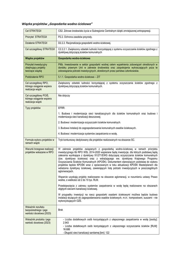 Wiązka projektów „Gospodarka wodno-ściekowa” Cel STRATEGII CS2. Zdrowe środowisko życia w Subregionie Centralnym dzięki zmniejszonej antropopresji. Priorytet STRATEGII P2.2. Ochrona zasobów przyrody. Działanie STRATEGII D2.2.2. Racjonalizacja gospodarki wodno-ściekowej. Cel szczegółowy STRATEGII C2.2.2.1. Zwiększony odsetek ludności korzystającej z systemu oczyszczania ścieków zgodnego z dyrektywą dotyczącą ścieków komunalnych Wiązka projektów Gospodarka wodno-ściekowa Priorytet inwestycyjny obejmujący projekty tworzące wiązkę PI6b. Inwestowanie w sektor gospodarki wodnej celem wypełnienia zobowiązań określonych w dorobku prawnym Unii w zakresie środowiska oraz zaspokojenia wykraczających poza te zobowiązania potrzeb inwestycyjnych, określonych przez państwa członkowskie. Poddziałanie RPO 5.1.1. Gospodarka wodno-ściekowa – ZIT Cel szczegółowy RPO, którego osiąganie wspiera realizacja wiązki Zwiększony odsetek ludności korzystającej z systemu oczyszczania ścieków zgodnego z dyrektywą dotyczącą ścieków komunalnych. Cel szczegółowy POIŚ, którego osiąganie wspiera realizacja wiązki Nie dotyczy Typy projektów EFRR: 1. Budowa i modernizacja sieci kanalizacyjnych dla ścieków komunalnych oraz budowa i modernizacja sieci kanalizacji deszczowej. 2. Budowa i modernizacja oczyszczalni ścieków komunalnych. 3. Budowa instalacji do zagospodarowania komunalnych osadów ściekowych. 4. Budowa i modernizacja systemów zaopatrzenia w wodę. Formuła wyboru projektów w ramach wiązki Tryb konkursowy dedykowany dla projektów realizowanych na obszarze SC. Warunki brzegowe realizacji projektów wskazane w RPO W zakresie projektów związanych z gospodarką wodno-ściekową w ramach priorytetu inwestycyjnego 6b RPO WSL 2014-2020 wspierane będą inwestycje, dla których podstawą będą zalecenia wynikające z dyrektywy 91/271/EWG dotyczącej oczyszczania ścieków komunalnych (tzw. dyrektywa ściekowa) oraz z wdrażającego ww. dyrektywę Krajowego Programu Oczyszczania Ścieków Komunalnych (KPOŚK). Dokumentem stanowiącym podstawę do wyboru projektów będzie KPOŚK wraz z opracowanym w toku aktualizacji KPOŚK Masterplanem dla wdrażania dyrektywy ściekowej, zawierającym listę potrzeb inwestycyjnych w poszczególnych aglomeracjach. Wsparcie uzyskają projekty realizowane na obszarze aglomeracji, w rozumieniu ustawy Prawo wodne, o wielkości od 2 do 10 tys. RLM. Przedsięwzięcia z zakresu systemów zaopatrzenia w wodę będą realizowane na obszarach objętych sieciami kanalizacji ściekowej. W przypadku inwestycji na rzecz gospodarki osadami ściekowymi możliwa będzie budowa instalacji służących do zagospodarowania osadów ściekowych, m.in.: kompostowni, suszarni - nie wykorzystujących OZE. Wskaźnik rezultatu bezpośredniego i jego wartości docelowa (2023) Wskaźnik produktu i jego wartość docelowa (2023) Brak - Liczba dodatkowych osób korzystających z ulepszonego zaopatrzenia w wodę [osoby]: 2.943 - Liczba dodatkowych osób korzystających z ulepszonego oczyszczania ścieków [RLM]: 16.686 - Długość sieci kanalizacji sanitarnej [km]: 122 Mechanizm wdrażania instrumentów finansowych Przesłanki wyboru kryteriów oceny zgodności ze strategią w ramach wiązki - Długość wybudowanej sieci kanalizacji sanitarnej [km]: 74 - Długość przebudowanej sieci kanalizacji sanitarnej [km]: 42 - Długość wyremontowanej sieci kanalizacji sanitarnej [km]: 6 - Długość sieci wodociągowej [km]: 7 - Długość wybudowanej sieci wodociągowej [km]: 6 - Długość przebudowanej sieci wodociągowej [km]: 0,5 - Długość wyremontowanej sieci wodociągowej [km]: 0,5 - Liczba wspartych stacji uzdatniania wody [szt.]: 2 - Liczba przedsiębiorstw otrzymujących wsparcie [szt.]: 1 - Liczba przedsiębiorstw otrzymujących dotacje [szt.]: 1 - Liczba wspartych oczyszczalni ścieków komunalnych [szt.]: 3 - Liczba wybudowanych oczyszczalni ścieków komunalnych [szt.]: 1 - Liczba przebudowanych oczyszczalni ścieków komunalnych [szt.]: 1 - Liczba wyremontowanych oczyszczalni ścieków komunalnych [szt.]: 1 Nie dotyczy Nie wyznaczono