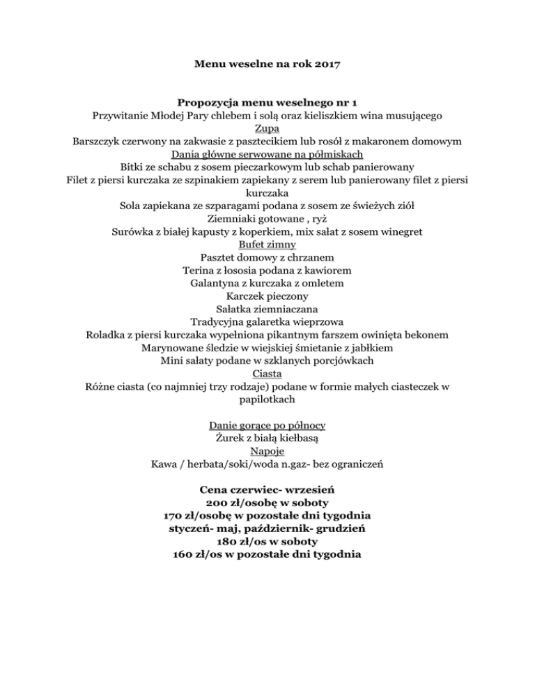 Menu weselne na rok 2017 Propozycja menu weselnego nr 1 Przywitanie Młodej Pary chlebem i solą oraz kieliszkiem wina musującego Zupa Barszczyk czerwony na zakwasie z pasztecikiem lub rosół z makaronem domowym Dania główne serwowane na półmiskach Bitki ze schabu z sosem pieczarkowym lub schab panierowany Filet z piersi kurczaka ze szpinakiem zapiekany z serem lub panierowany filet z piersi kurczaka Sola zapiekana ze szparagami podana z sosem ze świeżych ziół Ziemniaki gotowane , ryż Surówka z białej kapusty z koperkiem, mix sałat z sosem winegret Bufet zimny Pasztet domowy z chrzanem Terina z łososia podana z kawiorem Galantyna z kurczaka z omletem Karczek pieczony Sałatka ziemniaczana Tradycyjna galaretka wieprzowa Roladka z piersi kurczaka wypełniona pikantnym farszem owinięta bekonem Marynowane śledzie w wiejskiej śmietanie z jabłkiem Mini sałaty podane w szklanych porcjówkach Ciasta Różne ciasta (co najmniej trzy rodzaje) podane w formie małych ciasteczek w papilotkach Danie gorące po północy Żurek z białą kiełbasą Napoje Kawa / herbata/soki/woda n.gaz- bez ograniczeń Cena czerwiec- wrzesień 200 zł/osobę w soboty 170 zł/osobę w pozostałe dni tygodnia styczeń- maj, październik- grudzień 180 zł/os w soboty 160 zł/os w pozostałe dni tygodnia Propozycja menu weselnego nr 2 Przywitanie Młodej Pary chlebem i solą oraz kieliszkiem wina musującego Przystawka Wątróbka drobiowa zapiekana w bekonie podana na grzance lub vol-au-vent z nadzieniem z sera pleśniowego i orzechów włoskich Zupa Rosół z kołdunami lub zupa porowo- ziemniaczana z łososiem i łezką śmietany Dania główne serwowane na półmiskach Polędwiczka wieprzowa w sosie demi glace lub zraziki z karkówki w sosie własnym Pierś z kurczaka zapiekana z bakłażanem i cukinią i serem chedar lub filet z piersi indyka z suszonymi pomidorami i mozzarellą Łosoś w sosie porowym lub sandacz w sosie rakowym Ziemniaki gotowane , ziemniaki opiekane, ryż Mix sałat z sosem winegret, buraczki na ciepło, brokuł Deser Panna cotta z sosem malinowym lub musem truskawkowym Bufet zimny Pasztet z dziczyzny z żurawiną Półmiski mięs pieczonych podane w formie różnorodnych roladek Rolada z pieczonego kurczaka podana w delikatnej warzywnej galaretce Rostbeef pieczony na różowo oprószony kolorowym pieprzem i ziołami Mini sałaty w szklanych porcjówkach Tymbaliki z łososia Gravlax z łososia Ciasta Różne ciasta podane w formie małych ciasteczek w papilotkach Danie gorące po północy Węgierska zupa gulaszowa Napoje Kawa / herbata/ soki/woda n.gaz- bez ograniczeń Cena czerwiec- wrzesień 245 zł/osobę w soboty 210 zł/osobę w pozostałe dni tygodnia styczeń- maj, październik- grudzień 220 zł/os w soboty 200 zł/os w pozostałe dni tygodnia Propozycja menu weselnego nr 3 Tort weselny i stół wiejski w prezencie!!! Przywitanie Młodej Pary chlebem i solą oraz kieliszkiem oryginalnego francuskiego champagne Przystawka Mus z łososia podany na grzance z bazyliowym pesto lub roladka z polędwiczki z bakaliami owinięta bekonem Zupa borowikowa lub krem ze szparagów z grzankami Dania główne serwowane na półmiskach Roladka z polędwiczki z szynką dojrzewającą w sosie z sera pleśniowego lub tradycyjne zraziki wołowe lub zraziki wołowe z wiśniami Filet z kaczki z gorącymi wiśniami i rozmarynem lub pieczone udko z kaczki marynowane w miodzie i winie Ziemniaki opiekane, ryż, kasza Mix sałat z sosem winegret, bukiet warzyw blanszowanych Deser Mus z belgijskiej czekolady z sosem malinowym Bufet zimny Rostbef pieczony na różowo podany z sosem z oliwy i świeżych ziół Vitello Tonnato- duszona cielęcina podana z sosem z anchovies Tatar z tuńczyka Carpacio z łososia Deski rozmaitych serów włoskich i francuskich Półmisek hiszpańskich i włoskich wędlin dojrzewających Pieczona i wędzona dziczyzna z sosem śliwkowym Bufet sałatkowy (składniki sałat do samodzielnej kompozycji) Bufet słodki różnorodne ciasta i torciki w papilotkach podane na paterze Fontanna czekoladowa Danie gorące podane po północy Pierogi z dziczyzną z sosem kurkowym Consome wołowe Napoje Kawa / herbata soki/woda n.gaz- bez ograniczeń czerwiec- wrzesień 345 zł/osobę w soboty 310 zł/osobę w pozostałe dni tygodnia styczeń- maj, październik- grudzień 295 zł/os w soboty 280 zł/os w pozostałe dni tygodnia Cennik napojów i alkoholi Wódka czysta Żołądkowa de luxe but 0,5l 35 zł Wino domu Ucenda Bodegas del Rosario (hiszpańskie, wytrawne, białe i czerwone) karafka 0,5l- 19 zł lub but 0,75l- 39 zł Pakiet zimnych napojów (napoje gazowane w butelkach szklanych 0,2/0,25l) 10 zł/os Piwo keg 30l 300 zł Rabaty i dopłaty Dzieci do lat 3 bezpłatnie 4-10 rabat 50% Ilość gości mniejsza niż 80 osób 60-79 osób dopłata 1500 zł 40-59 osób dopłata 2500 zł do 39 osób dopłata 3500 zł Zimne przekąski podawane na stoły zamiast zimnego bufetu Dopłata 10 zł/os Opcje dodatkowe Tort weselny- smak i forma do uzgodnienia- od 65 zł/kg Stylizowany stolik wiejski w formie oddzielnego bufetu (min 8 kg produktów)- od 800 zł Dzik pieczony- od 900 zł Prosiak pieczony- od 500 zł Łosoś lub szczupak pieczony w całości- od 350 zł