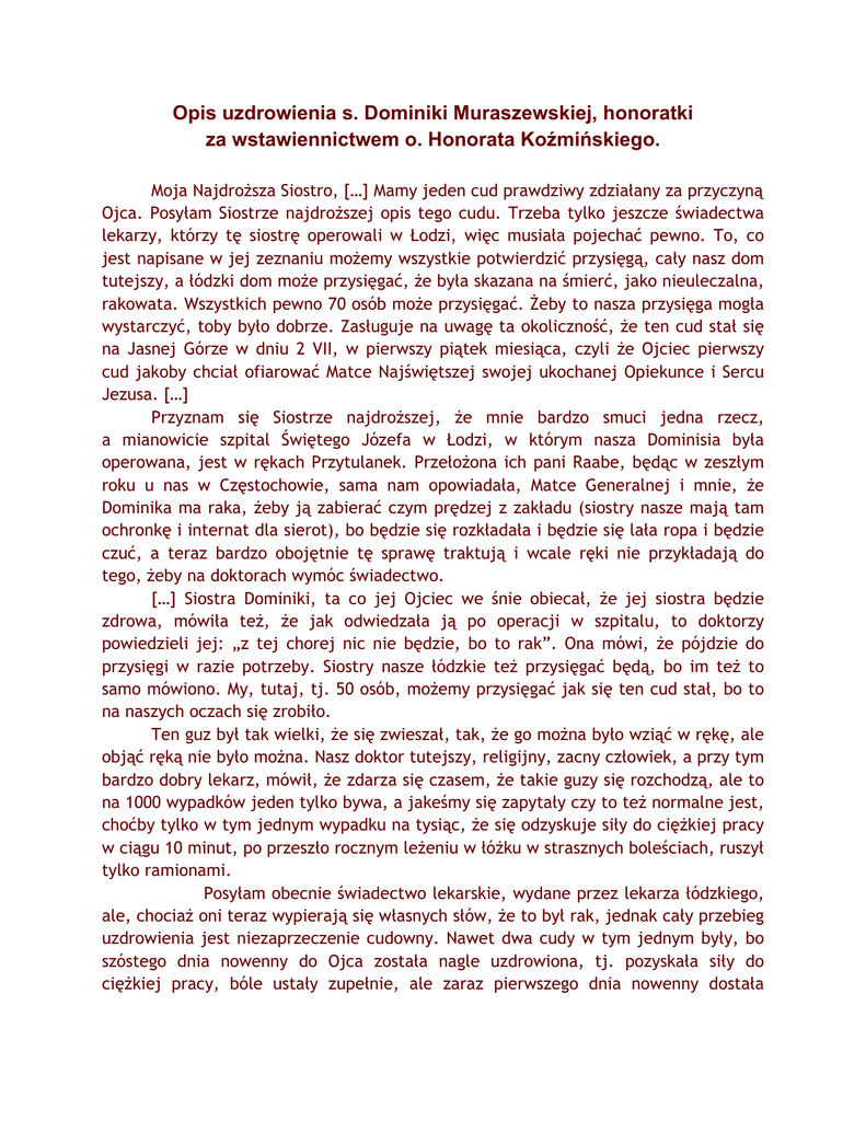 Opis uzdrowienia s. Dominiki Muraszewskiej, honoratki za wstawiennictwem o. Honorata Koźmińskiego. Moja Najdroższa Siostro, […] Mamy jeden cud prawdziwy zdziałany za przyczyną Ojca. Posyłam Siostrze najdroższej opis tego cudu. Trzeba tylko jeszcze świadectwa lekarzy, którzy tę siostrę operowali w Łodzi, więc musiała pojechać pewno. To, co jest napisane w jej zeznaniu możemy wszystkie potwierdzić przysięgą, cały nasz dom tutejszy, a łódzki dom może przysięgać, że była skazana na śmierć, jako nieuleczalna, rakowata. Wszystkich pewno 70 osób może przysięgać. Żeby to nasza przysięga mogła wystarczyć, toby było dobrze. Zasługuje na uwagę ta okoliczność, że ten cud stał się na Jasnej Górze w dniu 2 VII, w pierwszy piątek miesiąca, czyli że Ojciec pierwszy cud jakoby chciał ofiarować Matce Najświętszej swojej ukochanej Opiekunce i Sercu Jezusa. […] Przyznam się Siostrze najdroższej, że mnie bardzo smuci jedna rzecz, a mianowicie szpital Świętego Józefa w Łodzi, w którym nasza Dominisia była operowana, jest w rękach Przytulanek. Przełożona ich pani Raabe, będąc w zeszłym roku u nas w Częstochowie, sama nam opowiadała, Matce Generalnej i mnie, że Dominika ma raka, żeby ją zabierać czym prędzej z zakładu (siostry nasze mają tam ochronkę i internat dla sierot), bo będzie się rozkładała i będzie się lała ropa i będzie czuć, a teraz bardzo obojętnie tę sprawę traktują i wcale ręki nie przykładają do tego, żeby na doktorach wymóc świadectwo. […] Siostra Dominiki, ta co jej Ojciec we śnie obiecał, że jej siostra będzie zdrowa, mówiła też, że jak odwiedzała ją po operacji w szpitalu, to doktorzy powiedzieli jej: „z tej chorej nic nie będzie, bo to rak”. Ona mówi, że pójdzie do przysięgi w razie potrzeby. Siostry nasze łódzkie też przysięgać będą, bo im też to samo mówiono. My, tutaj, tj. 50 osób, możemy przysięgać jak się ten cud stał, bo to na naszych oczach się zrobiło. Ten guz był tak wielki, że się zwieszał, tak, że go można było wziąć w rękę, ale objąć ręką nie było można. Nasz doktor tutejszy, religijny, zacny człowiek, a przy tym bardzo dobry lekarz, mówił, że zdarza się czasem, że takie guzy się rozchodzą, ale to na 1000 wypadków jeden tylko bywa, a jakeśmy się zapytały czy to też normalne jest, choćby tylko w tym jednym wypadku na tysiąc, że się odzyskuje siły do ciężkiej pracy w ciągu 10 minut, po przeszło rocznym leżeniu w łóżku w strasznych boleściach, ruszył tylko ramionami. Posyłam obecnie świadectwo lekarskie, wydane przez lekarza łódzkiego, ale, chociaż oni teraz wypierają się własnych słów, że to był rak, jednak cały przebieg uzdrowienia jest niezaprzeczenie cudowny. Nawet dwa cudy w tym jednym były, bo szóstego dnia nowenny do Ojca została nagle uzdrowiona, tj. pozyskała siły do ciężkiej pracy, bóle ustały zupełnie, ale zaraz pierwszego dnia nowenny dostała takich boleści, że musiała na dwa dni pójść do łóżka, guz powiększał się tak, że aż zwieszał się, a ręką objąć go nie było można – trzeciego dnia wstała i znowu zabrała się do pracy, do której guz nie przeszkadzał, ale bóle miała do końca nowenny. Ale pielęgniarka jej zaczęła jej wymawiać jej niedowiarstwo i niewdzięczność i namówiła ją żeby się znowu do Ojca zwróciła. Posłuchała jej, przywiązała sobie znowu ten kawałeczek habitu i „Boże błogosław” Ojca, które jej dałam i zaczęła nowennę. Boleści ustały zaraz, a przy końcu nowenny guz znikł zupełnie, tak, że żaden doktor ani śladu jego dojrzeć nie może. […] Pan Jezus, jakby chciał zaznaczyć, że chce, aby się modlono przez Ojca przyczynę. Teraz już nikt jej nie przekona, szczególnie po tym śnie, który jej siostra miała, odprawia dziękczynne nowenny do Ojca. Zabrała się już do swego dawnego zajęcia w łódzkiej ochronce. […] Do naszych Sióstr w Łodzi przyszła parę tygodni po cudzie rodzona siostra naszej uzdrowionej i opowiadała Przełożonej i siostrom, że około uroczystości św. Piotra nie mogąc spać nad ranem, zaczęła odmawiać różaniec za swoją siostrę i płakała myśląc o niej, czy żyje jeszcze, czy umarła, i tak ze łzami zasnęła. Miała sen, że przyszedł do niej jakiś kapucyn, położył jej rękę na ramieniu i powiedział: „nie płacz, twoja siostra będzie zdrowa”. Nasza Przełożona (miejscowa) zapytała, jak wyglądał ten kapucyn? – odpowiedziała: stary, głowę miał gołą i brodę dość długą, siwą ale rzadką. Wtedy pokazała jej Przełożona Ojca fotografię a ona wyciągnęła ręce i zaczęła krzyczeć: „to ten, to ten”. Opis ten znajduje się w: List Anieli Róży Godeckiej do Elekty Stanisławy Muśnickiej, Częstochowa, 11 września 1926 r., rps, kopia w AZCz.