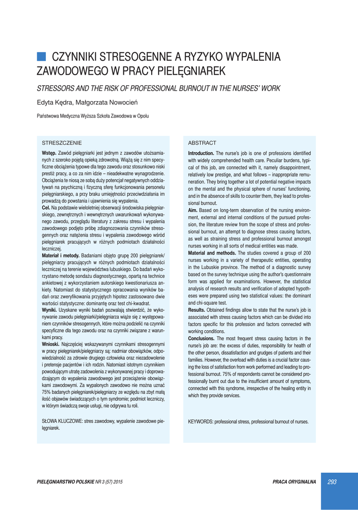 CZYNNIKI STRESOGENNE A RYZYKO WYPALENIA ZAWODOWEGO W PRACY PIELĘGNIAREK STRESSORS AND THE RISK OF PROFESSIONAL BURNOUT IN THE NURSES’ WORK Edyta Kędra, Małgorzata Nowocień Państwowa Medyczna Wyższa Szkoła Zawodowa w Opolu STRESZCZENIE ABSTRACT Wstęp. Zawód pielęgniarki jest jednym z zawodów utożsamianych z szeroko pojętą opieką zdrowotną. Wiążą się z nim specyficzne obciążenia typowe dla tego zawodu oraz stosunkowo niski prestiż pracy, a co za nim idzie – nieadekwatne wynagrodzenie. Obciążenia te niosą ze sobą duży potencjał negatywnych oddziaływań na psychiczną i fizyczną sferę funkcjonowania personelu pielęgniarskiego, a przy braku umiejętności przeciwdziałania im prowadzą do powstania i ujawnienia się wypalenia. Cel. Na podstawie wieloletniej obserwacji środowiska pielęgniarskiego, zewnętrznych i wewnętrznych uwarunkowań wykonywanego zawodu, przeglądu literatury z zakresu stresu i wypalenia zawodowego podjęto próbę zdiagnozowania czynników stresogennych oraz natężenia stresu i wypalenia zawodowego wśród pielęgniarek pracujących w różnych podmiotach działalności leczniczej. Materiał i metody. Badaniami objęto grupę 200 pielęgniarek/ pielęgniarzy pracujących w różnych podmiotach działalności leczniczej na terenie województwa lubuskiego. Do badań wykorzystano metodę sondażu diagnostycznego, opartą na technice ankietowej z wykorzystaniem autorskiego kwestionariusza ankiety. Natomiast do statystycznego opracowania wyników badań oraz zweryfikowania przyjętych hipotez zastosowano dwie wartości statystyczne: dominantę oraz test chi-kwadrat. Wyniki. Uzyskane wyniki badań pozwalają stwierdzić, że wykonywanie zawodu pielęgniarki/pielęgniarza wiąże się z występowaniem czynników stresogennych, które można podzielić na czynniki specyficzne dla tego zawodu oraz na czynniki związane z warunkami pracy. Wnioski. Najczęściej wskazywanymi czynnikami stresogennymi w pracy pielęgniarek/pielęgniarzy są: nadmiar obowiązków, odpowiedzialność za zdrowie drugiego człowieka oraz niezadowolenie i pretensje pacjentów i ich rodzin. Natomiast istotnym czynnikiem powodującym utratę zadowolenia z wykonywanej pracy i doprowadzającym do wypalenia zawodowego jest przeciążenie obowiązkami zawodowymi. Za wypalonych zawodowo nie można uznać 75% badanych pielęgniarek/pielęgniarzy ze względu na zbyt małą ilość objawów świadczących o tym syndromie; podmiot leczniczy, w którym świadczą swoje usługi, nie odgrywa tu roli. Introduction. The nurse’s job is one of professions identified with widely comprehended health care. Peculiar burdens, typical of this job, are connected with it, namely disappointment, relatively low prestige, and what follows – inappropriate remuneration. They bring together a lot of potential negative impacts on the mental and the physical sphere of nurses’ functioning, and in the absence of skills to counter them, they lead to professional burnout. Aim. Based on long-term observation of the nursing environment, external and internal conditions of the pursued profession, the literature review from the scope of stress and professional burnout, an attempt to diagnose stress causing factors, as well as straining stress and professional burnout amongst nurses working in all sorts of medical entities was made. Material and methods. The studies covered a group of 200 nurses working in a variety of therapeutic entities, operating in the Lubuskie province. The method of a diagnostic survey based on the survey technique using the author’s questionnaire form was applied for examinations. However, the statistical analysis of research results and verification of adopted hypotheses were prepared using two statistical values: the dominant and chi-square test. Results. Obtained findings allow to state that the nurse’s job is associated with stress causing factors which can be divided into factors specific for this profession and factors connected with working conditions. Conclusions. The most frequent stress causing factors in the nurse’s job are: the excess of duties, responsibility for health of the other person, dissatisfaction and grudges of patients and their families. However, the overload with duties is a crucial factor causing the loss of satisfaction from work performed and leading to professional burnout. 75% of respondents cannot be considered professionally burnt out due to the insufficient amount of symptoms, connected with this syndrome, irrespective of the healing entity in which they provide services. SŁOWA KLUCZOWE: stres zawodowy, wypalenie zawodowe pielęgniarek. KEYWORDS: professional stress, professional burnout of nurses. PIELĘGNIARSTWO POLSKIE NR 3 (57) 2015 PRACA ORYGINALNA 293 Wprowadzenie Współczesne pielęgniarstwo nabiera coraz większego znaczenia w systemie opieki zdrowotnej, stanowiąc tym samym jego niezbędny element. Coraz bardziej zaznacza swoją rolę w odniesieniu do promowania i zachowania zdrowia oraz zapobiegania chorobom w różnych środowiskach funkcjonowania człowieka. Pielęgniarki stanowią najliczniejszą grupę pracowników medycznych zatrudnionych w podmiotach leczniczych, odgrywającą zasadniczą rolę w opiece nad człowiekiem zdrowym i chorym. Stefania Poznańska przedstawiła pielęgniarstwo jako złożoną działalność, zawód, profesję, naukę i sztukę. Według autorki złożona działalność opiera się na świadczeniu profesjonalnej opieki pielęgniarskiej zarówno pojedynczemu człowiekowi, jak i całemu społeczeństwu [1]. W obecnie obowiązujących przepisach prawnych zamieszczonych w ustawie o zawodach pielęgniarki i położnej pielęgniarstwo określane jest jako samodzielny zawód medyczny, który może wykonywać osoba posiadająca prawo wykonywania zawodu. Ponadto w art. 4. tego dokumentu prawnego zostało wyraźnie określone, na czym polega wykonywanie zawodu pielęgniarki [2]. Wraz ze wzrostem znaczenia