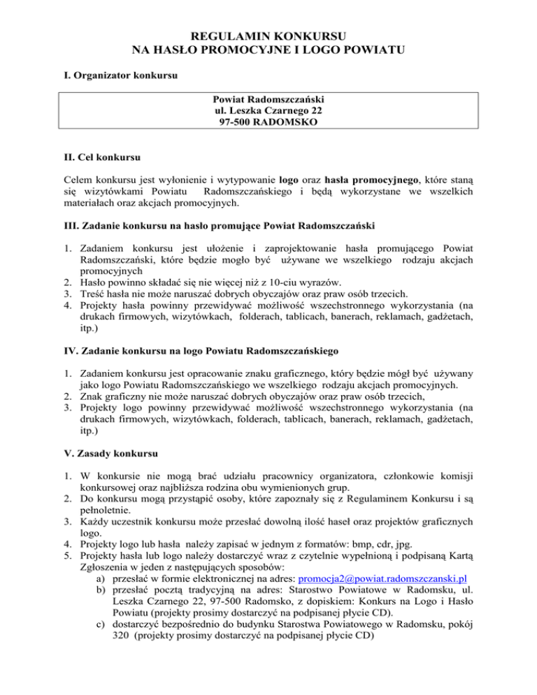 REGULAMIN KONKURSU NA HASŁO PROMOCYJNE I LOGO POWIATU I. Organizator konkursu Powiat Radomszczański ul. Leszka Czarnego 22 97-500 RADOMSKO II. Cel konkursu Celem konkursu jest wyłonienie i wytypowanie logo oraz hasła promocyjnego, które staną się wizytówkami Powiatu Radomszczańskiego i będą wykorzystane we wszelkich materiałach oraz akcjach promocyjnych. III. Zadanie konkursu na hasło promujące Powiat Radomszczański 1. Zadaniem konkursu jest ułożenie i zaprojektowanie hasła promującego Powiat Radomszczański, które będzie mogło być używane we wszelkiego rodzaju akcjach promocyjnych 2. Hasło powinno składać się nie więcej niż z 10-ciu wyrazów. 3. Treść hasła nie może naruszać dobrych obyczajów oraz praw osób trzecich. 4. Projekty hasła powinny przewidywać możliwość wszechstronnego wykorzystania (na drukach firmowych, wizytówkach, folderach, tablicach, banerach, reklamach, gadżetach, itp.) IV. Zadanie konkursu na logo Powiatu Radomszczańskiego 1. Zadaniem konkursu jest opracowanie znaku graficznego, który będzie mógł być używany jako logo Powiatu Radomszczańskiego we wszelkiego rodzaju akcjach promocyjnych. 2. Znak graficzny nie może naruszać dobrych obyczajów oraz praw osób trzecich, 3. Projekty logo powinny przewidywać możliwość wszechstronnego wykorzystania (na drukach firmowych, wizytówkach, folderach, tablicach, banerach, reklamach, gadżetach, itp.) V. Zasady konkursu 1. W konkursie nie mogą brać udziału pracownicy organizatora, członkowie komisji konkursowej oraz najbliższa rodzina obu wymienionych grup. 2. Do konkursu mogą przystąpić osoby, które zapoznały się z Regulaminem Konkursu i są pełnoletnie. 3. Każdy uczestnik konkursu może przesłać dowolną ilość haseł oraz projektów graficznych logo. 4. Projekty logo lub hasła należy zapisać w jednym z formatów: bmp, cdr, jpg. 5. Projekty hasła lub logo należy dostarczyć wraz z czytelnie wypełnioną i podpisaną Kartą Zgłoszenia w jeden z następujących sposobów: a) przesłać w formie elektronicznej na adres: [email protected] b) przesłać pocztą tradycyjną na adres: Starostwo Powiatowe w Radomsku, ul. Leszka Czarnego 22, 97-500 Radomsko, z dopiskiem: Konkurs na Logo i Hasło Powiatu (projekty prosimy dostarczyć na podpisanej płycie CD). c) dostarczyć bezpośrednio do budynku Starostwa Powiatowego w Radomsku, pokój 320 (projekty prosimy dostarczyć na podpisanej płycie CD) VI. Termin nadsyłania prac 1. Konkurs trwa do 30 listopada 2008r. 2. Uczestnictwo w konkursie jest jednoznaczne z akceptacją jego warunków, a własność nagrodzonego dzieła wraz z prawami autorskimi z chwilą wydania nagrody przechodzi na Organizatora. 3. Wszyscy laureaci konkursu zostaną poinformowani o przyznaniu nagród oraz terminie i miejscu ogłoszenia wyników listownie, telefonicznie lub pocztą elektroniczną. 4. Wyniki konkursu zostaną opublikowane na stronie internetowej Organizatora pod adresem www.radomszczanski.pl. VII. Komisja i nagrody 1. O wyłonieniu zwycięzcy konkursu zadecyduje komisja powołana przez Organizatora. 2. Uczestnik konkursu nie może rościć jakichkolwiek pretensji co do sposobu przeprowadzenia konkursu, oraz jego rozstrzygnięcia. 3. W każdej z dwóch kategorii konkursowych (logo i hasło) zostanie wyłoniony i nagrodzony jeden laureat. 4. Organizator przewiduje nagrody o wartości przekraczającej 500 zł każda. VIII. Prawa autorskie i majątkowe Uczestnik konkursu akceptując postanowienia niniejszego regulaminu i oświadcza, że: 1. zgłoszone hasła lub grafiki do konkursu nie były dotychczas wykorzystane przez inny podmiot, bądź zaprezentowane innemu podmiotowi; 2. przysługują mu majątkowe i osobiste prawa autorskie do zgłoszonych w konkursie haseł i grafik; 3. uczestnik konkursu upoważnia Powiat Radomszczański do wykorzystania nadesłanych haseł lub grafik w całości, jak również w postaci ich dowolnych fragmentów w celach promocyjnych i marketingowych. Nagrodzony uczestnik konkursu przeniesie na Powiat Radomszczański swoje prawa autorskie i majątkowe dotyczące hasła promocyjnego lub logo; przeniesienie tych praw nastąpi poprzez podpisanie umowy „o przeniesieniu praw majątkowych i autorskich” co jest warunkiem otrzymania nagrody. IX. Uwagi końcowe 1. Prace nadesłane na konkurs bez dołączonej i podpisanej karty zgłoszenia nie zostaną przyjęte do Konkursu. 2. Organizator zastrzega sobie prawo zmiany Regulaminu w trakcie trwania konkursu oraz do przerwania lub unieważnienia konkursu bez podania przyczyn Serdecznie zapraszamy do udziału w konkursie i życzymy powodzenia Organizator KARTA ZGŁOSZENIA KONKURS NA LOGO I HASŁO PROMOCYJNE POWIATU RADOMSZCZAŃSKIEGO 1. Dane uczestnika konkursu Imię i nazwisko autora:......................................................................................................................................................... Data urodzenia: ........................................................................................................................................................................ 2. Adres do korespondencji i dane kontaktowe Miejscowość: ................................................................................ ............. Ulica:................................................................................ Nr domu:.............................................. Kod i poczta ........................................................................................................................... Numer telefonu: ........................................................................................................................................................ Adres e-mail: .............................................................................................................................................................. 3. Proponowane hasło/hasła - max. 10 wyrazów w haśle (Tego punktu nie wypełnia
