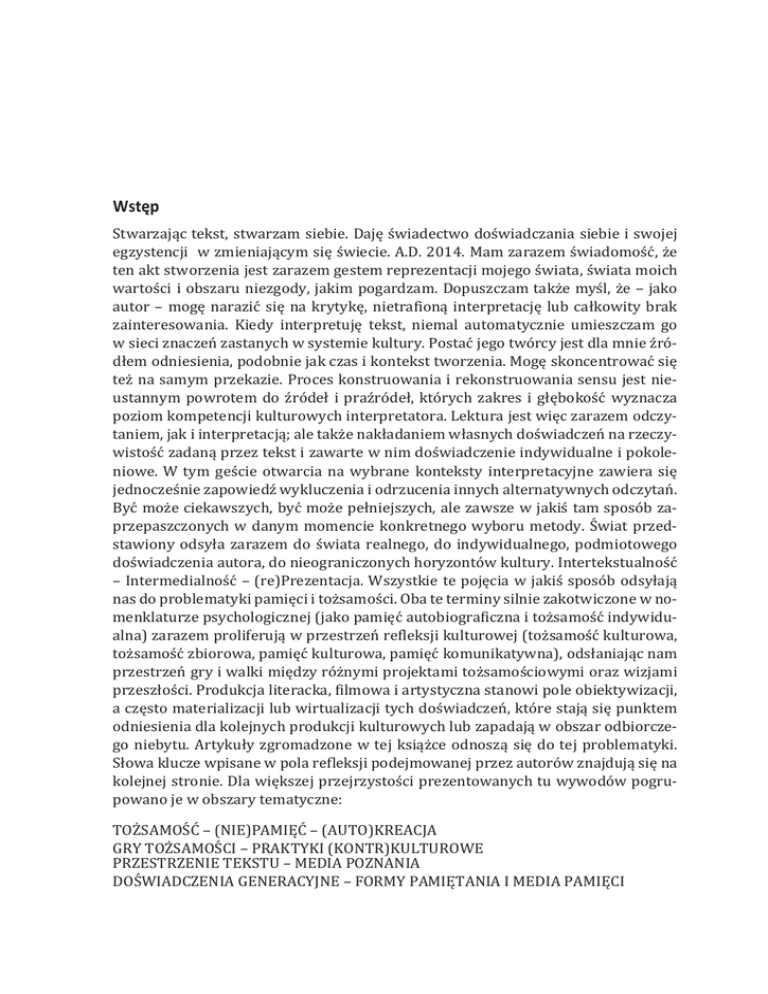 Wstęp Stwarzając tekst, stwarzam siebie. Daję świadectwo doświadczania siebie i swojej egzystencji w zmieniającym się świecie. A.D. 2014. Mam zarazem świadomość, że ten akt stworzenia jest zarazem gestem reprezentacji mojego świata, świata moich wartości i obszaru niezgody, jakim pogardzam. Dopuszczam także myśl, że – jako autor – mogę narazić się na krytykę, nietrafioną interpretację lub całkowity brak zainteresowania. Kiedy interpretuję tekst, niemal automatycznie umieszczam go w sieci znaczeń zastanych w systemie kultury. Postać jego twórcy jest dla mnie źródłem odniesienia, podobnie jak czas i kontekst tworzenia. Mogę skoncentrować się też na samym przekazie. Proces konstruowania i rekonstruowania sensu jest nieustannym powrotem do źródeł i praźródeł, których zakres i głębokość wyznacza poziom kompetencji kulturowych interpretatora. Lektura jest więc zarazem odczytaniem, jak i interpretacją; ale także nakładaniem własnych doświadczeń na rzeczywistość zadaną przez tekst i zawarte w nim doświadczenie indywidualne i pokoleniowe. W tym geście otwarcia na wybrane konteksty interpretacyjne zawiera się jednocześnie zapowiedź wykluczenia i odrzucenia innych alternatywnych odczytań. Być może ciekawszych, być może pełniejszych, ale zawsze w jakiś tam sposób zaprzepaszczonych w danym momencie konkretnego wyboru metody. Świat przedstawiony odsyła zarazem do świata realnego, do indywidualnego, podmiotowego doświadczenia autora, do nieograniczonych horyzontów kultury. Intertekstualność – Intermedialność – (re)Prezentacja. Wszystkie te pojęcia w jakiś sposób odsyłają nas do problematyki pamięci i tożsamości. Oba te terminy silnie zakotwiczone w nomenklaturze psychologicznej (jako pamięć autobiograficzna i tożsamość indywidualna) zarazem proliferują w przestrzeń refleksji kulturowej (tożsamość kulturowa, tożsamość zbiorowa, pamięć kulturowa, pamięć komunikatywna), odsłaniając nam przestrzeń gry i walki między różnymi projektami tożsamościowymi oraz wizjami przeszłości. Produkcja literacka, filmowa i artystyczna stanowi pole obiektywizacji, a często materializacji lub wirtualizacji tych doświadczeń, które stają się punktem odniesienia dla kolejnych produkcji kulturowych lub zapadają w obszar odbiorczego niebytu. Artykuły zgromadzone w tej książce odnoszą się do tej problematyki. Słowa klucze wpisane w pola refleksji podejmowanej przez autorów znajdują się na kolejnej stronie. Dla większej przejrzystości prezentowanych tu wywodów pogrupowano je w obszary tematyczne: TOŻSAMOŚĆ – (NIE)PAMIĘĆ – (AUTO)KREACJA GRY TOŻSAMOŚCI – PRAKTYKI (KONTR)KULTUROWE PRZESTRZENIE TEKSTU – MEDIA POZNANIA DOŚWIADCZENIA GENERACYJNE – FORMY PAMIĘTANIA I MEDIA PAMIĘCI [4] Wstęp Można je oczywiście czytać, interpretować i (re)konstruować wielokrotnie, w innej kolejności i to niezależnie od narzuconej tu dyscypliny lekturowej. Do czego w imieniu Autorów i własnym zachęcam Agnieszka Ogonowska Re: Reprezentacja – Rekonstrukcja – Reinterpretacja …tożsamość, ślad, pamięć, archiwum, wspomnienia, komunikacja, nostalgia, ekran, palimpsest, recykling, narracja, biografia, historia, miejsce, fikcja, konfabulacja, poznanie, maska, trauma, gra, identyfikacja, konfrontacja, mozaika, portret… …tożsamość, identyfikacja, portret, biografia, miejsce ślad, pamięć, archiwum, wspomnienia, nostalgia maska, gra, konfrontacja, narracja, biografia, historia, fikcja, konfabulacja, recykling, ekran, palimpsest, mozaika poznanie, komunikacja… …tożsamość, gra, konfabulacja, maska, konfrontacja, identyfikacja, poznanie, palimpsest, nostalgia, trauma, recykling, narracja, komunikacja, ekran, wspomnienia, historia, fikcja, mozaika, ślad, miejsce, portret, biografia, pamięć, archiwum… …tożsamość, identyfikacja, pamięć, palimpsest, ślad, miejsce, historia, fikcja, poznanie, komunikacja, gra, maska, trauma, konfrontacja, konfabulacja, biografia, portret, ekran, recykling, nostalgia, wspomnienia, archiwum, narracja…