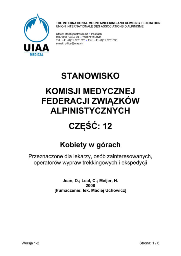 THE INTERNATIONAL MOUNTAINEERING AND CLIMBING FEDERATION UNION INTERNATIONALE DES ASSOCIATIONS D’ALPINISME Office: Monbijoustrasse 61 Postfach CH-3000 Berne 23 SWITZERLAND Tel.: +41 (0)31 3701828 Fax: +41 (0)31 3701838 e-mail: [email protected] STANOWISKO KOMISJI MEDYCZNEJ FEDERACJI ZWIĄZKÓW ALPINISTYCZNYCH CZĘŚĆ: 12 Kobiety w górach Przeznaczone dla lekarzy, osób zainteresowanych, operatorów wypraw trekkingowych i ekspedycji Jean, D.; Leal, C.; Meijer, H. 2008 [tłumaczenie: lek. Maciej Uchowicz] Wersja 1-2 Strona: 1 / 6 Stanowisko Komisji Medycznej UIAA Nr 12: Kobiety w górach 1 Wprowadzenie Niniejsza monografia jest poświęcona zagadnieniom dotyczącym kobiet przebywających na dużych wysokościach i odzwierciedla oficjalne stanowisko Komisji Medycznej UIAA, przygotowane w oparciu o najnowsze publikacje. 2 Kobiety niebędące w ciąży 2.1 AMS Pomiędzy płciami nie występuje różnica w częstości występowania AMS (ang. acute mountain sickness, ostra choroba górska). 2.2 2.3 Częstość występowania HAPE (ang. high-altitude pulmonary oedema, wysokościowy obrzęk płuc) jest niższa wśród kobiet niż mężczyzn. Częstość występowania obrzęków obwodowych jest wyższa wśród kobiet niż mężczyzn. Nie zaobserwowano różnicy w częstości występowania HACE (highaltitude cerebral oedema, wysokościowy obrzęk mózgu) pomiędzy płciami. Chociaż progesteron nasila hipoksyjną reakcję oddechową na poziomie morza, brak jest danych wskazujących na korelację między aklimatyzacją wysokościową i fazami cyklu menstruacyjnego. Miesiączka i okołomeponauzalna miesiączka obfita Pod wpływem dużej wysokości miesiączka może zmienić typowy przebieg; krwawienie może ulec zatrzymaniu, być dłuższe, krótsze lub nieregularne. Wśród przyczyn, być może ważniejszych niż duża wysokość, jest nagła zmiana strefy czasowej (ang. jet lag), wysiłek, wychłodzenie i utrata masy ciała. Aby zahamować lub znacznie zmniejszyć krwawienie, przez kilka miesięcy można stosować doustne preparaty antykoncepcyjne, progesteron (tabletki, iniekcje medroksyprogesteronu) lub hormonalne wkładki domaciczne (w ciągu 3 miesięcy od początku stosowania mogą wystąpić plamienia). Antykoncepcja doustna Brak jest udowodnionych korzyści lub ich braku doustnej antykoncepcji w aklimatyzacji wysokościowej. Teoretyczne ryzyko związane z antykoncepcją doustną (z wyjątkiem progesteronu) to zakrzepica mogąca wystąpić w czasie długich pobytów na dużych wysokościach, w połączeniu z policytemią, odwodnieniem i wychłodzeniem. W rzeczywistości opisano zaledwie kilka zdarzeń tego typu. Ryzyko jest niższe przy stosowaniu doustnych preparatów antykoncepcyjnych II generacji (nie dotyczy to I i III generacji), które są zalecane z wyboru na dużej wysokości, niemniej jednak dla preparatów z tej grupy nadal istnieją zagrożenia: Strona: 2 / 6 Stanowisko Komisji Medycznej UIAA Nr 12: Kobiety w górach o W trakcie wyprawy regularne przyjmowanie preparatów może być niemożliwe, co obniża skuteczność działania antykoncepcyjnego. o Skuteczność ta może również ulec obniżeniu w ciągu 7 dni po stosowaniu niektórych antybiotyków, szczególnie z grupy penicylin o szerokim spektrum działania i tetracyklin. Żelazo Utajony niedobór żelaza może wydłużyć czas aklimatyzacji na bardzo dużej wysokości. W niektórych sytuacjach, przed wyprawą można rozpocząć suplementację ferrytyny. 2.4 3 Kobiety w ciąży 3.1 Ryzyko związane z podróżami do odległych / egzotycznych krajów Utrudniony dostęp do pomocy medycznej / położniczej. W ciąży, choroby infekcyjne, szczególnie biegunka, malaria, zapalenie wątroby typu E, mogą przebiegać z dużym nasileniem. Niektóre leki stosowane w profilaktyce lub leczeniu są przeciwwskazane w czasie ciąży: większość leków przeciwmalarycznych, chinolony, sulfonamidy i inne. 3.2 Ryzyko hipoksji Większość badań dotyczy kobiet żyjących stale w warunkach wysokogórskich. W odniesieniu do kobiet w ciąży, żyjących na nizinach przeprowadzono bardzo mało badań dotyczących nagłej (kilkugodzinnej) ekspozycji na umiarkowaną wysokość, z towarzyszącym wysiłkiem lub bez niego, a także brak jest badań prowadzonych dla pobytów dłuższych (dni/tygodnie). W związku z tym, większość rekomendacji może być ustalana na zasadzie ekstrapolacji. 3.2.1 Fizjologiczne reakcje na ekspozycję wysokościową: Bezpośredni wzrost wentylacji i rzutu serca u matki (ze wzrostem przepływu krwi przez tętnice łożyskowe i maciczne) utrzymuje właściwie zaopatrzenie płodu w tlen. Częstość występowania AMS nie zmienia się w czasie ciąży. Stosowanie acetazolamidu jest przeciwwskazane w trakcie pierwszego trymestru (ryzyko teratogenności) oraz po 36 tygodniu ciąży (ryzyko ciężkiej żółtaczki noworodkowej). z powodu hiperwentylacji (wysokość + ciąża) zaleca się odpowiednie nawodnienie, ponieważ obniżona wilgotność powietrza występująca na wysokości zwiększa zapotrzebowanie na wodę. 3.2.2 Pierwsza połowa ciąży: Ryzyko związane z ekspozycją na wysokość jest niskie. Istnieje nieudowodnione podejrzenie wyższej częstości występowania samoistnego poronienia w pierwszym trymestrze ciąży. Strona: 3 / 6 Stanowisko Komisji Medycznej UIAA Nr 12: Kobiety w górach Zalecenia: o Kobiety które mają kłopoty z zajściem w ciążę/ lub o wyższym ryzyku poronienia samoistnego powinny unikać dużych wysokości. 3.2.3 Druga połowa ciąży Potencjalne wysokie ryzyko dla matki i płodu, zależnie od czynników indywidualnych, wysokości i wysiłku. Krótkie pobyty bez wysiłku (od kilku godzin do kilku dni) o do wysokości 2500 m n.p.m, dla zdrowej ciąży istnieje domyślnie niskie ryzyko, brak dostępnych danych. o Wysokość nie jest wskazana dla kobiet z czynnikami ryzyka (patrz poniżej), nawet w trakcie krótkich pobytów. Długie pobyty bez wysiłku (od tygodni do miesięcy), powyże