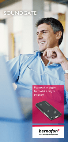 SOUNDGATE Pozostań w ciągłej łączności z całym światem Otaczające nas urządzenia oferują coraz więcej możliwości łączności bezprzewodowej. Telefony umożliwiają nam swobodne komunikowanie się z rodziną i przyjaciółmi, bez względu na czas i miejsce, w którym przebywamy. Inne urządzenia umożliwiają słuchanie muzyki, oglądanie filmów, najnowszych wiadomości itp. Dzięki SoundGate również Twoje aparaty słuchowe mogą dowolnie łączyć się z urządzeniami, z których korzystasz na co dzień. Podczas gdy możliwości tradycyjnych urządzeń bezprzewodowych są dość ograniczone, SoundGate oferuje niezwykłą plastyczność w wyborze źródła dźwięku, które może być podłączone do SoundGate na drodze bezprzewodowej, jak i za pomocą standardowego połączenia przewodowego. Urządzenie SoundGate jest bardzo komfortowe i dyskretne w użyciu, posiada wbudowany mikrofon, moduł Bluetooth ® oraz duże i wygodne klawisze funkcyjne. SoundGate firmy Bernafon umożliwia łączność aparatów słuchowych z urządzeniami zewnętrznymi, bez względu na to gdzie jesteś. Ponieważ nawet w przypadku najlepszych aparatów słuchowych słyszenie w niektórych otoczeniach może być utrudnione, SoundGate oferuje znaczącą poprawę jakości dźwięku w sytuacjach, które dotychczas były kłopotliwe dla osób niedosłyszących. Łączność z telefonem komórkowym Użyj SoundGate, aby połączyć bezprzewodowo swoje aparaty słuchowe z telefonami komórkowymi z Bluetooth ® oraz rozmawiaj swobodnie! Łatwa łączność z Mikrofonem SoundGate Użyj dyskretnego Mikrofonu SoundGate, aby transmitować bezprzewodowo mowę osoby znajdującej się w znacznej odległości od Ciebie. Najwyższej jakości dźwięk z TV Połącz SoundGate z Adapterem TV 2 i transmituj bezprzewodowo dźwięk z telewizji do aparatów słuchowych. Zamień aparaty słuchowe w słuchawki bezprzewodowe Wykorzystaj SoundGate i aparaty słuchowe, aby transmitować bezprzewodowo komunikaty głosowe nawigacji GPS, muzykę itp. z zewnętrznych urządzeń Bluetooth ®. Rozmowy "hand-free" z wykorzystaniem telefonu stacjonarnego Połącz SoundGate z Adapterem Telefonicznym 2 i rozmawiaj bezprzewodowo poprzez standardowy telefon podłączony do linii naziemnej! Cewka indukcyjna Wykorzystaj cewkę indukcyjną wbudowaną w SoundGate i odbieraj bezprzewodowo dźwięk w pomieszczeniach zaopatrzonych w pętle indukcyjne (m.in. w kinach, teatrach, klasach szkolnych, kościołach). SoundGate i telefony komórkowe SoundGate jest interfejsem cyfrowym umożliwiającym przekierowanie sygnału z telefonu komórkowego wprost do Twoich aparatów słuchowych. Dzięki SoundGate nigdy nie "przegapisz" ważnej rozmowy telefonicznej. Urządzenie jest w ciągłym stanie gotowości na połączenia przychodzące, ponadto umożliwia realizację połączeń wychodzących. I co najważniejsze – dzięki SoundGate możliwe jest rozmawianie "hand-free" przez telefon, czyli bez konieczności trzymania słuchawki telefonicznej przy uchu! SoundGate umożliwia również odsłuch muzyki z telefonu lub innego źródła audio (np. odtwarzacza plików muzycznych). Stacja bazowa SoundGate umożliwia szybkie ładowanie baterii urządzenia, dzięki czemu będzie ono zawsze w stanie gotowości do działania. Pętle indukcyjne i SoundGate Coraz więcej miejsc użyteczności publicznej, w tym m.in. klas, teatrów, kin oraz kościołów jest zaopatrzonych w specjalne pętle indukcyjne. Systemy te, wykorzystując tzw. zjawisko indukcji magnetycznej, nadają bezprzewodowo sygnały dźwiękowe, które mogą być odbierane przez SoundGate oraz przekierowywane do aparatów słuchowych. Dzięki temu zawsze bardzo dobrze usłyszysz m.in. dźwięk w kinie, teatrze, mowę w kościele lub klasie szkolnej. Doświadcz fenomenalnych możliwości łączności ze światem. Odbieraj mowę za pomocą Mikrofonu SoundGate Bernafon wprowadza na rynek Mikrofon SoundGate, który umożliwia jeszcze lepsze słyszenie w hałaśliwych pomieszczeniach lub/i w przypadku dużej odległości słuchacza od źródła dźwięku. Niewielki i dyskretny Mikrofon SoundGate może być np. przypięty do ubrania osoby mówiącej, prezentera lub nauczyciela. Mikrofon przekazuje bezprzewodowo dźwięk do SoundGate (urządzenie SoundGate 3 lub wersja wyższa), a następnie do aparatów słuchowych. Zastosowanie Mikrofonu SoundGate umożliwia niezwykle skuteczne oddzielenie dźwięku, który jest dla Ciebie ważny, od innych sygnałów będących najczęściej tzw. hałasami tła akustycznego (np. w głośnej restauracji) lub niepożądanymi odbiciami dźwięku (bardzo często występujących w kościołach). Wszędzie dobrze, ale w domu najlepiej Nieważne, czy masz ochotę na wieczór spędzony przed telewizorem, czy na dłuższą pogawędkę przez telefon, SoundGate zapewni Tobie bezproblemowe i bezprzewodowe połączenie z odpowiednimi urządzeniami. Bezprzewodowy odbiór dźwięku z TV Dzięki Adapterowi TV 2 podłączonemu do Twojego telewizora możliwa jest zdalna transmisja dźwięku z TV do SoundGate, a następnie do Twoich aparatów słuchowych. Dzięki temu sygnał dźwiękowy jest czysty i niezakłócony innymi dźwiękami, które zazwyczaj utrudniają Tobie oglądanie telewizji. Najważniejszą zaletą Adaptera TV 2 jest możliwość ustawienia różnej głośności dźwięku telewizora dla Użytkownika aparatów oraz innych domowników. Nareszcie koniec kłótni o zbyt głośno nastawiony telewizor! Bezprzewodowe połączenie z telefonami stacjonarnymi Dzięki Adapterowi Telefonicznemu 2 oraz SoundGate możesz bezprzewodowo transmitować dźwięk ze standardowego telefonu podłączonego do konwencjonalnej, naziemnej linii telefonicznej. Zamień swoje aparaty słuchowe w specjalistyczne słuchawki i prowadź swobodne konwersacje telefoniczne "hand-free" w domu, w biurze itp. Wybierz akcesoria bezprzewodowe Bernafon oraz pozostań w ciągłej łączności z otoczeniem. SoundGate