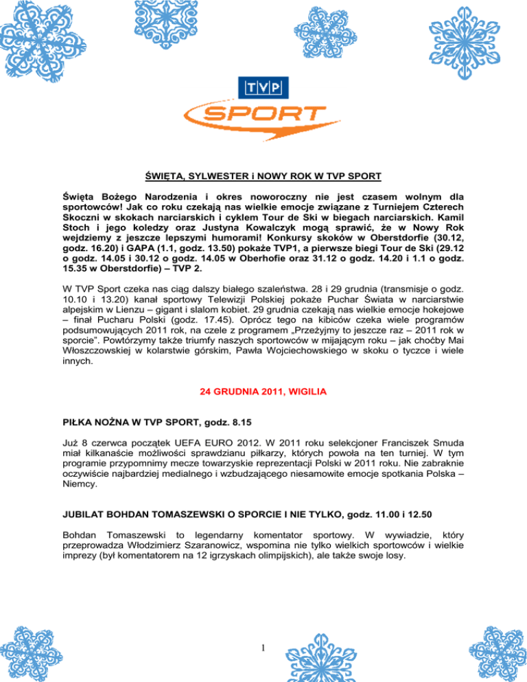 ŚWIĘTA, SYLWESTER i NOWY ROK W TVP SPORT Święta BoŜego Narodzenia i okres noworoczny nie jest czasem wolnym dla sportowców! Jak co roku czekają nas wielkie emocje związane z Turniejem Czterech Skoczni w skokach narciarskich i cyklem Tour de Ski w biegach narciarskich. Kamil Stoch i jego koledzy oraz Justyna Kowalczyk mogą sprawić, Ŝe w Nowy Rok wejdziemy z jeszcze lepszymi humorami! Konkursy skoków w Oberstdorfie (30.12, godz. 16.20) i GAPA (1.1, godz. 13.50) pokaŜe TVP1, a pierwsze biegi Tour de Ski (29.12 o godz. 14.05 i 30.12 o godz. 14.05 w Oberhofie oraz 31.12 o godz. 14.20 i 1.1 o godz. 15.35 w Oberstdorfie) – TVP 2. W TVP Sport czeka nas ciąg dalszy białego szaleństwa. 28 i 29 grudnia (transmisje o godz. 10.10 i 13.20) kanał sportowy Telewizji Polskiej pokaŜe Puchar Świata w narciarstwie alpejskim w Lienzu – gigant i slalom kobiet. 29 grudnia czekają nas wielkie emocje hokejowe – finał Pucharu Polski (godz. 17.45). Oprócz tego na kibiców czeka wiele programów podsumowujących 2011 rok, na czele z programem „PrzeŜyjmy to jeszcze raz – 2011 rok w sporcie”. Powtórzymy takŜe triumfy naszych sportowców w mijającym roku – jak choćby Mai Włoszczowskiej w kolarstwie górskim, Pawła Wojciechowskiego w skoku o tyczce i wiele innych. 24 GRUDNIA 2011, WIGILIA PIŁKA NOśNA W TVP SPORT, godz. 8.15 JuŜ 8 czerwca początek UEFA EURO 2012. W 2011 roku selekcjoner Franciszek Smuda miał kilkanaście moŜliwości sprawdzianu piłkarzy, których powoła na ten turniej. W tym programie przypomnimy mecze towarzyskie reprezentacji Polski w 2011 roku. Nie zabraknie oczywiście najbardziej medialnego i wzbudzającego niesamowite emocje spotkania Polska – Niemcy. JUBILAT BOHDAN TOMASZEWSKI O SPORCIE I NIE TYLKO, godz. 11.00 i 12.50 Bohdan Tomaszewski to legendarny komentator sportowy. W wywiadzie, który przeprowadza Włodzimierz Szaranowicz, wspomina nie tylko wielkich sportowców i wielkie imprezy (był komentatorem na 12 igrzyskach olimpijskich), ale takŜe swoje losy. 1 5 LAT TVP SPORT – NIEZAPOMNIANE TRANSMISJE, godz. 11.25 18 listopada kanał TVP SPORT skończył 5 lat. W tym czasie raczyliśmy kibiców transmisjami z wielkich imprez (igrzyska olimpijskie, mistrzostwa świata w piłce noŜnej, kilkadziesiąt imprez mistrzowskich w dyscyplinach olimpijskich), podczas których polscy sportowcy zdobywali liczne trofea. Przypomnimy występy Adama Małysza, Justyny Kowalczyk, naszych lekkoatletów i wielu innych. MISTRZOSTWA ŚWIATA W LEKKIEJ ATLETYCE – FINAŁ SKOKU O TYCZCE, godz. 13.15 Mistrzostwa świata w lekkiej atletyce 2011 w Daegu miały być popisem polskich zawodników. Niestety, wszyscy najbardziej doświadczeni zawiedli, a największą niespodziankę zrobił debiutujący w tej imprezie Paweł Wojciechowski. Młody sportowiec zszokował nie tylko Polaków, lecz takŜe cały świat, sięgając po złoty medal w konkursie skoku o tyczce. MISTRZOSTWA ŚWIATA W KOLARSTWIE GÓRSKIM, godz. 16.30 Maja Włoszczowska – wicemistrzyni olimpijska z 2008 roku z Pekinu – od lat sięga po medale najwaŜniejszych imprez. W 2011 roku broniła tytułu mistrzyni świata i gdyby nie defekt roweru, cel zapewne by osiągnęła. Z imprezy wróciła ze srebrnym medalem, a sam wyścig miał dramatyczny przebieg. MECZ TOWARZYSKI: POLSKA – NIEMCY, godz. 20.00 To było wielkie wydarzenie medialne. Polska na PGE Arena – obiekcie, na którym będą rozgrywane spotkania UEFA EURO 2012 – w towarzyskim spotkaniu podejmowała reprezentację Niemiec, z którą jeszcze nigdy w historii nie wygrała. Wydawało się, Ŝe tym razem po bardzo dramatycznym meczu cel osiągnie, prowadząc w 90. minucie 2:1 po bramkach Roberta Lewandowskiego i Jakuba Błaszczykowskiego. Niestety, w doliczonym czasie gry rywale wyrównali. 25 GRUDNIA 2011, BOśE NARODZENIE ZŁOTE TRANSMISJE: EL MŚ 1978, POLSKA – DANIA, godz. 8.05 Cykl Złote transmisje, w którym TVP SPORT przypomina wielkie chwile polskiego sportu, cieszy się wielką popularnością wśród widzów. Tym razem przypomnimy mecz reprezentacji Polski w eliminacjach do mistrzostwa świata w 1978 roku. Biało-czerwoni, których trenerem był wtedy Jacek Gmoch, podejmowali Danię, którą rozgromili 4:1. 2 JAK TO Z FUTBOLEM BYŁO, godz. 15.30 i 18.00 Przełomowe momenty w historii futbolu, decyzje, które wpływały na losy piłki noŜnej, kontrowersyjne sytuacje i dramatyczne mecze – to wszystko będzie moŜna zobaczyć w tym dokumencie. Opowiadamy historię futbolu i szukamy genezy powstania gry, zastanawiając się głównie nad procesem przemiany z podwórkowej zabawy w wielki światowy sport. NAJPIĘKNIEJSZE POLSKIE BRAMKI, godz. 20.35 Przypomnimy nie tylko najładniejsze, ale takŜe najbardziej istotne bramki zdobyte przez piłkarzy reprezentacji Polski. Nie zabraknie więc trafienia Jana Domarskiego na Wembley, fantastycznych bomb Jerzego Gorgonia i Włodzimierza Lubańskiego z Igrzysk Olimpijskich 1972, czy mundialowych goli Kazimierza Deyny z 1974 i duetu Zbigniew Boniek–Andrzej Buncol z 1982 roku. Wszystkie gole będą okraszone oryginalnym komentarzem. 26 GRUDNIA 2011, II DZIEŃ ŚWIĄT BOśEGO NARODZENIA ZŁOTE TRANSMISJE, EURO 1988 – PÓŁFINAŁ: ZSRR – WŁOCHY, godz. 16.30 UEFA EURO 2012 coraz bliŜej, więc w cyklu Złote Transmisje przypominamy wielkie spotkania z historii tej imprezy. Tym razem TVP SPORT pokaŜemy mecz półfinałowy mistrzostw Europy w 1988 roku: ZSRR – Włochy 2:0. MISTRZOSTWA POLSKI W SKOKACH NARCIARSKICH, godz. 12.50 LIVE Tradycyjnie w drugi dzień świąt BoŜego Narodzenia zostaną rozegrane mistrzostwa Polski w skokach narciarskich. To dla Kamila Stocha i jego kolegów z reprezentacji ostatni sprawdzian przed rozpoczynającym się cztery dni później Turniejem Czterech Skoczni. 68. TOUR DE POLOGNE – PODSUMOWANIE, godz. 18.55 To największa w Polsce impreza pod względem logistycznym i o wielkim poziomie sportowym. Nasz narodowy wyścig naleŜy co cyklu Word Tour, który jes