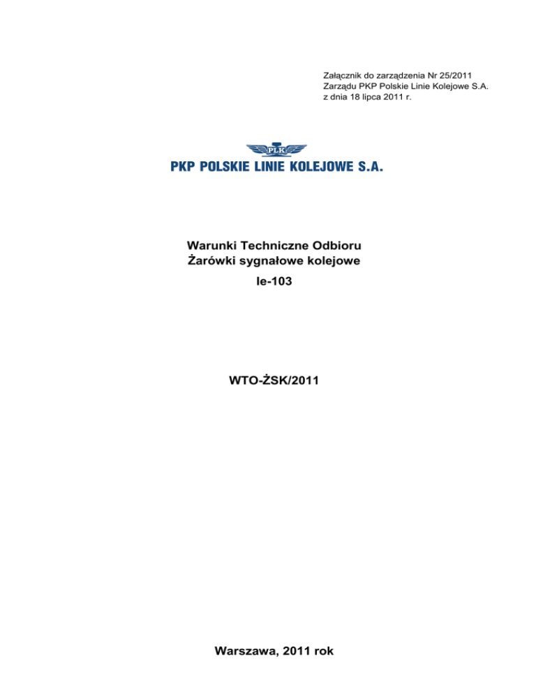Załącznik do zarządzenia Nr 25/2011 Zarządu PKP Polskie Linie Kolejowe S.A. z dnia 18 lipca 2011 r. Warunki Techniczne Odbioru Żarówki sygnałowe kolejowe Ie-103 WTO-ŻSK/2011 Warszawa, 2011 rok Właściciel: PKP Polskie Linie Kolejowe S.A. Wydawca: PKP Polskie Linie Kolejowe S.A. Centrala Biuro Automatyki i Telekomunikacji ul. Targowa 74, 03-734 Warszawa tel. 22 473 20 50 www.plk-sa.pl, e-mail: [email protected] Wszelkie prawa zastrzeżone. Modyfikacja, wprowadzanie do obrotu, publikacja, kopiowanie i dystrybucja w celach komercyjnych, całości lub części przepisu, bez uprzedniej zgody PKP Polskie Linie Kolejowe S.A. – są zabronione PKP POLSKIE LINIE KOLEJOWE S.A. SPIS TREŚCI 1. 1.1. 1.2. 1.3. 2. 3. 3.1. 3.2. 3.3. 3.4. 3.5. 3.6. 3.7. 3.8. 3.9. 3.10. 3.11. Wstęp ........................................................................................................................ 5 Przedmiot Warunków Technicznego Odbioru. .......................................................... 5 Zakres stosowania Warunków Technicznych Odbioru. ............................................. 5 Normy związane ....................................................................................................... 5 Oznaczenia ............................................................................................................... 6 Wymagania. .............................................................................................................. 7 Konstrukcja i wykonanie............................................................................................ 7 Wymiary .................................................................................................................... 7 Współosiowość bańki z trzonkiem ............................................................................ 7 Położenie żarnika ...................................................................................................... 8 Prawidłowość współpracy żarówki z oprawką. .......................................................... 8 Początkowy minimalny strumień świetlny ................................................................. 8 Początkowa moc ....................................................................................................... 8 Trwałość minimalna .................................................................................................. 8 Odporność na przepięcia .......................................................................................... 8 Wytrzymałość mechaniczna ...................................................................................... 8 Wytrzymałość mechaniczna i odporność na narażenia środowiskowe ...................... trzonków B22d ......................................................................................................... 9 3.12. Odporność na wibracje. ............................................................................................ 9 3.13. Zakres temperatury pracy. ........................................................................................ 9 4. Pakowanie. Przechowywanie. Transport. ................................................................. 9 4.1. Opakowanie jednostkowe ......................................................................................... 9 4.2. Opakowanie transportowe ........................................................................................ 9 4.3. Przechowywanie. .................................................................................................... 10 4.4. Transport................................................................................................................. 10 5. Badania ................................................................................................................... 10 5.1. Rodzaje badań . ...................................................................................................... 10 5.2. Liczność próbki i dopuszczalna wadliwość. ............................................................ 11 5.3. Program badań. ...................................................................................................... 14 5.4. Opis badań.............................................................................................................. 15 5.5. Ocena wyników badań ............................................................................................ 19 6. Źródło dokumentu / Historia zmian ......................................................................... 19 ZAŁĄCZNIK Nr 1- Karta danych żarówki sygnałowej kolejowej .......................................... B22d/25x26 12V/12W 3000h ........................................................... 20 ZAŁĄCZNIK Nr 2 – Karta danych żarówki sygnałowej kolejowej .......................................... B22d/25x26 12V/24W 10000h ......................................................... 21 ZAŁĄCZNIK Nr 3 – Karta danych żarówki drogowej sygnalizacji kolejowej ......................... B22d/25x26 12V/24W 2000h ........................................................... 22 ZAŁĄCZNIK Nr 4 – Karta danych żarówki sygnałowej kolejowej dwuświatłowej ................... B22d/25x26 12V / 2x24W 6000h ..................................................... 23 ZAŁĄCZNIK Nr 5 – Karta wymagań dla trzonka ................................................................ 24 3 stan na dzień 18 lipca 2011 r. PKP POLSKIE LINIE KOLEJOWE S.A. PKP POLSKIE LINIE KOLEJOWE S.A. 1. Wstęp 1.1. Przedmiot Warunków Technicznego Odbioru. Przedmiotem niniejszych Warunków Technicznego Odbioru, zwanych w skrócie Ie-103 (WTO-ŻSK/2011), przygotowanych dla żarówek sygnałowych kolejowych stosowanych w układach optycznych sygnalizatorów kolejowych i drogowych sygnalizatorów kolejowych, są wymagania oraz badania żarówek z żarnikiem wolframowym w bańkach przeźroczystych o 