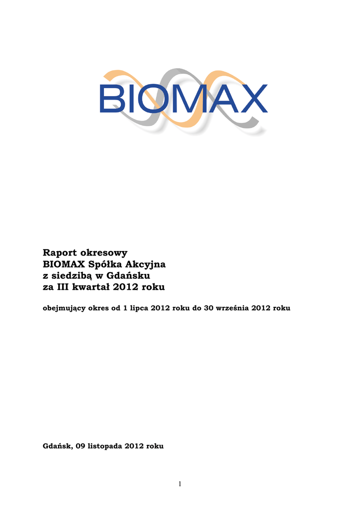 Raport okresowy BIOMAX Spółka Akcyjna z siedzibą w Gdańsku za III kwartał 2012 roku obejmujący okres od 1 lipca 2012 roku do 30 września 2012 roku Gdańsk, 09 listopada 2012 roku 1 LIST PREZESA ZARZĄDU BIOMAX S.A. DO AKCJONARIUSZY Szanowni Akcjonariusze i Inwestorzy, W imieniu BIOMAX Spółka Akcyjna przesyłamy Państwu raport za III kwartał 2012 roku. Tak jak we wcześniejszych okresach, także w III kwartale 2012 roku Spółka kontynuowała realizację przyjętej przez siebie strategii. Rezultatem naszych starań jest otrzymana od Narodowego Centrum Badań pozytywna ocena merytoryczna wniosku o dofinansowanie realizacji projektu ,,Opracowanie innowacyjnej technologii wytwarzania nowej generacji kosmetyków i suplementów diety opartych na aktywnym biologicznie kolagenie” o łącznej wartości prawie 4.900.000 złotych i kwocie dofinansowania prawie 2.300.000 złotych. Zgodnie z założeniami projektu Spółka planuje przeprowadzenie prac badawczych w celu otrzymania ze skór łososia hodowlanego aktywnego kolagenu, przeprowadzenie badań przemysłowych, opracowanie receptur i technologii przemysłowej produkcji, w której Spółka ma ambicję zostać pionierem na rynku. Mamy nadzieję, że już wkrótce będziemy się mogli pochwalić Państwu naszymi produktami pierwszą linią dermokosmetyków. Proces ten obwarowany wieloma wymogami jest jednak wymagający, a więc czasochłonny. Spółka kontynuuje działania, mające na celu uzupełnienie gamy dermokosmetyków o kolejne produkty. Spółka prowadzi działania stanowiące źródło wsparcia zarówno dla przejętej w maju bieżącego roku Spółki BIOPARK Sp. z o.o., będącej koordynatorem Klastra Biotechnologicznego, Spółki Bio-Service Sp. z o.o. zajmującej się sprzedażą i dystrybucją towarów wyprodukowanych przez spółki wchodzące w skład grupy kapitałowej BIOMAX S.A, jak i Spółki zależnej Nutri Pharmax S.A. służąc swoim doświadczeniem przy wprowadzaniu jej na Giełdę. W imieniu własnym oraz Spółki chciałbym bardzo podziękować pracownikom oraz współpracownikom za zaangażowanie w budowanie wartości Spółki a także Akcjonariuszom za zaufanie jakim nas obdarzają. Pragniemy zapewnić Państwa, że dokładamy wszelkich starań, by realizować nasze plany z jak najlepszym rezultatem. Dziękujemy za okazaną wyrozumiałość w związku z faktem, że realizacja wytyczonych sobie celów wiąże się także z długim procesem ich osiągania, nie zawsze zależnym od nas samych. Informacje o naszej Spółce znajdą Państwo na naszej stronie internetowej www.biomaxsa.pl do odwiedzania której bardzo Państwa zachęcamy. Z wyrazami szacunku, Wojciech Samp Gdańsk, 09 listopada 2012 roku 2 Spis treści 1. Wybrane dane finansowe BIOMAX S.A. za I kwartał 2012 roku str. 4 1.1 Wybrane dane bilansu str.4 1.2 Wybrane dane rachunku zysków i strat str.5 2. Podstawowe informacje o spółce str. 7 2.1 Dane o spółce str. 7 2.2 Kapitał zakładowy str. 7 2.3 Zarząd Spółki BIOMAX S.A. str. 8 2.4 Rada Nadzorcza Spółki BIOMAX S.A. str. 8 2.5 Struktura Akcjonariatu str. 9 3. Komentarz zarządu BIOMAX S.A. na temat czynników i zdarzeń, które miały wpływ na osiągnięty wynik finansowy str.10 4. Informacje Zarządu na temat aktywności w I kwartale 2012 roku str.11 5. Oświadczenie Zarządu str. 12 3 1. Wybrane dane finansowe z bilansu oraz rachunku zysków i strat 1.1 Wybrane dane Bilansu PLN Dane (na dzień) Aktywa trwałe Aktywa obrotowe Aktywa razem Należności krótkoterminowe Należności długoterminowe Środki pieniężne i inne aktywa Zobowiązania krótkotermino-we Zobowiązania długoterminowe Kapitał własny Kapitał podstawowy 31.12.2010 31.12.2011 5 874 000,00 5 974 000,00 31.03.2012 6 294 000,00 4 938 299,66 30.06.2012 30.09.2012 9 219 480,00 9 219 480,00 5 088 238,06 5 122 4610,33 4 328 061,03 4 258 186,34 10 962 238,06 11 096 4610,33 11 232 299,66 13 547 541,03 13 477 666 ,34 4 745 880,20 738 603,38 489 555,92 729 615,02 811 542,71 0,00 0,00 0,00 0,00 0,00 264 534,10 4 118 682,71 4 118 645,05 3 192 009,13 3 191 902,87 22 471,28 199 628,41 285 934,43 630 450,91 336 572,40 0,00 0,00 0,00 0,00 0,00 10 937 679,28 10 869 472,31 10 811 360,62 12 917 090,12 12 905 516,90 4 016 000,00 4 316 000,00 4 316 000,00 4 456 00,00 4 456 00,00 PLN Dane (na dzień) Aktywa trwałe Aktywa obrotowe Aktywa razem Należności krótkoterminowe Należności długoterminowe Środki pieniężne i inne aktywa Zobowiązania krótkotermino-we Zobowiązania długoterminowe Kapitał własny 30.09.2011 5 874 000,00 5 183 169,42 11 057 169,42 30.09.2012 9 219 480,00 4 258 186,34 13 477 666,34 135 823,14 811 542,71 0,00 0,00 4 888 059,46 3 191 902,87 83 092,00 336 572,40 0,00 10 949 747,61 0,00 12 905 516,90 4 316 000,00 4 456 00,00 Kapitał podstawowy 4 Wybrane dane Rachunku Zysków i Strat Dane (na dzień) 01.01.201031.12.2010 Przychody netto ze sprzedaży Koszty działalności operacyjnej Amortyzacja Zysk/Strata na sprzedaży Pozostałe przychody operacyjne Pozostałe koszty operacyjne Zysk/Strata z działalności operacyjnej Przychody finansowe Koszty finansowe Zysk/Strata z działalności finansowej Zysk/Strata brutto 339 000,11 0,72 22 242,87 -361 242,26 0,0 78,46 -361 320,72 -361 320,72 Zysk/Strata netto -361 320,72 339 000,11 01.01.2011- 01.01.2012- 01.01.201231.12.2011 30.06.2012 30.09.2012 235 000,00 239 000,00 228 000,00 156 839,68 172 316,74 322 471,90 0,00 0,00 1 851,20 78 160,32 66 683,26 -44 323,10 0,00 0,00 84 001,81 0,00 0,00 0,27 78 160,32 66 683,26 39 678,44 0,00 0,00 776 296,19 9,68 105,84 884 181,60 78 150,64 66 577,42 -68 206,97 78 150,64 66 577,42 -68 206,97 78 150,64 66 577,42 -68 206,97 PLN Dane ( na dzień) 01.01.2011-30.09.2011 01.01.2012-30.09.2012 Przychody netto ze sprzedaży 225 000,00 239 000,00 Koszty działalności operacyjnej 239 316,68 0,00 -14 316,68 1,81 0,27 172 316,74 62 889,85 0,00 267,25 66 684,26 -14 582,39 -14 582,39 -14 582,39 66 577,42 Amortyzacja Zysk/Strata na sprzedaży Poz
