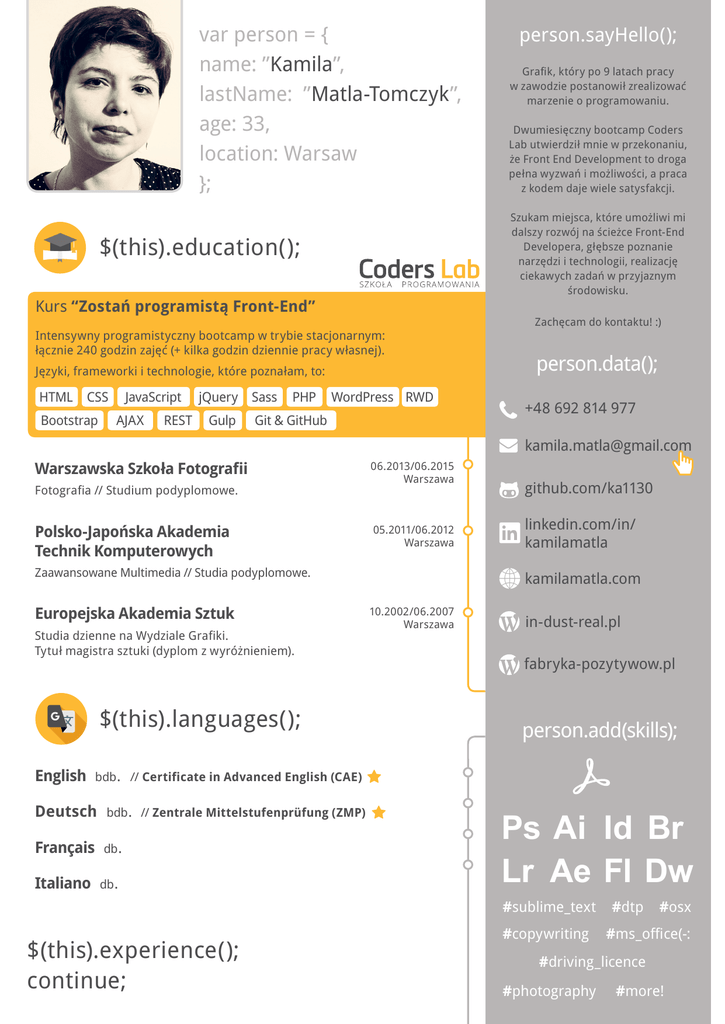 Języki, frameworki i technologie, które poznałam, to: