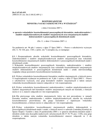 Dz.U.07.65.435 2008.01.01 zm. Dz.U.08.82.489 § 1 ROZPORZĄDZENIE MINISTRA NAUKI I SZKOLNICTWA WYśSZEGO1) z dnia 2 kwietnia 2007 r. w sprawie wskaźników kosztochłonności poszczególnych kierunków, makrokierunków i studiów międzykierunkowych studiów stacjonarnych oraz stacjonarnych studiów doktoranckich w poszczególnych dziedzinach nauki (Dz. U. z dnia 13 kwietnia 2007 r.) Na podstawie art. 96 pkt 1 ustawy z dnia 27 lipca 2005 r. - Prawo o szkolnictwie wyŜszym (Dz. U. Nr 164, poz. 1365, z późn. zm.2)) zarządza się, co następuje: § 1. 1. Rozporządzenie określa wskaźniki kosztochłonności poszczególnych kierunków, makrokierunków i studiów międzykierunkowych studiów stacjonarnych oraz wskaźniki kosztochłonności stacjonarnych studiów doktoranckich w poszczególnych dziedzinach nauki i dziedzinach sztuki. 2. Wskaźniki kosztochłonności poszczególnych kierunków, makrokierunków i studiów międzykierunkowych studiów stacjonarnych oraz wskaźniki kosztochłonności stacjonarnych studiów doktoranckich w poszczególnych dziedzinach nauki i sztuki odzwierciedlają względne relacje poziomów kosztochłonności kształcenia. § 2. Wykaz wskaźników kosztochłonności kierunków studiów stacjonarnych, o których mowa w rozporządzeniu wydanym na podstawie art. 9 pkt 1 ustawy z dnia 27 lipca 2005 r. - Prawo o szkolnictwie wyŜszym, oraz grup kierunków studiów stacjonarnych o takim samym wskaźniku kosztochłonności stanowi załącznik nr 1 do rozporządzenia. § 3. Wykaz wskaźników kosztochłonności makrokierunków i studiów międzykierunkowych studiów stacjonarnych lub kierunków studiów stacjonarnych innych niŜ kierunki, o których mowa w § 2, stanowi załącznik nr 2 do rozporządzenia. § 4. Dla pierwszego roku studiów stacjonarnych, który nie jest prowadzony w ramach kierunku studiów, makrokierunku i studiów międzykierunkowych, określa się wskaźnik kosztochłonności przewidziany dla grupy kierunków o najniŜszym wskaźniku kosztochłonności, o którym mowa w załączniku nr 1 do rozporządzenia. § 5. Wykaz wskaźników kosztochłonności stacjonarnych studiów doktoranckich w poszczególnych dziedzinach nauki i sztuki, o których mowa w uchwale Centralnej Komisji do Spraw Stopni i Tytułów z dnia 24 października 2005 r. w sprawie określenia dziedzin nauki i dziedzin sztuki oraz dyscyplin naukowych i artystycznych (M. P. Nr 79, poz. 1120), oraz grup dziedzin o takim samym wskaźniku kosztochłonności stanowi załącznik nr 3 do rozporządzenia. 1 § 6. Rozporządzenie wchodzi w Ŝycie z dniem ogłoszenia, z mocą od dnia 1 stycznia 2007 r. ______ 1) Minister Nauki i Szkolnictwa WyŜszego kieruje działem administracji rządowej szkolnictwo wyŜsze, na podstawie § 1 ust. 2 pkt 2 rozporządzenia Prezesa Rady Ministrów z dnia 18 lipca 2006 r. w sprawie szczegółowego zakresu działania Ministra Nauki i Szkolnictwa WyŜszego (Dz. U. Nr 131, poz. 912). 2) Zmiany wymienionej ustawy zostały ogłoszone w Dz. U. z 2006 r. Nr 46, poz. 328, Nr 104, poz. 708 i 711, Nr 144, poz. 1043 i Nr 227, poz. 1658. ZAŁĄCZNIKI ZAŁĄCZNIK Nr 1 (1) WYKAZ WSKAŹNIKÓW KOSZTOCHŁONNOŚCI ORAZ GRUP KIERUNKÓW STACJONARNYCH O TAKIM SAMYM WSKAŹNIKU KOSZTOCHŁONNOŚCI 1. Grupa kierunków o wskaźniku kosztochłonności ks1 = 1,0: 1) administracja; 2) dziennikarstwo i komunikacja społeczna; 3) ekonomia; 4) europeistyka; 5) filologia polska; 6) filozofia; 7) historia; 8) muzykologia; 9) nauki o rodzinie; 10) pedagogika; 11) politologia; 12) polityka społeczna; 13) praca socjalna; 14) prawo; 15) prawo kanoniczne; 16) stosunki międzynarodowe; 17) teologia. 2. Grupa kierunków o wskaźniku kosztochłonności ks2 = 1,5: 1) filologia; 2) finanse i rachunkowość; 3) informacja naukowa i bibliotekoznawstwo; 4) informatyka i ekonometria; 5) kosmetologia; 6) logistyka; 7) matematyka; 8) pedagogika specjalna; 9) psychologia; 10) socjologia; 11) zarządzanie. 3. Grupa kierunków o wskaźniku kosztochłonności ks3 = 2,0: 1) archeologia; 2) architektura i urbanistyka; 2 3) architektura wnętrz; 4) edukacja artystyczna w zakresie sztuki muzycznej; 5) edukacja artystyczna w zakresie sztuk plastycznych; 6) edukacja techniczno-informatyczna; 7) etnologia; 8) geografia; 9) gospodarka przestrzenna; 10) historia sztuki; 11) kulturoznawstwo; 12) organizacja produkcji filmowej i telewizyjnej; 13) sport; 14) taniec; 15) turystyka i rekreacja; 16) wiedza o teatrze; 17) wychowanie fizyczne; 18) zarządzanie i inŜynieria produkcji. 4. Grupa kierunków o wskaźniku kosztochłonności ks4 = 2,5: 1) architektura krajobrazu; 2) bezpieczeństwo narodowe; 3) bezpieczeństwo wewnętrzne; 4) biologia; 5) budownictwo; 6) chemia; 7) dietetyka; 8) dyrygentura; 9) fizjoterapia; 10) fizyka; 11) geodezja i kartografia; 12) geologia; 13) górnictwo i geologia; 14) grafika; 15) informatyka; 16) instrumentalistyka; 17) inŜynieria środowiska; 18) jazz i muzyka estradowa; 19) kompozycja i teoria muzyki; 20) leśnictwo; 21) malarstwo; 22) oceanografia; 23) ochrona dóbr kultury; 24) ochrona środowiska; 25) ogrodnictwo; 26) rolnictwo; 27) rybactwo; 28) scenografia; 29) technika rolnicza i leśna; 30) technologia drewna; 31) technologia Ŝywności i Ŝywienie człowieka; 32) towaroznawstwo; 33) transport; 3 34) włókiennictwo; 35) wokalistyka; 36) wzornictwo; 37) zdrowie publiczne. 5. Grupa kierunków o wskaźniku kosztochłonności ks5 = 3,0: 1) aktorstwo; 2) analityka medyczna; 3) astronomia; 4) automatyka i robotyka; 5) biotechnologia; 6) elektronika i telekomunikacja; 7) elektrotechnika; 8) energetyka; 9) farmacja; 10) fizyka techniczna; 11) inŜynieria bezpieczeństwa; 12) inŜynieria biomedyczna; 13) inŜynieria chemiczna i procesowa; 14) inŜynieria materiałowa; 15) kierunek lekarski; 16) kierunek lekarsko-dentystyczny; 17) konserwacja i restauracja dzieł sztuki; 18) lotnictwo i kosmonautyka; 19) mechanika i budowa maszyn; 20) mechatronika; 21) metalurgia; 22) nawigacja; 23) oceanotech
