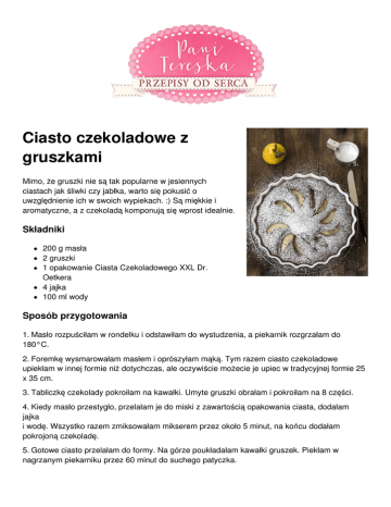 Ciasto czekoladowe z gruszkami Mimo, że gruszki nie są tak popularne w jesiennych ciastach jak śliwki czy jabłka, warto się pokusić o uwzględnienie ich w swoich wypiekach. :) Są miękkie i aromatyczne, a z czekoladą komponują się wprost idealnie. Składniki 200 g masła 2 gruszki 1 opakowanie Ciasta Czekoladowego XXL Dr. Oetkera 4 jajka 100 ml wody Sposób przygotowania 1. Masło rozpuściłam w rondelku i odstawiłam do wystudzenia, a piekarnik rozgrzałam do 180°C. 2. Foremkę wysmarowałam masłem i oprószyłam mąką. Tym razem ciasto czekoladowe upiekłam w innej formie niż dotychczas, ale oczywiście możecie je upiec w tradycyjnej formie 25 x 35 cm. 3. Tabliczkę czekolady pokroiłam na kawałki. Umyte gruszki obrałam i pokroiłam na 8 części. 4. Kiedy masło przestygło, przelałam je do miski z zawartością opakowania ciasta, dodałam jajka i wodę. Wszystko razem zmiksowałam mikserem przez około 5 minut, na końcu dodałam pokrojoną czekoladę. 5. Gotowe ciasto przelałam do formy. Na górze poukładałam kawałki gruszek. Piekłam w nagrzanym piekarniku przez 60 minut do suchego patyczka.