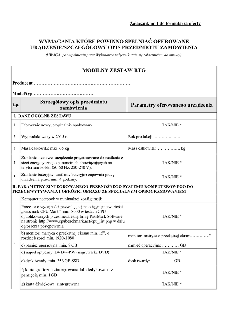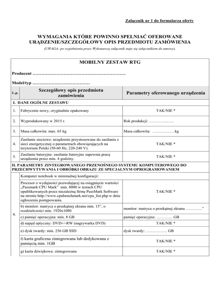 Załącznik nr 1 do formularza oferty WYMAGANIA KTÓRE POWINNO SPEŁNIAĆ OFEROWANE URĄDZENIE/SZCZEGÓŁOWY OPIS PRZEDMIOTU ZAMÓWIENIA (UWAGA: po wypełnieniu przez Wykonawcę załącznik staje się załącznikiem do umowy). MOBILNY ZESTAW RTG Producent ……………………………………………………… Model/typ ………………………………… L.p. Szczegółowy opis przedmiotu zamówienia Parametry oferowanego urządzenia I. DANE OGÓLNE ZESTAWU 1. Fabrycznie nowy, oryginalnie opakowany TAK/NIE * 2. Wyprodukowany w 2015 r. Rok produkcji: …………..….. 3. Masa całkowita: max. 65 kg Masa całkowita: ……………. kg 4. Zasilanie sieciowe: urządzenie przystosowane do zasilania z sieci energetycznej o parametrach obowiązujących na terytorium Polski (50-60 Hz, 220-240 V). TAK/NIE * 5. Zasilanie bateryjne: zasilanie bateryjne zapewnia pracę urządzenia przez min. 4 godziny. TAK/NIE * II. PARAMETRY ZINTEGROWANEGO PRZENOŚNEGO SYSTEMU KOMPUTEROWEGO DO PRZECHWYTYWANIA I OBRÓBKI OBRAZU ZE SPECJALNYM OPROGRAMOWANIEM Komputer notebook w minimalnej konfiguracji: Procesor o wydajności pozwalającej na osiągnięcie wartości „Passmark CPU Mark” min. 8000 w testach CPU opublikowanych przez niezależną firmę PassMark Software na stronie http://www.cpubenchmark.net/cpu_list.php w dniu ogłoszenia postępowania. 6. TAK/NIE * b) monitor: matryca o przekątnej ekranu min. 15”, o rozdzielczości min. 1920x1080 monitor: matryca o przekątnej ekranu …………” c) pamięć operacyjna: min. 8 GB pamięć operacyjna: ………… GB d) napęd optyczny: DVD+/-RW (nagrywarka DVD) e) dysk twardy: min. 256 GB SSD f) karta graficzna zintegrowana lub dedykowana z TAK/NIE * dysk twardy: ……………. GB pamięcią min. 1GB TAK/NIE * g) karta dźwiękowa: zintegrowana TAK/NIE * h) złącza: 1 x VGA, min. 2 x USB 3.0, 2 x USB 2.0 ,1 x LAN, 1 x zintegrowana karta Wi-Fi, wejście mikrofonowe, wyjście słuchawkowe; TAK/NIE * i) bateria: litowo-jonowa, zapewniająca pracę komputera przez min 4h TAK/NIE * j) bezprzewodowa, w pełni współdziałająca z dostarczonym komputerem mysz optyczna wraz z podkładką TAK/NIE * k) profesjonalny system operacyjny, wersja 64 bit, w TAK/NIE * polskiej wersji językowej l) komplet sterowników do komputera i urządzeń peryferyjnych TAK/NIE * m) oprogramowanie do zestawu rentgenowskiego w języku polskim z modułami obróbki graficznej oraz funkcją bazy danych zawierającej czas wykonania zdjęcia, dane wykonującego i opis TAK/NIE * System komputerowy posiada co najmniej następujące funkcje obróbki obrazu: 7. 8. a) geometryczne powiększenie poszczególnych części obrazu TAK/NIE * b) pseudochromatyczne zabarwienie (pseudokolor) TAK/NIE * c) płynna regulacja kontrastu i jasności TAK/NIE * d) pozytyw – negatyw TAK/NIE * e) zapis słownego objaśnienia TAK/NIE * f) składanie obrazów (funkcja umożliwiająca połączenie kilku obrazów w jeden obraz w przypadku konieczności sprawdzenia dużego obiektu wykraczającego rozmiarem poza obszar obrazowania przetwornika obrazu) TAK/NIE * Połączenie systemu komputerowego do przechwytywania obrazu z panelem przetwornika obrazu – odpowiedni kabel o dł. min. 100 m oraz łączność bezprzewodowa o zasięgu min. 100 m (w terenie zabudowanym, na terenie Portu Lotniczego Warszawa - Okęcie). TAK/NIE * Lampa rentgenowska: a) napięcie w lampie rentgenowskiej umożliwiające penetrację stali o grubości min 25 mm 9. napięcie w lampie rentgenowskiej umożliwia penetrację stali o grubości ………………….mm b) zdalny i czasowy wyzwalacz energii RTG TAK/NIE * c) obsługa przewodowa i bezprzewodowa (łączność z panelem przetwornika obrazu) TAK/NIE * d) zasilanie: bateria wewnętrzna + dodatkowa bateria oraz inteligentna szybka ładowarka do baterii TAK/NIE * e) czas pracy baterii: min. 4 godziny czas pracy baterii: …………… godziny f) waga bez dodatkowej baterii: max 10 kg waga bez dodatkowej baterii: ……….kg Panel przetwornika obrazu: 10. a) typ sensora obrazu: wielkoformatowa matryca z amorficznego krzemu, lub matryca liniowa TAK/NIE * 2 11. b) rozmiary panelu: max.: 710 x 760 x 55 mm (wysokość, szerokość, grubość) rozmiary panelu: …………. wysokość x ……….. szerokość x …………..grubość c) rozmiar obszaru obrazowania: min.: 535 x 412 mm rozmiar obszaru obrazowania: …….x ….. mm d) sterowanie przewodowe (kabel min. 100 m) oraz bezprzewodowe o zasięgu min. 100 m (w terenie zabudowanym, teren Portu Lotniczego Warszawa Okęcie), całość sterowania jako jeden element wraz z przetwornikiem obrazu TAK/NIE * e) zasilanie: bateria wewnętrzna + inteligentna szybka ładowarka do baterii TAK/NIE * f) czas pracy na baterii: min. 4 godziny czas pracy na baterii: ………… godziny g) waga: max. 11 kg waga: ………………. kg Moduł (funkcja, system) umożliwiający identyfikację w kolorze materiałów organicznych i nieorganicznych TAK/NIE * Opakowanie: a) Twarda hermetyczna walizka transportowa typu Pelicase 12. na generator i wszystkie akcesoria, wykorzystywana jako platforma robocza operatora b) Twarda hermetyczna walizka transportowa typu Pelicase na panel TAK/NIE * TAK/NIE * III. DODATKOWE WYMAGANIA: Urządzenie współpracuje z robotem pirotechnicznym „Expert” i „IBIS’ - PIAP. Przenośne urządzenie rentgenowskie będzie dostarczone ze wszystkimi 13. niezbędnymi uchwytami i wyposażeniem dodatkowym umożliwiającym zainstalowanie i okablowanie urządzenia na robocie pirotechnicznym „Expert” i „IBIS” TAK/NIE * 14. Urządzenie przenośne i proste w obsłudze TAK/NIE * Urządzenie posiada obudowę zwartą, odporną na wstrząsy i 15. zapewniającą ochronę przed działaniem niekorzystnych warunków atmosferycznych TAK/NIE * 16. Urządzenie przystosowane do pracy całodobowej TAK/NIE * Urządzenie bezpieczne dla obsługi i otoczenia (posiada deklaracje zgodności lub oznakowanie „CE”, zgodnie z 17. Rozporzą