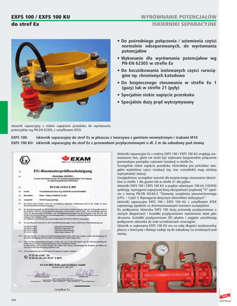 eXFS 100 / eXFS 100 KU do stref ex WyróWnanIe poTencjałóW ISKIernIKI Separacyjne • Do pośredniego połączenia / uziemienia części normalnie odseparowanych, do wyrównania potencjałów • Wykonanie dla wyrównania potencjałow wg PN-EN 62305 w strefie Ex • Do bocznikowania izolowanych części rurociągów np. chronionych katodowo • Do bezpiecznego stosowania w strefie Ex 1 (gazy) lub w strefie 21 (pyły) • Specjalnie niskie napięcie przeskoku • Specjalnie duży prąd wytrzymywany Iskiernik separacyjny z niskim napięciem przeskoku do wyrównania potencjałów wg PN-EN 62305, z certyfikatem ATEX. EXFS 100: iskiernik separacyjny do stref Ex w płaszczu z tworzywa z gwintem wewnętrznym i śrubami M10 EXFS 100 KU: iskiernik separacyjny do stref Ex z przewodami przyłączeniowymi o dł. 2 m do zabudowy pod ziemią Iskierniki separacyjne Ex z rodziny EXFS 100 / EXFS 100 KU znajdują zastosowanie tam, gdzie nie może być wykonane bezpośrednie połączenie przewodzące pomiędzy częściami instalacji w strefie Ex. Szczególnie niskie napięcia przeskoku iskierników jest potrzebne tam, gdzie wydzielone częsci instalacji (np. tzw. monobloki) mają niedużą wytrzymałość izolacji. Uwzględniono szczególne warunki dla bezpiecznego stosowania iskierników w strefie 1 dla gazów lub w strefie 21 dla pyłów. Iskierniki EXFS 100 i EXFS 100 KU o prądzie udarowym 100 kA (10/350) spełniają wymagania najwyższej klasy obciążalności prądowej ”H” zgodnie z normą PN-EN 50164-3 ”Elementy urządzenia piorunochronnego (LPC) -- Część 3: Wymagania dotyczące iskierników izolacyjnych”. Iskierniki separacyjne EXFS 100 i EXFS 100 KU z certyfikatem ATEX zapewniają zgodność ze zharmonizowanymi normami europejskimi. Do podłączenia iskiernika EXFS 100 służą przewody przyłączeniowe o różnych długościach i kształtki przyłączeniowe wymienione obok jako akcesoria. Kształtki przyłączeniowe (IF) płaskie i wygięte umożliwiają podłączenie iskeirnika do śrub na kołnierzach rurociagów. Iskiernik w wykonaniu EXFS 100 KU ma na całej długości wodoszczelny płaszcz z tworzywa i dlatego nadaje się do zabudowy na instalacjach pod ziemią. Certyfikat Ex 344 www.dehn.pl eXFS 100 / eXFS 100 KU eXFS 100 KU WyróWnanIe poTencjałóW ISKIernIKI Separacyjne 923 101 KU EXFS 100 EXFS 100 KU separacyjny w wykonaniu Ex, 100 kA iskiernik 923 101 isolating spark gap/ iskiernik separacyjny Funkenstrecke część izolowana insulating piece/ Isolierstück izolacja insulation / Isolierung Przykład podłączenia EXFS 100 KU Rysunek wymiarowy EXFS 100 KU EXFS KU: isiernik separacyjny w wykonaniu Ex z wyprowadzeniami, do stosowania na zewnątrz obiektów i w gruncie EXFS 100 KU Prąd udarowy (10/350) Iimp Klasa obciążalności prądowej wg PN-EN 50164-3 Znamionowy prąd wyładowczy (8/20) In Największe napięcie trwałej pracy (50 Hz) UW/AC 100% Napięcie przeskoku przy udarze 1,2/50 Urimp Napięcie przemienne zadziałania (50 Hz) Uaw Prąd wytrzymywany (50 Hz) Imax Specjalny stopień ochrony Ex wg EN 60079: Gazy Specjalny stopień ochrony Ex wg EN 61241: Pyły Zakres temperatur pracy TU Stopień ochrony Certyfikaty Długość obudowy Średnica obudowy Materiał obudowy Podłączenie Dane potrzebne do zamówienia Typ Numer katalogowy Opakowanie jednostkowe 346 100 kA H 100 kA 250 V ≤ 1,25 kV ≤ 0,5 kV 500 A / 0,5 sekundy (TU: ≤ 45°C) II 2G Ex d IIC T6 II 2D Ex tD A21 IP67 T 80°C -20°C...+60°C IP 67 BVS 06 ATEX E 099, IECEx KEM 09.0051... 123 mm 34 mm cynk odlewany ciśnieniowo, tworzywo sztuczne NYY-J-1x25 mm2 , długość ok. 2 m po obu stronach EXFS 100 KU 923 101 1 szt. www.dehn.pl
