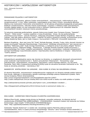 HISTORYCZNY I WSPÓŁCZESNY ANTYSEMITYZM Autor: Aleksander Szumanski 12.03.2015. POMAWIANIE POLAKÓW O ANTYSEMITYZM Określone koła żydowskie, głównie Żydów amerykańskich , niezrzeszonych, nieformalnych grup zorganizowanych w tzw. lobby żydowskie, wspomagane przez Hilary Clinton, prezydenta Baracka Obamę oraz żydowskich historyków amerykańskich, od lat głoszą antypolską propagandę przypisującą Polakom szmalcownictwo, rabunek mienia żydowskiego i wyssany z mlekiem matki antysemityzm. Ponadto żądają wpłaty na owe żydowskie konta w Stanach Zjednoczonych 65 miliardów dolarów amerykańskich tytułem restytucji mienia pożydowskiego. Te kalumnie popierają grafomańskie, pseudo historyczne książki Jana Tomasza Grossa, "Sąsiedzi", "Strach", "Złote żniwa" - wydane wspólnie z Ireną Grudzińską - Gross. Do tej grafomańskiej, antyhistorycznej histerii - pseudo literatury, dołączają antypolskie książki Barbary Engelking - Boni w rodzaju "Jest taki piękny słoneczny dzień" i nagonki na pisarzy piszących prawdę, prowokowane przez Polską Akademię Nauk, jak to miało miejsce z wyrzuceniem z PAN prof. Krzysztofa Jasiewicza. Barbara Engelking - Boni jest żoną TW "Znak" Michała Boniego, doradcy Tuska, który donosił również na swego pryncypała Tadeusza Mazowieckiego. Prekursorem "polskiego antysemityzmu" jest oszczerczy i kłamliwy "Malowany ptak" Żyda Jerzego Kosińskiego, a następnie przez 6 lat pisany plagiat "Kariery Nikodema Dyzmy" Tadeusza Dołęgi - Mostowicza, z którego powodu Kosiński został wyrzucony z amerykańskiego Pen Clubu i popełnił samobójstwo. Kłamstwo, oszczerstwo i żydowski antypolonizm Jerzego Kosińskiego wypunktowała pisarka i reportażystka Joanna Siedlecka w książce - dokumencie "Czarny ptasior". ANTYSEMITYZM UKRAIŃSKI Antysemityzm paradoksalnie szerzy się również na Ukrainie, w urządzanych ekscesach antysemickich przez żydowski rząd banderowców z Źydem prezydentem Walzmanem - Poroszenką i jego pobratymcami, nacjonalistami, anysemitami, faszystami z partii Prawego Sektora, czy też partii Swoboda. Patrz http://niepoprawni.pl/blog/2218/bij-zyda-ze-zbrodnia-ukrainsko-niemiecka-w-tle "Bij Żyda ze zbrodnią ukraińsko - niemiecką w tle". BANDERYZM WSPÓŁCZESNY NA UKRAINIE - EWA KUREK W ATAKU NA WALDEMARA ŁYSIAKA W obronie faszystów, antysemickich neobanderowców rządzących na Ukrainie stanęła polska historyk Ewa Kurek, atakując w niewybredny sposób wybitnego polskiego pisarza Waldemara Łysiaka. Patrz strona Kongresu Polonii Amerykańskiej http://www.kongresprwdzplamrk.com/ArticleDetails.aspx?id=22927 http://radio.radiopomost.com/ze-swiata/3603-tzw-ewka-kurek-w-ataku-na-wielk-polaka-w-lysiaka http://aleksanderszumanski.pl/index.php?option=com_content&task=view&id=... http://blogopinia24.pl/blog/entry/2014/10/ewa-kurek-w-ponownym-ataku-na-... EWA KUREK - KOMENTARZ MIECZYSŁAWA SYLWESTRA KAZIMIERCZAKA „Ewa Kurek, mająca swoją stronę na facebook, wszystko wskazuje, że okazuje się być zwolenniczką STRONNICTWA AMERYKAŃSKO - ŻYDOWSKIEGO. Swoistym testem był stosunek do Feliksa Konecznego i jego książki "CYWILIZACJA ŻYDOWSKA”. Patrz http://gazetaobywatelska.info/blog/showEntry/1230 Żydowska "Gazeta Wyborcza" w osobie red. naczelnego Adama Michnika atakuje Kościół rzymskokatolicki, który w czasie promocji antypolskiego "Strachu" Jana Tomasza Grossa stwierdził, iż http://aleksanderszumanski.pl Kreator PDF Utworzono 3 March, 2017, 11:16 Polacy są jak Kościół, uczący obłudy, zakłamania, hipokryzji i konformizmu. Patrz https://www.youtube.com/watch?v=QlSsg7QkjrY W tym miejscu należy przypomnieć wywiad dr Aliny Całej z Żydowskiego Instytutu Historycznego w Warszawie udzielonego Piotrowi Zychowiczowi w "Rzeczpospolitej", w którym Alina Cała stwierdza, iż Polacy są winni Holocaustu mordując 3 miliony polskich Żydów. Patrz http://www.rp.pl/artykul/310528.html Całą tę hańbę opisałem precyzyjnie w "Zakazanej historii" z 1 września 2013 r. w tekście "Malowany ptak z czarnym ptasiorem w tle", również i na własnych stronach internetowych. Patrz http://aleksanderszumanski.pl/index.php?option=com_content&task=view&id=1067&Itemid=2 INSTYTUT YAD VASHEM W JEROZOLIMIE PRAWDA O POSTAWIE POLAKÓW W RATOWANIU ŻYDÓW Archiwum Instytutu Yad Vashem w Jerozolimie po przeszło 50 latach od czasu jego założenia stanowi największą kolekcję dokumentów dotyczących Zagłady. Kolekcja zawiera ponad 100 000 świadectw Ocalałych. W tej liczbie kolekcja dotycząca Sprawiedliwych wśród Narodów Świata zawiera ponad 23 788 rekordów. Zebrany materiał dostarcza informacji na temat historii ratowania Żydów, osób niosących pomoc i osób, które tę pomoc otrzymały. Zweryfikowane historie pomocy skutkują uhonorowaniem ratujących tytułem Sprawiedliwy wśród Narodów Świata. Na terenie ogrodu Instytutu Yad Vashem przez lata zasadzane były drzewa Sprawiedliwych, a nazwiska wszystkich Sprawiedliwych wyryte są na ścianie „Ogrodu Sprawiedliwych”. Polska pomoc Żydom w czasie II Wojny Światowej – ogół pomocy polskich organizacji humanitarnych, rządu polskiego na uchodźstwie, struktur polskiego Państwa Podziemnego oraz ludności cywilnej RP jaka została skierowana wobec ludności żydowskiej w latach 1939-1945. Zawiera się w niej działalność informacyjna związana z prześladowaniami oraz zbrodniami dokonywanymi przez okupantów niemieckich na ludności żydowskiej, a także pomoc materialna mająca wymiar humanitarny oraz ukrywanie Żydów przed deportacją do gett oraz obozów koncentracyjnych, grożąca karą śmierci Polakom wraz z rodzinami ratujących Żydów. Polacy stanowią największą liczbę wśród odznaczonych najwyższym izraelskim odznaczeniem cywilnym nadawanym nie - Żydom, medalem Sprawiedliwy wśród Narodów Świata, przyznawanym przez Instytut Pamięci Męczenników i Bohaterów Holocaustu Yad Vashem. POLITYKA HISTORYCZNA PREZYDENTA FRANCJI 