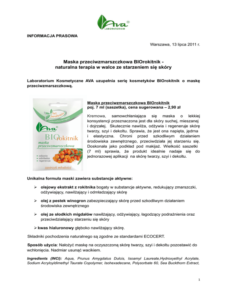 INFORMACJA PRASOWA Warszawa, 13 lipca 2011 r. Maska przeciwzmarszczkowa BIOrokitnik naturalna terapia w walce ze starzeniem się skóry Laboratorium Kosmetyczne AVA uzupełnia serię kosmetyków BIOrokitnik o maskę przeciwzmarszczkową. Maska przeciwzmarszczkowa BIOrokitnik poj. 7 ml (saszetka), cena sugerowana – 2,90 zł Kremowa, samowchłaniająca się maska o lekkiej konsystencji przeznaczona jest dla skóry suchej, mieszanej i dojrzałej. Skutecznie nawilza, odzywia i regeneruje skórę twarzy, szyi i dekoltu. Sprawia, ze jest ona napięta, jędrna i elastyczna. Chroni przed szkodliwym działaniem środowiska zewnętrznego, przeciwdziała jej starzeniu się. Doskonała jako podkład pod makijaz. Wielkość saszetki (7 ml) sprawia, ze produkt idealnie nadaje się do jednorazowej aplikacji na skórę twarzy, szyi i dekoltu. Unikalna formuła maski zawiera substancje aktywne: olejowy ekstrakt z rokitnika bogaty w substancje aktywne, redukujący zmarszczki, odzywiający, nawilzający i odmładzający skórę olej z pestek winogron zabezpieczający skórę przed szkodliwym działaniem środowiska zewnętrznego olej ze słodkich migdałów nawilzający, odzywiający, łagodzący podraznienia oraz przeciwdziałający starzeniu się skóry kwas hialuronowy głęboko nawilzający skórę. Składniki pochodzenia naturalnego są zgodne ze standardami ECOCERT. Sposób użycia: Nałozyć maskę na oczyszczoną skórę twarzy, szyi i dekoltu pozostawić do wchłonięcia. Nadmiar usunąć wacikiem. Ingredients (INCI): Aqua, Prunus Amygdalus Dulcis, Isoamyl Laureate,Hydroxyethyl Acrylate, Sodium Acryloyldimethyl Taurate Copolymer, Isohexadecane, Polysorbate 60, Sea Buckthorn Extract, 1 Vitis Vinifera (Grape) Oil, Glycerin, Sodium Hyaluronate, PEG-40 Hydrogenated Castor Oil, Sodium Dehydroacetate, Parfum, Citric Acid, Xanthan Gum, EDTA. Obecnie seria naturalna terapia BIOrokitnik składa się z 7 produktów: kremu nawilzającego na dzień 50 ml (23,99 zł), kremu odzywczego na noc 50 ml (23,99 zł), masła do ciała 250 ml (41,99 zł), płynu micelarnego 200 ml (19,99 zł), maski zelowej 30 ml (21,99 zł), aktywnego kremu pod oczy 25 ml (21,49 zł) oraz maski przeciwzmarszczkowej 7 ml (2,90 zł). Produkty z serii BIOrokitnik nie zawierają: surowców pochodzących z rafinacji ropy naftowej silikonów konserwantów z grupy parabenów sztucznych barwników. Pełna oferta kosmetyków Laboratorium Kosmetycznego AVA dostępna jest w firmowym sklepie internetowym www.ava-sklep.pl. *** O firmie Laboratorium Kosmetyczne „AVA” istnieje i prowadzi nieprzerwanie działalność od 1961 roku. Jest jedną z najstarszych prywatnych firm kosmetycznych w Polsce. „W zgodzie z naturą”® to hasło, które przyświeca działalności Laboratorium od początku jej istnienia. Firma stale poszukuje nowych rozwiązań, odpowiadających na aktualne potrzeby kobiet. Pierwsza i jedyna polska firma posiadająca licencję na produkcję kosmetyków ekologicznych. ECO Linea® oraz ECO Body® to pierwsze polskie naturalne i organiczne kosmetyki z certyfikatem wg standardów ECOCERT. W swojej bogatej ofercie Laboratorium Kosmetyczne „AVA” posiada kosmetyki wytwarzane juz od 50 lat. Są to sprawdzone kosmetyki, które przez cały czas cieszą się duzą popularnością wśród klientek i nalezą do grupy najlepiej sprzedających się produktów w swojej kategorii. Laboratorium specjalizuje się w produkcji kosmetyków pielęgnacyjnych do twarzy i ciała zarówno w wersji detalicznej, jak i profesjonalnej. Więcej informacji mozna znaleźć na www.ava-laboratorium.pl oraz www.ava-sklep.pl 2