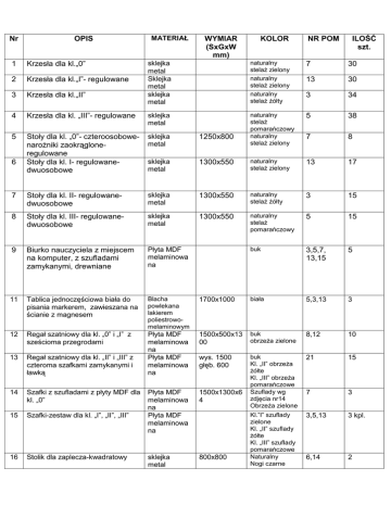 Nr OPIS MATERIAŁ WYMIAR (SxGxW mm) KOLOR NR POM ILOŚĆ szt. sklejka metal Sklejka metal sklejka metal naturalny stelaŜ zielony naturalny stelaŜ zielony naturalny stelaŜ Ŝółty 7 30 13 30 3 34 Krzesła dla kl. „III”- regulowane sklejka metal 5 38 Stoły dla kl. „0”- czteroosobowenaroŜniki zaokrągloneregulowane Stoły dla kl. I- regulowanedwuosobowe sklejka metal 1250x800 naturalny stelaŜ pomarańczowy naturalny stelaŜ zielony 7 8 sklejka metal 1300x550 naturalny stelaŜ zielony 13 17 7 Stoły dla kl. II- regulowanedwuosobowe sklejka metal 1300x550 naturalny stelaŜ Ŝółty 3 15 8 Stoły dla kl. III- regulowanedwuosobowe sklejka metal 1300x550 naturalny stelaŜ pomarańczowy 5 15 9 Biurko nauczyciela z miejscem na komputer, z szufladami zamykanymi, drewniane Płyta MDF melaminowa na buk 3,5,7, 13,15 5 11 Tablica jednoczęściowa biała do pisania markerem, zawieszana na ścianie z magnesem Blacha powlekana lakierem poliestrowomelaminowym 1700x1000 biała 5,3,13 3 12 Regał szatniowy dla kl. „0” i „I” z sześcioma przegrodami 1500x500x13 00 buk obrzeŜa zielone 8,12 10 13 Regał szatniowy dla kl. „II” i „III” z czteroma szafkami zamykanymi i ławką Płyta MDF melaminowa na Płyta MDF melaminowa na wys. 1500 głęb. 600 21 15 14 Szafki z szufladami z płyty MDF dla kl. „0” buk Kl. „II” obrzeŜa Ŝółte Kl. „III” obrzeŜa pomarańczowe Szuflady wg zdjęcia nr14 ObrzeŜa zielone 7 3 15 Szafki-zestaw dla kl. „I”, „II”, „III” 3,5,13 3 kpl. 16 Stolik dla zaplecza-kwadratowy Kl.”I” szuflady zielone Kl. „II” szuflady Ŝółte Kl. „III” szuflady pomarańczowe Naturalny Nogi czarne 6,14 2 1 Krzesła dla kl.„0” 2 Krzesła dla kl.„I”- regulowane 3 Krzesła dla kl.„II” 4 5 6 Płyta MDF melaminowa na Płyta MDF melaminowa na 1500x1300x6 4 sklejka metal 800x800 17 Szafki z regałami jedna zamykana, jedna bez zamka 18 Krzesła dla nauczyciela do biurka 19 Regał jednostronny 20 Regał dwustronny 21 Regał ekspozycyjny do biblioteki 22 Trójdzielna lada biblioteczna 23 Szafa katalogowa 24 Stoliki do komputera 25 Stolik pod drukarkę 26 Stół dla 15 osób 27 Szafa ze schowkami 28 Szafa ubraniowa 29 Regał z szafką 30 Regał z szufladami 31 Regał z szafką 32 Lada naroŜna do sekretariatu 33 Krzesło obrotowe 34 Regał 35 Regał 36 Regał 37 Stół konferencyjny na 6 osób Płyta MDF melaminowa na Drewno Materiał sklejka metal sklejka metal Płyta MDF melaminowa na Płyta MDF melaminowa na Płyta MDF melaminowa na sklejka metal sklejka metal Płyta MDF melaminowa na Płyta MDF melaminowa na Płyta MDF melaminowa na Płyta MDF melaminowa na Płyta MDF melaminowa na Płyta MDF melaminowa na Płyta MDF melaminowa na Drewno Materiał Płyta MDF melaminowa na Płyta MDF melaminowa na Płyta MDF melaminowa na Płyta MDF melaminowa buk 6 2 StelaŜ buk Brąz Naturalny StelaŜ czarny Naturalny StelaŜ czarny Naturalny StelaŜ czarny 6,14, 15,20 15,16 25 15 11 15 1 Buk StelaŜ metalowy czarny 16 1 Buk StelaŜ metalowy czarny 16 1 Naturalny czarny Naturalny czarny Buk StelaŜ metalowy czarny 17 4 17 3 18 1 Buk ObrzeŜa buk 18 1 Buk ObrzeŜa buk 18 1 Buk ObrzeŜa buk 18 1 Buk ObrzeŜa buk 18 1 Buk ObrzeŜa buk 18 1 Blat buk Przód ciemnozielony 19 1 19 1 800x400x196 0 Buk zielony Buk ObrzeŜa buk 19 1 800x400x196 0 Buk ObrzeŜa buk 19 1 800x400x123 8 Buk ObrzeŜa buk 19 1 Blat mahoń StelaŜ mahoń 20 1 1050x540x20 30 800x370x180 0 800x470x180 0 700x450x760 Wys. 64 cm 2500x1200x7 60 1600x600x12 00 15 38 39 WyposaŜenie gabinetu dyrektora : biurko, szafa z regałami, regał przeszklony z szufladami Krzesło obrotowe 40 Szafka ekologiczna 41 Zestaw szafek na Płyta MDF melaminowa na Drewno Materiał Płyta MDF melaminowa na Płyta MDF melaminowa na mahoń 20 1 kpl Mahoń Materiał brąz Zielony 20 1 7 1 Drzwiczki Ŝółte i zielone ObrzeŜa zielone 7 1