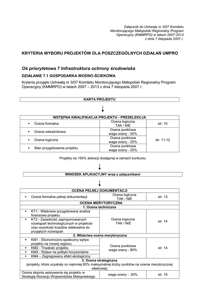 Załącznik do Uchwały nr 3/07 Komitetu Monitorującego Małopolski Regionalny Program Operacyjny (KMMRPO) w latach 2007-2013 z dnia 7 listopada 2007 r. KRYTERIA WYBORU PROJEKTÓW DLA POSZCZEGÓLNYCH DZIAŁAŃ UMPRO Oś priorytetowa 7 Infrastruktura ochrony środowiska DZIAŁANIE 7.1 GOSPODARKA WODNO-ŚCIEKOWA Kryteria przyjęte Uchwałą nr 3/07 Komitetu Monitorującego Małopolski Regionalny Program Operacyjny (KMMRPO) w latach 2007 – 2013 z dnia 7 listopada 2007 r. KARTA PROJEKTU WSTĘPNA KWALIFIKACJA PROJEKTU - PRESELEKCJA Ocena logiczna Ocena formalna TAK / NIE Ocena punktowa Ocena wskaźnikowa waga oceny - 50% Ocena punktowa Ocena logiczna waga oceny - 25% Ocena punktowa Stan przygotowania projektu waga oceny - 25% str. 10 str. 11-12 Projekty na 150% alokacji dostępnej w ramach konkursu WNIOSEK APLIKACYJNY wraz z załącznikami OCENA PEŁNEJ DOKUMENTACJI Ocena logiczna Ocena formalna pełnej dokumentacji str. 13 TAK / NIE OCENA MERYTORYCZNA 1. Ocena techniczna KT1 - Właściwie przygotowana analiza finansowa projektu Ocena logiczna KT2 - Zasadność zaproponowanych str. 14 TAK / NIE rozwiązań technologicznych w projekcie oraz wysokość kosztów adekwatna do przyjętych rozwiązań 2. Właściwa ocena merytoryczna KM1 - Ekonomiczno-społeczny wpływ projektu na rozwój regionu Ocena punktowa KM2 - Trwałość projektu str. 14 waga oceny - 80% KM3 - Wpływ na polityki horyzontalne KM4 – Zagregowany efekt ekologiczny 3. Ocena strategiczna (projekty, które uzyskały co najmniej 60% maksymalnej liczby punktów na ocenie merytorycznej właściwej) Ocena stopnia wpisywania się projektu w waga oceny - 20% str. 15 Strategię Rozwoju Województwa Małopolskiego 2007-2013 UCHWAŁA ZWM OŚ PRIORYTETOWA 7. INFRASTRUKTURA OCHRONY ŚRODOWISKA Działanie 7.1 Gospodarka wodno-ściekowa Kryteria wstępnej kwalifikacji projektów - preselekcji L.p Nazwa kryterium Waga Charakter kryterium Logiczne (tak/nie)/ Punktowe (L/P) 1 2 3 4 Komentarz / Uzasadnienie 5 Ocena formalna 1. Warunki wstępne 2. Kompletność i poprawność karty projektu 3. Kwalifikowalność Beneficjenta 4. Kwalifikowalność projektu 5. Kompletność i poprawność załączników 6. Montaż finansowy, w tym: wkład własny beneficjenta ustalony na poziomie nie mniejszym, niż określony w Uszczegółowieniu MRPO dla danego działania/schematu jako „minimalny wkład własny Beneficjenta" 7. Poprawność przyjętych wskaźników 8. Spójność zapisów w dokumentach Projekt jest realizowany w miejscowościach znajdujących się w aglomeracjach od 2 000 do 15 000 RLM ujętych Krajowym Programie Oczyszczania Ścieków Komunalnych 9. 10. Demarkacja z PROW (dotycząca lokalizacji i kwoty - załącznik potwierdzający, że Beneficjent na ten sam zakres rzeczowy projektu nie otrzymał dofinansowania z PROW) - L Ocena formalna będzie polegać na sprawdzeniu poprawności karty projektu oraz załączników wymaganych w ramach danego konkursu pod kątem spełniania wymogów formalnych zawartych w dokumentacji konkursowej. - L Kryteria dostępowe dla działania 7.1 11. Zgodnie z Rozporządzeniem Ministra Środowiska z dnia 22 grudnia 2004 r. w sprawie sposobu wyznaczania obszaru i granic aglomeracji (Dz.U. Nr 283 poz. 2841) par. 3 ust. 4. Przy wyznaczaniu obszaru aglomeracji bierze się pod uwagę, że realizacja sieci kanalizacyjnej na obszarze aglomeracji z doprowadzeniem do oczyszczalni ścieków powinna być uzasadniona finansowo i technicznie, przy czym wskaźnik długości sieci obliczany jako stosunek przewidywanej do obsługi przez system kanalizacji zbiorczej liczby mieszkańców aglomeracji i niezbędnej do realizacji długości sieci kanalizacyjnej (łącznie z kolektorami i przewodami tłocznymi doprowadzającymi ścieki do oczyszczalni) nie może być mniejszy od 120 mieszkańców na 1 km sieci. 5. Przepisu ust. 4 nie stosuje się, w przypadku gdy sieć kanalizacyjna będzie zlokalizowania na terenie: 1) o znacznym spadku w kierunku istniejącej lub przewidywanej oczyszczalni ścieków; 2) stref ochronnych ujść wody dla potrzeb zbiorowego zaopatrzenia w wodę; 3) objętym formą ochrony przyrody w rozumieniu ustawy z dnia 16 kwietnia 2004 r. o ochronie przyrody (Dz. U. Nr 92, poz. 880). Dla sieci kanalizacji sanitarnej - na 1 km sieci przypada nie mniej niż 120 osób Ocena wskaźnikowa 1. Komplementarność projektu 2 0-3 pkt. 2. Kompleksowość projektu 2 1-3 pkt. 3. Stopień zanieczyszczenia wody pitnej na obszarze realizacji projektu 4 1-3 pkt. W tym kryterium ocenie podlegać będzie wykazana przez Beneficjenta komplementarność projektu w stosunku do innych działań w danym zakresie, realizowanych na danym terenie lub w danej dziedzinie. W szczególności badana będzie spójność projektu z innymi projektami zrealizowanymi, realizowanymi lub planowanymi przez Beneficjenta lub inne podmioty. W zależności od charakteru projektu badana będzie również spójność projektu ze strategią lokalną, regionalną lub branżową w danej dziedzinie. Kryterium to będzie pozwalało na wybranie projektów najbardziej atrakcyjnych dla odbiorców. W ramach tego kryterium badane będzie czy oprócz rozwiązań infrastrukturalnych projekt przewiduje określone wartości dodane, dodatkowe usługi nakierowane na odbiorów projektu oraz czy oprócz elementów standardowych projekt oferuje dodatkowe wartości w zakresie infrastruktury i urządzeń wykraczające poza charakter podstawowy. Najwyżej oceniane będą projekty o najwyższym stopniu kompleksowości. W ramach kryterium oceniany będzie stopień zanieczyszczenia wody pitnej na obszarze realizacji projektu. Najlepiej oceniane będą projekty realizowane na terenach o najwyższym stopniu czystości wody pitnej. 4. Lokalizacja ujęć wody pitnej 3 1-3 pkt. 5. Stosunek wskaźnika skanalizowania / zwodociągowania gminy (%) 4 1-4 pkt. 6. Lokalizacja projektu 2 0 lub 2 pkt. W ramach kryterium oceniane będą projekty, w których ochronione ujęcie wody pitnej znajduje si
