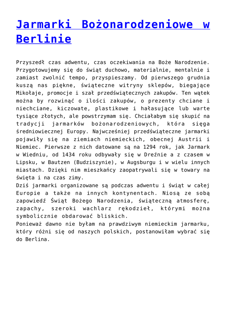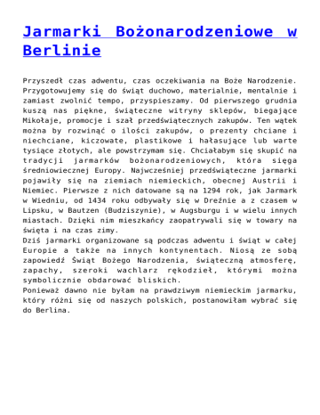 Jarmarki Bożonarodzeniowe w Berlinie Przyszedł czas adwentu, czas oczekiwania na Boże Narodzenie. Przygotowujemy się do świąt duchowo, materialnie, mentalnie i zamiast zwolnić tempo, przyspieszamy. Od pierwszego grudnia kuszą nas piękne, świąteczne witryny sklepów, biegające Mikołaje, promocje i szał przedświątecznych zakupów. Ten wątek można by rozwinąć o ilości zakupów, o prezenty chciane i niechciane, kiczowate, plastikowe i hałasujące lub warte tysiące złotych, ale powstrzymam się. Chciałabym się skupić na tradycji jarmarków bożonarodzeniowych, która sięga średniowiecznej Europy. Najwcześniej przedświąteczne jarmarki pojawiły się na ziemiach niemieckich, obecnej Austrii i Niemiec. Pierwsze z nich datowane są na 1294 rok, jak Jarmark w Wiedniu, od 1434 roku odbywały się w Dreźnie a z czasem w Lipsku, w Bautzen (Budziszynie), w Augsburgu i w wielu innych miastach. Dzięki nim mieszkańcy zaopatrywali się w towary na święta i na czas zimy. Dziś jarmarki organizowane są podczas adwentu i świąt w całej Europie a także na innych kontynentach. Niosą ze sobą zapowiedź Świąt Bożego Narodzenia, świąteczną atmosferę, zapachy, szeroki wachlarz rękodzieł, którymi można symbolicznie obdarować bliskich. Ponieważ dawno nie byłam na prawdziwym niemieckim jarmarku, który różni się od naszych polskich, postanowiłam wybrać się do Berlina. Weihnachtsmarkt am Alexanderplatz W Berlinie takich miejsc, w których odbywają się Jarmarki Bożonarodzeniowe (Weihnachtsmarkt), jest około setki. Rozstawiane są w każdym sławnym i przyciągającym turystów miejscu. Mamy jarmark przy Czerwonym Ratuszu, na Placu Aleksandra, na Placu Poczdamskim, w Sony Centrum, przy Kościele Pamięci, przy dworcu i pod pałacem Charlottenburg. Jedne z nich są bezpłatne, a inne ogrodzone z pobieranym wstępem od 1 do 3 Euro. Jednak te płatne jarmarki mają dość ciekawe zaplecze artystyczne i warto na nich pobyć dłużej. Występują na nich grupy taneczne, teatry ognia, odbywają się koncerty chórów, pokazy żonglerki, można też spotkać akrobatów i szczudlarzy. Polecam Weihnachtsmarkt am Gendarmenmarkt, na którym niestety nie byłam. Z powodu ograniczonego czasu, odwiedziłam tylko kilka bezpłatnych. A ponieważ każdy z nich ma swój niepowtarzalny klimat, ja skupiłam się na rękodziełach. Zerknęłam na drobne prace stolarskie, prace rzeźbiarzy i innych artystów, których wytworem są drewniane świąteczne ozdoby, papierowe lampy, szklane i porcelanowe ręcznie malowane lampiony. W ciągu dnia rozbrzmiewa świąteczna muzyka, wirują karuzele, prażą się migdały, orzeszki, kasztany. Można pojeździć na łyżwach lub pozjeżdżać na pontonach ze sztucznej górki w centrum miasta. Podniebienie kuszą niesamowite zapachy. Będąc w Niemczech należy koniecznie spróbować niemieckich sztrucli, słodyczy, ale i kiełbasek, kapusty i innych smakowitości. Ponieważ nie ma dnia bez słodyczy, zachęcam do skosztowania maślanych choinek z orzechowym nadzieniem, owoców w czekoladzie lub lukrze na patyku, marcepanowych kuli, orzeszków w miodzie lub prażonych z cukrem. Wieczorem kiedy wszystko nabiera blasku i kolorów można napawać się świąteczną atmosferą, popijając Glühwein mit Schuss Rum. Glühwein, to tradycyjny niemiecki grzaniec. Grzane czerwone wino z cukrem, pomarańczą i przyprawami: imbirem oraz goździkami. Świetnie rozgrzewa w zimne grudniowe wieczory, ale i smakuje niebywale. Galeria Handlowa „Arkaden” Weihnachtsmarkt am Potsdamer Platz. MEGA projekty budowlane, czyli jak się dziś buduje? Co zainspirowało mnie do stworzenia takiego wpisu? Przede wszystkim chęć porównania różnych projektów budowlanych odbieranych oczyma zwykłego obywatela i turysty. Nie będę zabawiała się w panią inżynier, bo nią nie jestem, choć zagadnienia z technologii betonów nie są mi obce. Cieszę się, że w naszym kraju ciągle coś się buduje, rozbudowuje i zmienia. Dzięki trafnym decyzjom, pomysłom oraz pozyskiwanym środkom z Unii Europejskiej zmieniło się chyba każde miasto i gmina. Jednak wciąż mamy odczuwalne braki autostrad, obwodnic, mostów, dróg ekspresowych, ba nawet chodników w pobliskich wioskach. Wciąż słyszymy w mediach krytykę, że mamy tyle kilometrów autostrad, a powinno być już więcej. Wyśmiewano i liczono straty zamkniętego lotniska w Modlinie. Jakieś firmy budowlane nie wywiązywały się z kontraktów, inne splajtowały, a przetargi i zapytania do nich przedłużały rozpoczęcie inwestycji na lata. Urzędnicy mieli, mają i będą mieli super wyobraźnię lub jej brak, a niektóre władze marzenia o super projektach, dzięki którym zasłyną i wejdą na szczyt. Słyszymy o nowych lotniskach, tych potrzebnych i niepotrzebnych, o zalanym metrze, o planowaniu Zimowych Igrzysk Olimpijskich, które pogrążyły Kraków, o wpadkach i paradoksach. Czy tylko tak jest w naszym pięknym kraju? Otóż nie! Nasi zachodni sąsiedzi borykają się z wieloma gigantycznymi inwestycjami, które utknęły i pochłonęły ogromne nakłady pieniężne. Choćby budowa Międzynarodowego Portu Lotniczego Berlin- Brandenburgia. Gigantycznego lotniska zastępującego trzy inne w obrębie Berlina. Zamiast lotnisk Schönefeld, Tegel i zamkniętego już lotniska Tempelhof, powstaje jedno wspólne, mające obsługiwać 45 mld pasażerów rocznie. Jego ukończenie zaplanowano trzy lata temu, a budowa wciąż trwa i trwa. Prawdopodobnie przedłuży się do 2017 roku. Budowa wymykająca się z pod kontroli, ze względu na zmiany przepisów i związane z nimi ciągłe przebudowywanie instalacji przeciwpożarowych, zabezpieczeń chroniących przed hałasem. Tysiące pojawiających się kolejnych usterek wywindowały budżet inwestycji z 4,5 mld euro do 8 mld. Ten MEGA projekt, który miał być przepustką do dalszej politycznej kariery burmistrza Berlina Klausa Wowereita, okazał się kompromitu