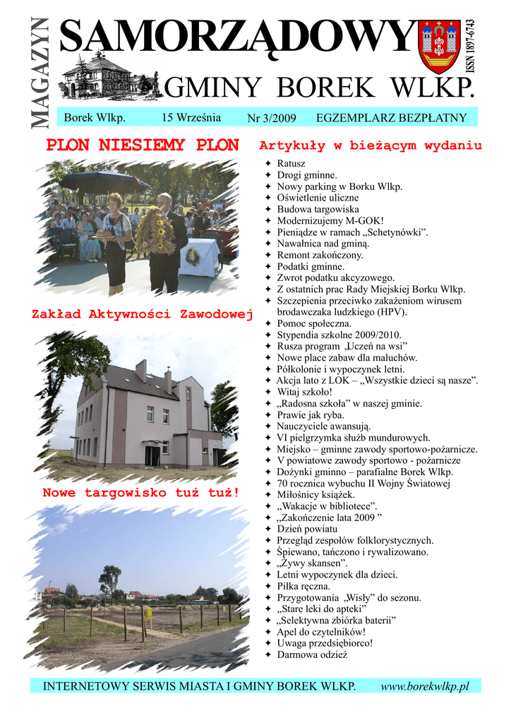 SAMORZĄDOWY GMINY BOREK WLKP. Borek Wlkp. 15 Września Nr 3/2009 PLON NIESIEMY PLON Artykuły w bieżącym wydaniu ✦ ✦ ✦ ✦ ✦ ✦ ✦ ✦ ✦ ✦ ✦ ✦ ✦ Zakład Aktywności Zawodowej Nowe targowisko tuż tuż! EGZEMPLARZ BEZPŁATNY ✦ ✦ ✦ ✦ ✦ ✦ ✦ ✦ ✦ ✦ ✦ ✦ ✦ ✦ ✦ ✦ ✦ ✦ ✦ ✦ ✦ ✦ ✦ ✦ ✦ ✦ ✦ ✦ ✦ ✦ Ratusz Drogi gminne. Nowy parking w Borku Wlkp. Oświetlenie uliczne Budowa targowiska Modernizujemy M-GOK! Pieniądze w ramach „Schetynówki”. Nawałnica nad gminą. Remont zakończony. Podatki gminne. Zwrot podatku akcyzowego. Z ostatnich prac Rady Miejskiej Borku Wlkp. Szczepienia przeciwko zakażeniom wirusem brodawczaka ludzkiego (HPV). Pomoc społeczna. Stypendia szkolne 2009/2010. Rusza program „Uczeń na wsi” Nowe place zabaw dla maluchów. Półkolonie i wypoczynek letni. Akcja lato z LOK – „Wszystkie dzieci są nasze”. Witaj szkoło! „Radosna szkoła” w naszej gminie. Prawie jak ryba. Nauczyciele awansują. VI pielgrzymka służb mundurowych. Miejsko – gminne zawody sportowo-pożarnicze. V powiatowe zawody sportowo - pożarnicze Dożynki gminno – parafialne Borek Wlkp. 70 rocznica wybuchu II Wojny Światowej Miłośnicy książek. „Wakacje w bibliotece”. ,,Zakończenie lata 2009 ” Dzień powiatu Przegląd zespołów folklorystycznych. Śpiewano, tańczono i rywalizowano. „Żywy skansen”. Letni wypoczynek dla dzieci. Piłka ręczna. Przygotowania „Wisły” do sezonu. „Stare leki do apteki” „Selektywna zbiórka baterii” Apel do czytelników! Uwaga przedsiębiorco! Darmowa odzież INTERNETOWY SERWIS MIASTA I GMINY BOREK WLKP. www.borekwlkp.pl Magazyn Samorządowy Gminy Borek Wlkp. RATUSZ Jak Państwo już wiecie od prawie 10 miesięcy trwają prace związane z remontem Ratusza. Na dziś można powiedzieć, że wyszliśmy już z podziemi i prace nabierają widocznego okiem tempa. Wprowadzone zmiany w budynku zostały generalnie dostosowane do lepszej i bardziej dostępnej obsługi klienta. Z uwagi na charakter budynku i braku możliwości dalszej rozbudowy wielkich zmian nie dało się wprowadzić ale wystarczy aby lepiej pracować. Nowością jest winda dla osób niepełnosprawnych i hala operacyjna, w której mieścić się będzie obsługa klienta z wydłużonym czasem pracy oraz stanowiska pracy urzędników, których specyfika pracy wymaga stałego kontaktu z klientem. W samym budynku powiększono salę posiedzeń a pozostałe pomieszczenia biurowe zostały dostosowane do charakteru pracy poszczególnych stanowisk. Zmiany dotyczą również poddasza, który po remoncie nabierze roboczego charakteru. Przebudowano i dostosowano do potrzeb archiwum urzędowego piwnicę. Ratusz jest obiektem zabytkowym otoczonym szczególną opieką konserwatorską a zarazem jest wizytówką naszej bytności. Głównym założeniem współczesnej konserwacji obiektów zabytkowych jest zachowanie w jak największym stopniu substancji zabytkowej. Przed wykonawcą, który prowadzi remont takiego obiektu stawia się bardzo wysokie wymagania. Prace w takich budynkach podlegają innym przepisom niż w obiektach niebędących zabytkami. Tutaj nic nie można wykonać w sposób prosty i nowoczesny. Bawimy się po prostu w odtwarzanie i konserwację. Nie ma co ukrywać, że począwszy od dachu po mury, piwnice, fundamenty i instalacje napotkaliśmy na wiele niespodzianek technicznych, które niewątpliwie nas zaskoczyły. Aby nie wstrzymywać prac należało je szybko rozwiązać tak, aby żadne służby tego nie zakwestionowały. Sporo czasu poświęcamy tej budowie jesteśmy w codziennym i stałym kontakcie z wykonawcą, budową i służbami nadzoru. Pierwsze efekty już są widoczne. Wykonawca uspakaja nas, że to co najgorsze już za nami i roboty będą nabierały tempa. Wkrótce ujrzycie Państwo na ratuszu nowe okna elewację, która budzi zaciekawienie wielu osób i odnowiony stary zegar. Już niewiele czasu zostało do zakończenia zadania ale aby efekt nowego ratusza był widoczny i zadawalający to należy jeszcze coś wykonać. W tym momencie myślimy o ratuszu, który będzie malowany światłem zewnątrz. Obecnie zajmujemy się tą sprawą. Pierwsza próba oświetlenia zostanie wykonana po usunięciu rusztowań z budynku po której to ocenimy jakiego typu i barw oświetlenia nasz ratusz potrzebuje aby cieszył oko. Mamy nadzieję, że do końca roku inwestycja się zakończy i będziemy mogli przedstawić Państwu szczegóły nowego ratusza. DROGI GMINNE. Mieszkańcy Trzecianowa, Wygody i Głoginina doczekali się nowych odcinków dróg gminnych. W Trzecianowie położono dywanik bitumiczny na odcinku 530 mb a także wykonano rów odwadniający na odcinku 230 mb. Koszt tego zadania wyniósł 169.400,42 zł. W Wygodzie położono nową nawierzchnię bitumiczną na odcinku 300 mb za kwotę 84.434,89 zł, a w Głogininie wyremontowano nawierzchnię drogi dywanikiem asfaltowym na odcinku 960 mb za kwotę 250.455,03 zł. Ogółem z tego tytułu Gmina wydatkowała kwotę 504.290,34 zł z czego dofinansowanie FOGR wyniosło 120.000,00 zł. str. 2 NOWY PARKING W BORKU WLKP. Zakończono ostatecznie prace związane z budową długo oczekiwanych miejsc parkingowych wraz z oświetleniem w Borku Wlkp. Nowo powstały parking o powierzchni ponad 1500 m2 przeznaczony jest dla samochodów osobowych o masie do 3, 5 tony i przewiduje 74 miejsca parkingowe. Na ten cel gmina wydała z budżetu własnego 197 263,28 zł brutto. OŚWIETLENIE ULICZNE Ostatnio sporo inwestujemy w oświetlenie uliczne. Choć uporaliśmy się z modernizacją oświetlenia i pierwsze rezultaty są już widoczne to temat ten jest ciągle żywy. Pojawił się następny III etap, który przewiduje budowę linii oświetleniowej czyli dobudowę brakujących słupów i ma stanowić jakby całkowite zaspokojenie potrzeb mieszkańców w tym temacie. Etap końcowy jest najbardziej czasochłonny i potrwa o wiele dłużej niż poprzednie dwa etapy.