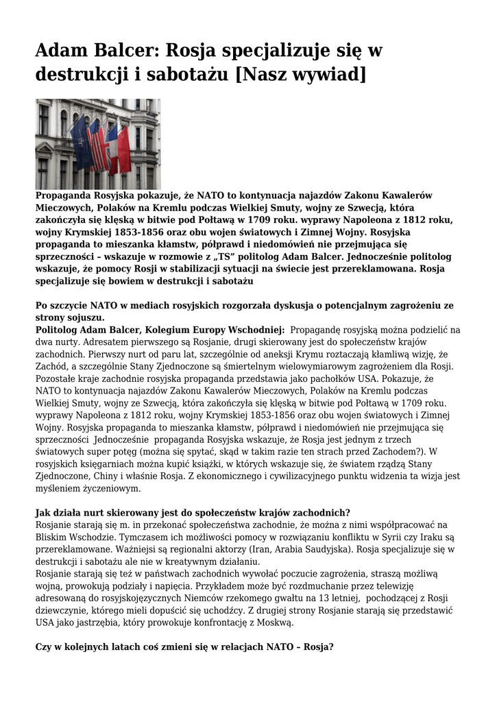 Adam Balcer: Rosja specjalizuje się w destrukcji i sabotażu [Nasz