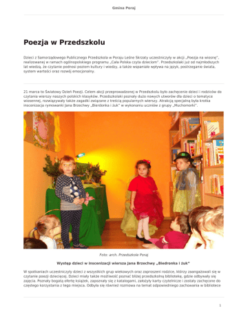 Gmina Poraj Poezja w Przedszkolu Dzieci z Samorządowego Publicznego Przedszkola w Poraju Leśne Skrzaty uczestniczyły w akcji „Poezja na wiosnę”, realizowanej w ramach ogólnopolskiego programu „Cała Polska czyta dzieciom”. Przedszkolaki już od najmłodszych lat wiedzą, że czytanie podnosi poziom kultury i wiedzy, a także wspaniale wpływa na język, postrzeganie świata, system wartości oraz rozwój emocjonalny. 21 marca to Światowy Dzień Poezji. Celem akcji przeprowadzonej w Przedszkolu było zachęcenie dzieci i rodziców do czytania wierszy naszych polskich klasyków. Przedszkolaki poznały dużo nowych utworów dla dzieci o tematyce wiosennej, rozwiązywały także zagadki związane z treścią popularnych wierszy. Atrakcją specjalną była krotka inscenizacja rymowanki Jana Brzechwy „Bierdonka i żuk” w wykonaniu uczniów z grupy „Muchomorki”. Foto: arch. Przedszkole Poraj Występ dzieci w inscenizacji wiersza Jana Brzechwy „Biedronka i żuk” W spotkaniach uczestniczyły dzieci z wszystkich grup wiekowych oraz zaproszeni rodzice, którzy zaangażowali się w czytanie poezji dziecięcej. Dzieci miały także możliwość poznać bliżej przedszkolną bibliotekę, gdzie odbywały się zajęcia. Poznały bogatą ofertę książek, zapoznały się z katalogami, założyły karty czytelnicze i zostały zachęcone do częstego korzystania z tego miejsca. Odbyła się również rozmowa na temat odpowiedniego zachowania w bibliotece 1 Gmina Poraj oraz właściwego traktowania wypożyczonych książek. Osobami odpowiedzialnymi za przedsięwzięcie były: Marta Maślankiewicz, Joanna Makuch oraz Dorota Szulc. Nauczycielki te wierzą, że to także od nich zależy, czy uda im się stworzyć harmonijne, bogate i piękne wnętrze w każdym młodym człowieku uczęszczającym do ich Przedszkola. 2