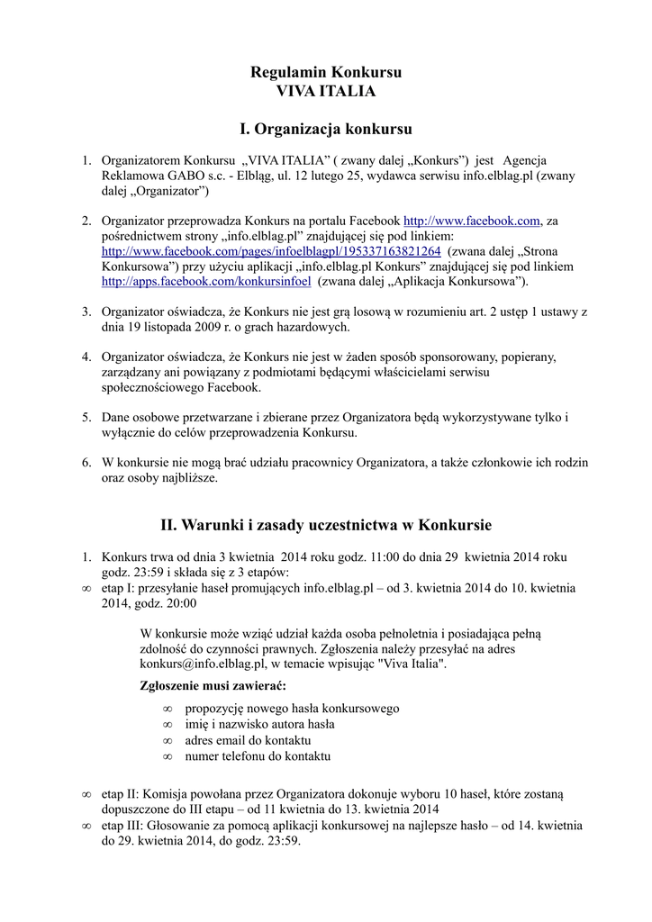 Regulamin Konkursu VIVA ITALIA I. Organizacja konkursu 1. Organizatorem Konkursu „VIVA ITALIA” ( zwany dalej „Konkurs”) jest Agencja Reklamowa GABO s.c. - Elbląg, ul. 12 lutego 25, wydawca serwisu info.elblag.pl (zwany dalej „Organizator”) 2. Organizator przeprowadza Konkurs na portalu Facebook http://www.facebook.com, za pośrednictwem strony „info.elblag.pl” znajdującej się pod linkiem: http://www.facebook.com/pages/infoelblagpl/195337163821264 (zwana dalej „Strona Konkursowa”) przy użyciu aplikacji „info.elblag.pl Konkurs” znajdującej się pod linkiem http://apps.facebook.com/konkursinfoel (zwana dalej „Aplikacja Konkursowa”). 3. Organizator oświadcza, że Konkurs nie jest grą losową w rozumieniu art. 2 ustęp 1 ustawy z dnia 19 listopada 2009 r. o grach hazardowych. 4. Organizator oświadcza, że Konkurs nie jest w żaden sposób sponsorowany, popierany, zarządzany ani powiązany z podmiotami będącymi właścicielami serwisu społecznościowego Facebook. 5. Dane osobowe przetwarzane i zbierane przez Organizatora będą wykorzystywane tylko i wyłącznie do celów przeprowadzenia Konkursu. 6. W konkursie nie mogą brać udziału pracownicy Organizatora, a także członkowie ich rodzin oraz osoby najbliższe. II. Warunki i zasady uczestnictwa w Konkursie 1. Konkurs trwa od dnia 3 kwietnia 2014 roku godz. 11:00 do dnia 29 kwietnia 2014 roku godz. 23:59 i składa się z 3 etapów: • etap I: przesyłanie haseł promujących info.elblag.pl – od 3. kwietnia 2014 do 10. kwietnia 2014, godz. 20:00 W konkursie może wziąć udział każda osoba pełnoletnia i posiadająca pełną zdolność do czynności prawnych. Zgłoszenia należy przesyłać na adres [email protected], w temacie wpisując "Viva Italia". Zgłoszenie musi zawierać: • • • • • • propozycję nowego hasła konkursowego imię i nazwisko autora hasła adres email do kontaktu numer telefonu do kontaktu etap II: Komisja powołana przez Organizatora dokonuje wyboru 10 haseł, które zostaną dopuszczone do III etapu – od 11 kwietnia do 13. kwietnia 2014 etap III: Głosowanie za pomocą aplikacji konkursowej na najlepsze hasło – od 14. kwietnia do 29. kwietnia 2014, do godz. 23:59. 3. Uczestnikami Konkursu są osoby, które w czasie trwania Konkursu ułożą autorskie hasło reklamowe dla info.elblag.pl,związane z jubileuszem 10-lecia istnienia oraz wyślą hasło pocztą elektroniczną pod adres [email protected] 4. Uczestnik Konkursu poprzez wysłanie e-maila z autorskim hasłem reklamowym wyraża jednocześnie zgodę na wyłączne używanie tego hasła przez Organizatora konkursu na czas nieokreślony i przekazuje Organizatorowi wszelkie prawa autorskie związane z wysłanym hasłem. 5. Jeden Uczestnik może wysłać jedno hasło reklamowe. 6. Organizator nie zezwala na: a) kupowanie głosów b) zakładania fikcyjnych kont w celu głosowania Po stwierdzeniu przypadków wymienionych w pkt 6. Organizator zastrzega sobie prawo do odrzucenia nieuczciwie zdobytych głosów oraz wykluczenia uczestnika z konkursu. 7. Na hasła konkursowe głosują użytkownicy serwisu facebook.com poprzez Aplikację Konkursową 8. Na każde hasło użytkownik może oddać jeden głos. 9. Wygrywa Uczestnik, którego hasło uzyska największą ilość głosów. 10. W przypadku, gdy dwa lub więcej haseł uzyska tę samą ilość głosów o zwycięstwie decyduje kolejność zgłoszenia hasła do konkursu (Uczestnik, który przesłał hasło jako pierwszy wygrywa). III. Nagrody 1. Nagrodą w konkursie jest wycieczka objazdowa po Italii dla dwóch osób o wartości 2500 zł. W ramach wycieczki ( wyjazd z Polski 31 maja), będzie można zwiedzić Wenecję (rejs na Plac Św. Marka), San Marino ( najstarszą Republikę świata), Asyż (miasto Św. Franciszka), Rzym (stolicę Italii), Watykan (Stolicę Piotrowa) oraz Florencję (miasto renesansu). 2. Zwycięzca konkursu zostanie poinformowany o wygranej poprzez wiadomość e-mail oraz telefonicznie. W informacji będzie zawarty termin odbioru nagrody. 3. W przypadku, gdy zwycięzca nie odbierze nagrody w podanym terminie lub zrezygnuje z nagrody – nagroda zostanie przyznana kolejnej osobie (Uczestnikowi Konkursu) z największą ilością zdobytych głosów. 4. Nagroda nie podlega wymianie na gotówkę oraz na inną nagrodę 5. Organizator zastrzega sobie, że zwycięzca Konkursu nie może przenosić praw z wygranej Nagrody na osoby trzecie. 6. Koszty związane z uzyskaniem nagrody, zgodnie z art. 21 ust. 1 pkt 68 i art. 30 ust. 1 pkt. 2 ustawy z dnia 26 lipca 1991r. o podatku dochodowym od osób fizycznych (Dz.U. 1991 Nr 80 poz. 350 z późn. zm.) pokrywa Uczestnik – zwycięzca Konkursu. Należny podatek zostanie pobrany przez Organizatora przed wręczeniem nagrody w postaci vouchera. IV. Postanowienia końcowe 1. Niniejszy Regulamin jest dostępny w przez cały okres trwania Konkursu na Stronie Konkursowej oraz w Aplikacji Konkursowej, z zastrzeżeniem sytuacji w których nastąpi awaria Serwisu Facebook. 2. Regulamin Konkursu jest także dostępny do wglądu w siedzibie Organizatora. 3. Organizator zastrzega sobie prawo do dokonania zmian Regulaminu Konkursu z ważnych powodów, w każdym czasie, w szczególności do przedłużenia, skrócenia lub zawieszenia Konkursu. 4. Organizator zobowiązuje się, że w przypadku zmian w Regulaminie, zmiany te nie będą naruszać praw już nabytych przez Uczestników oraz nie będą pogarszać warunków Konkursu. 5. Reklamacje należy przesyłać pisemnie w terminie 14 dni od momentu ogłoszenia wyników 6. Reklamacje winny być przesyłane pocztą na adres Organizatora i zawierać imię, nazwisko i adres zgłaszającego reklamację oraz jej krótki opis. 7. Regulamin Konkursu wchodzi w życie z dniem rozpoczęcia Konkursu. Wydawca Elbląskiego Dziennika Internetowego info.elblag.pl