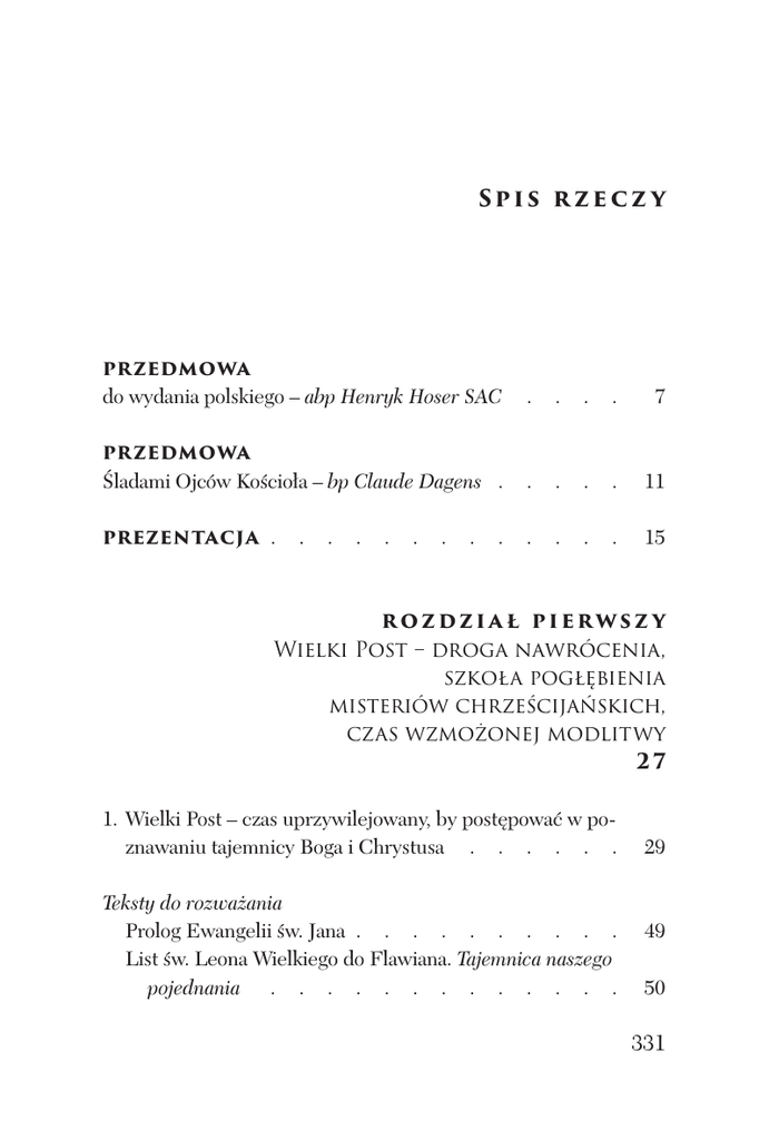 Spis r zecz y przed mo wa do wydania polskiego – abp Henryk Hoser SAC . . . . 7 Śladami Ojców Kościoła – bp Claude Dagens . . . . . 11 prezentacja . . . . . 15 przed mo wa . . . . . . . . rozdział pierwsz y Wielki Post – droga nawrócenia, szkoła pogłębienia misteriów chrześcijańskich, czas wzmożonej modlitwy 27 1. Wielki Post – czas uprzywilejowany, by postępować w poznawaniu tajemnicy Boga i Chrystusa . . . . . . Teksty do rozważania Prolog Ewangelii św. Jana . . . . . . . . . . List św. Leona Wielkiego do Flawiana. Tajemnica naszego pojednania . . . . . . . . . . . . . 29 49 50 331 List św. Atanazego, biskupa, do Serapiona. Światłość, chwała i łaska w Trójcy i od Trójcy . . . . . . . . 52 2. Wielki Post – czas sprzyjający, by odkryć na nowo tajemnicę Krzyża . . . . . . . . . . . . . . . 54 Teksty do rozważania Kazanie św. Cezarego z Arles. O Modlitwie Pańskiej oraz o miłości nieprzyjaciół . . . . . . . . . . Kazanie św. Piotra Chryzologa, biskupa. Bądź kapłanem Boga i Jego ofiarą . . . . . . . . . . . 69 3. Wielki Post – czas łaski, by mocniej zgłębić Mysterium Fidei, tajemnicę Eucharystii . . . . . . . . . . 72 Teksty do rozważania Katecheza chrzcielna św. Jana Chryzostoma. Mojżesz i Chrystus . . . . . . . . . . . . . . Z traktatu św. Gaudencjusza, biskupa Bresci. Eucharystia jest Paschą Pana . . . . . . . . . . . . 4. Wielki Post – czas, by karmić się Słowem Bożym . Słowo Boże jest zwierciadłem naszej duszy . . . „Polecam was Bogu i słowu Jego łaski” (Dz 20, 32) . . . . 68 94 96 . 98 . 98 . 114 Teksty do rozważania Św. Efrem, diakon, Komentarz do czterech Ewangelii. Słowo Boże niewyczerpanym źródłem życia . . . . . 131 Św. Ambroży, biskup, Z komentarza do Psalmów. Otwórz twe usta na słowo Boga . . . . . . . . . . 132 332 rozdział drugi Najważniejsze zadania biskupów i prezbiterów i wzory do naśladowania w ich misji duszpasterskiej 135 1. Jak Mojżesz prowadzić lud Boży do góry Przymierza . . 2. Z Jonaszem w drodze do Niniwy . . . . . . . . 3. Głos wołający na pustyni . . . . . . . . . . 4. Jezus pierwszym penitentem, „bo tak godzi się nam wypełnić wszystko, co sprawiedliwe” (Mt 3, 15) . . . . . 137 161 172 183 Teksty do rozważania Homilia św. Jana Chryzostoma. Modlitwa światłem duszy 203 Z katechezy o modlitwie św. Jana Marii Vianneya. Błogosławiona powinność człowieka: modlić się i miłować . 205 rozdział tr zeci Wielki Post – walka, by doprowadzić do śmierci starego człowieka i przyoblec się w człowieka nowego 207 1. Wielki Post 1997 . . . . . . . . . . . . . 222 Wielki Post – czas, by zmienić swoje serce i zwalczyć grzech 222 Jak Mojżesz, idący czterdzieści lat przez pustynię, przeżywamy czterdzieści dni postu i pokuty, aby doświadczyć swojej biedy i Bożego dobrodziejstwa . . . . . 225 333 Wielki Post – czas, który nas przygotowuje do przyjęcia tablic Nowego Przymierza . . . . . . . . . Wielki Post – czas dzielenia się i solidarności z najuboższymi spośród naszych braci . . . . . . . . . Wielki Post – zaproszenie do przyjęcia Słowa Bożego – Źródła Życia . . . . . . . . . . . . . . Wielki Post – wewnętrzny exodus, w którym umacniają nas sakramenty (Pojednanie, Eucharystia) . . . . . 231 239 243 246 Teksty do rozważania Św. Jan Chryzostom, Homilia do Ewangelii św. Mateusza. Przyozdabiaj świątynię, ale nie zapominaj o potrzebującym 250 Z komentarza św. Augustyna, biskupa, do Ewangelii św. Jana. Podwójne przykazanie miłości . . . . . . . 252 2. Wielki Post 1999 . . . . . . . . . . . . . Bóg jest Ojcem pełnym czułości i miłosierdzia . . . . Jezus – widzialna i namacalna Obecność Boga Miłości oraz objawienie Miłosierdzia Bożego . . . . . . . „Bądźcie naśladowcami moimi, tak jak ja jestem naśladowcą Chrystusa” (1 Kor 11, 1) . . . . . . . . . Eucharystia – sakrament miłości, przebaczenia i pojednania 254 255 261 267 271 3. Wielki Post 2000 . . . . . . . . . . . . . 277 Wielki Post: droga powrotna syna marnotrawnego do domu Ojca . . . . . . . . . . . . . . . 277 4. Wielki Post 2001 – „…jak Pan wybaczył wam, tak i wy” (Kol 3, 13) . . . . . . . . . . . . . . 286 Wielki Post jako wezwanie do świętości i do życia braterskiego . . . . . . . . . . . . . . . 287 Wielki Post – szkoła, która uczy przedłużać misję Jezusa . 291 334 Wielki Post – szczególny czas, by z godnością i szacunkiem wielbić wielkość i świętość Boga . . . . . . . 295 Wielki Post – czas wielkiej bitwy, w której naszą bronią jest Słowo Boże . . . . . . . . . . . . . 300 Teksty do rozważania Z Ewangelii św. Mateusza . . . . . . . . . . 303 Św. Cyprian, O Modlitwie Pańskiej. Modlitwa niechaj płynie z pokornego serca . . . . . . . . . . 304 rozdział czwarty Ziemia obiecana 307 335
