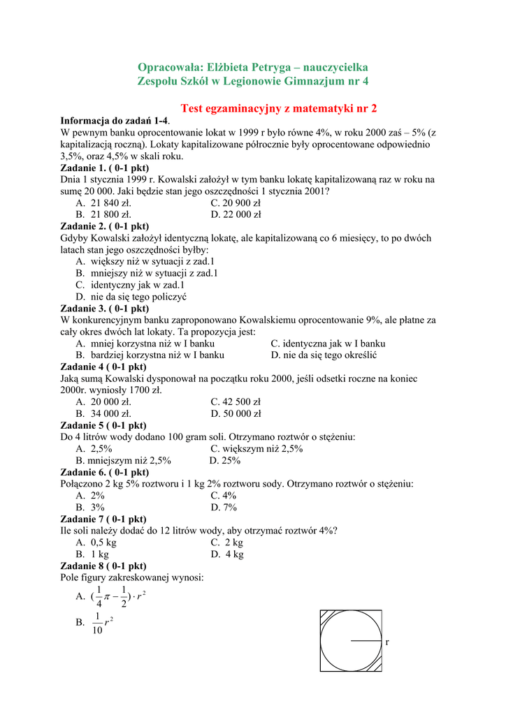 Opracowała: Elżbieta Petryga – nauczycielka Zespołu Szkół w Legionowie Gimnazjum nr 4 Test egzaminacyjny z matematyki nr 2 Informacja do zadań 1-4. W pewnym banku oprocentowanie lokat w 1999 r było równe 4%, w roku 2000 zaś – 5% (z kapitalizacją roczną). Lokaty kapitalizowane półrocznie były oprocentowane odpowiednio 3,5%, oraz 4,5% w skali roku. Zadanie 1. ( 0-1 pkt) Dnia 1 stycznia 1999 r. Kowalski założył w tym banku lokatę kapitalizowaną raz w roku na sumę 20 000. Jaki będzie stan jego oszczędności 1 stycznia 2001? A. 21 840 zł. C. 20 900 zł B. 21 800 zł. D. 22 000 zł Zadanie 2. ( 0-1 pkt) Gdyby Kowalski założył identyczną lokatę, ale kapitalizowaną co 6 miesięcy, to po dwóch latach stan jego oszczędności byłby: A. większy niż w sytuacji z zad.1 B. mniejszy niż w sytuacji z zad.1 C. identyczny jak w zad.1 D. nie da się tego policzyć Zadanie 3. ( 0-1 pkt) W konkurencyjnym banku zaproponowano Kowalskiemu oprocentowanie 9%, ale płatne za cały okres dwóch lat lokaty. Ta propozycja jest: A. mniej korzystna niż w I banku C. identyczna jak w I banku B. bardziej korzystna niż w I banku D. nie da się tego określić Zadanie 4 ( 0-1 pkt) Jaką sumą Kowalski dysponował na początku roku 2000, jeśli odsetki roczne na koniec 2000r. wyniosły 1700 zł. A. 20 000 zł. C. 42 500 zł B. 34 000 zł. D. 50 000 zł Zadanie 5 ( 0-1 pkt) Do 4 litrów wody dodano 100 gram soli. Otrzymano roztwór o stężeniu: A. 2,5% C. większym niż 2,5% B. mniejszym niż 2,5% D. 25% Zadanie 6. ( 0-1 pkt) Połączono 2 kg 5% roztworu i 1 kg 2% roztworu sody. Otrzymano roztwór o stężeniu: A. 2% C. 4% B. 3% D. 7% Zadanie 7 ( 0-1 pkt) Ile soli należy dodać do 12 litrów wody, aby otrzymać roztwór 4%? A. 0,5 kg C. 2 kg B. 1 kg D. 4 kg Zadanie 8 ( 0-1 pkt) Pole figury zakreskowanej wynosi: 1 1 A. ( π − ) ⋅ r 2 4 2 1 2 B. r 10 r 1 (4 − π ) ⋅ r 2 2 π ⋅ r2 3 D. 2 Rysunek do zadań 9-11 Zadanie 9 ( 0-1 pkt) Y Na rysunku przedstawiony jest wykres funkcji: A. y = - 3x +2 B. y = 3x - 2 2 3 C. y = - x -3 X 2 2 D. y = - x 3 Zadanie 10 ( 0-1 pkt) Funkcja przedstawiona na rysunku przyjmuje wartości ujemne dla argumentów w przedziale: A. < - 3, 0 ) C. ( 0, ∞ ) D. ( - ∞, 0 ) B. (- ∞, 0 ) Zadanie 11. ( 0-1 pkt) Do wykresu tej funkcji należy punkt: A. ( 2, - 5 ) B. ( 3 2 , - 2 2 ) C. ( - 4, 2 ) D. ( 6, - 6 ) Zadanie 12 ( 0-2 pkt) Wyznacz dwie pary liczb przeciwnych, które spełniają nierówność (2 x − 1)( x − 2) - 2( 3 – x )( 3 + x ) < 3x2 - 2( 5x + 1 ) 2 Zadanie 13. ( 0-2 pkt) Towar opodatkowany podatkiem VAT w wysokości 7% kosztuje 160 zł 50 gr. Oblicz cenę tego towaru po zmianie stawki podatku VAT do wysokości 22%. Zadanie 14 ( 0-2 pkt) Oblicz długość boku kwadratu ABCD, jeżeli kwadrat o boku dłuższym o 15 cm ma pole większe od pola kwadratu ABCD o 285 cm2. Zadanie 15. ( 0-2 pkt) Wyznacz y ze wzoru: 1 1 1 + = x y +1 z Zadanie 16. ( 0-2 pkt) Oblicz 60% wartości wyrażenia: 1 1 2 − (−3) 2 : 1 2 4 −5 Zadanie 17. ( 0-2 pkt) Oblicz : - 12 + 48 - 75 + 27 C. Zadanie 18. ( 0-2 pkt) Obwód równoległoboku jest równy 36 cm, a jego pole 60 cm2. Jedna z wysokości ma długość 6 cm. Oblicz długość boków tego równoległoboku. Zadanie 19. ( 0-2 pkt) Oblicz obwód trapezu równoramiennego opisanego na okręgu o promieniu 2 cm wiedząc, że kąt ostry trapezu ma miarę 30°. Zad. 1 pkt 2 3 4 5 6 7 8 Razem: ................ Liczba punktów Ocena 27 24 – 26 20 – 23 13 – 19 9 – 12 0-8 celujący bardzo dobry dobry dostateczny dopuszczający niedostateczny 9 10 11 12 13 14 15 16 17 18 19