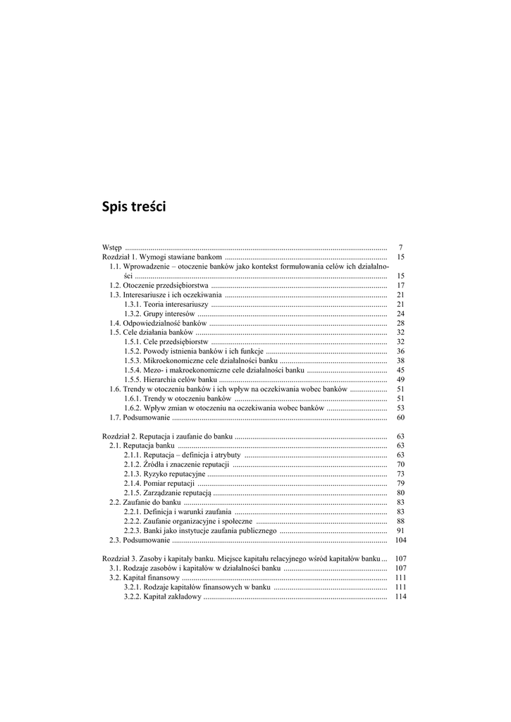 Spis treści Wstęp ...................................................................................................................................... Rozdział 1. Wymogi stawiane bankom ................................................................................... 1.1. Wprowadzenie – otoczenie banków jako kontekst formułowania celów ich działalności ................................................................................................................................. 1.2. Otoczenie przedsiębiorstwa .......................................................................................... 1.3. Interesariusze i ich oczekiwania ................................................................................... 1.3.1. Teoria interesariuszy .......................................................................................... 1.3.2. Grupy interesów ................................................................................................. 1.4. Odpowiedzialność banków ........................................................................................... 1.5. Cele działania banków .................................................................................................. 1.5.1. Cele przedsiębiorstw .......................................................................................... 1.5.2. Powody istnienia banków i ich funkcje .............................................................. 1.5.3. Mikroekonomiczne cele działalności banku ....................................................... 1.5.4. Mezo- i makroekonomiczne cele działalności banku ......................................... 1.5.5. Hierarchia celów banku ...................................................................................... 1.6. Trendy w otoczeniu banków i ich wpływ na oczekiwania wobec banków ................... 1.6.1. Trendy w otoczeniu banków .............................................................................. 1.6.2. Wpływ zmian w otoczeniu na oczekiwania wobec banków ............................... 1.7. Podsumowanie .............................................................................................................. 7 15 Rozdział 2. Reputacja i zaufanie do banku .............................................................................. 2.1. Reputacja banku ........................................................................................................... 2.1.1. Reputacja – definicja i atrybuty ......................................................................... 2.1.2. Źródła i znaczenie reputacji ............................................................................... 2.1.3. Ryzyko reputacyjne ............................................................................................ 2.1.4. Pomiar reputacji ................................................................................................. 2.1.5. Zarządzanie reputacją ......................................................................................... 2.2. Zaufanie do banku ........................................................................................................ 2.2.1. Definicja i warunki zaufania .............................................................................. 2.2.2. Zaufanie organizacyjne i społeczne ................................................................... 2.2.3. Banki jako instytucje zaufania publicznego ....................................................... 2.3. Podsumowanie .............................................................................................................. 63 63 63 70 73 79 80 83 83 88 91 104 Rozdział 3. Zasoby i kapitały banku. Miejsce kapitału relacyjnego wśród kapitałów banku ... 3.1. Rodzaje zasobów i kapitałów w działalności banku ..................................................... 3.2. Kapitał finansowy ......................................................................................................... 3.2.1. Rodzaje kapitałów finansowych w banku .......................................................... 3.2.2. Kapitał zakładowy .............................................................................................. 107 107 111 111 114 15 17 21 21 24 28 32 32 36 38 45 49 51 51 53 60 6 Kształtowanie relacji banku z otoczeniem 3.2.3. Kapitał regulacyjny ............................................................................................ 3.2.4. Kapitał ekonomiczny (wewnętrzny) .................................................................. 3.2.5. Kapitał księgowy ................................................................................................ 3.3. Kapitał intelektualny ..................................................................................................... 3.3.1. Istota kapitału intelektualnego przedsiębiorstwa ................................................ 3.3.2. Kształtowanie kapitału intelektualnego .............................................................. 3.3.3. Kapitał intelektualny banków ............................................................................. 3.4. Kapitał społeczny ......................................................................................................... 3.4.1. Definicje i istota kapitału społecznego ............................................................... 3.4.2. Kapitał społeczny banku .................................................................................... 3.4.3. Kapitał społeczny a kapitał intelektualny ........................................................... 3.5. Istota kapitału relacyjnego banku ................................................................................. 3.6. Podsumowanie .............................................................................................................. 116 117 119 124 124 131 135 137 137 146 150 152 160 Rozdział 4. Zarządzani