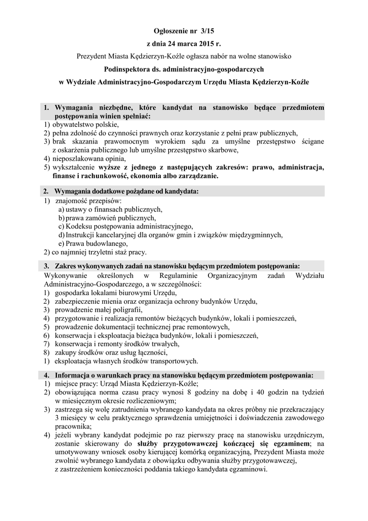 Ogłoszenie nr 3/15 z dnia 24 marca 2015 r. Prezydent Miasta Kędzierzyn-Koźle ogłasza nabór na wolne stanowisko Podinspektora ds. administracyjno-gospodarczych w Wydziale Administracyjno-Gospodarczym Urzędu Miasta Kędzierzyn-Koźle 1. Wymagania niezbędne, które kandydat na stanowisko będące przedmiotem postępowania winien spełniać: 1) obywatelstwo polskie, 2) pełna zdolność do czynności prawnych oraz korzystanie z pełni praw publicznych, 3) brak skazania prawomocnym wyrokiem sądu za umyślne przestępstwo ścigane z oskarżenia publicznego lub umyślne przestępstwo skarbowe, 4) nieposzlakowana opinia, 5) wykształcenie wyższe z jednego z następujących zakresów: prawo, administracja, finanse i rachunkowość, ekonomia albo zarządzanie. 2. Wymagania dodatkowe pożądane od kandydata: 1) znajomość przepisów: a) ustawy o finansach publicznych, b) prawa zamówień publicznych, c) Kodeksu postępowania administracyjnego, d) Instrukcji kancelaryjnej dla organów gmin i związków międzygminnych, e) Prawa budowlanego, 2) co najmniej trzyletni staż pracy. 3. Zakres wykonywanych zadań na stanowisku będącym przedmiotem postępowania: Wykonywanie określonych w Regulaminie Organizacyjnym zadań Wydziału Administracyjno-Gospodarczego, a w szczególności: 1) gospodarka lokalami biurowymi Urzędu, 2) zabezpieczenie mienia oraz organizacja ochrony budynków Urzędu, 3) prowadzenie małej poligrafii, 4) przygotowanie i realizacja remontów bieżących budynków, lokali i pomieszczeń, 5) prowadzenie dokumentacji technicznej prac remontowych, 6) konserwacja i eksploatacja bieżąca budynków, lokali i pomieszczeń, 7) konserwacja i remonty środków trwałych, 8) zakupy środków oraz usług łączności, 1) eksploatacja własnych środków transportowych. 4. Informacja o warunkach pracy na stanowisku będącym przedmiotem postępowania: 1) miejsce pracy: Urząd Miasta Kędzierzyn-Koźle; 2) obowiązująca norma czasu pracy wynosi 8 godziny na dobę i 40 godzin na tydzień w miesięcznym okresie rozliczeniowym; 3) zastrzega się wolę zatrudnienia wybranego kandydata na okres próbny nie przekraczający 3 miesięcy w celu praktycznego sprawdzenia umiejętności i doświadczenia zawodowego pracownika; 4) jeżeli wybrany kandydat podejmie po raz pierwszy pracę na stanowisku urzędniczym, zostanie skierowany do służby przygotowawczej kończącej się egzaminem; na umotywowany wniosek osoby kierującej komórką organizacyjną, Prezydent Miasta może zwolnić wybranego kandydata z obowiązku odbywania służby przygotowawczej, z zastrzeżeniem konieczności poddania takiego kandydata egzaminowi. 5. Dokumenty wymagane w ofertach pracy składanych przez kandydatów: 1) życiorys zawodowy zawierający wykaz wszystkich dotychczasowych miejsc pracy kandydata z wyszczególnieniem stażu pracy w tych miejscach oraz przebieg nauki z wyszczególnieniem wszystkich ukończonych szkół i uczelni; 2) list motywacyjny; 3) kopia lub odpis dokumentów potwierdzających: a) wykształcenie (dyplom ukończenia szkoły wyższej), b) staż pracy (np. świadectw pracy), c) posiadane kwalifikacje i umiejętności (dyplomów, zaświadczeń itp.), d) niepełnosprawność, w przypadku kandydatów, którzy zamierzają skorzystać z uprawnienia do pierwszeństwa do zatrudnienia na stanowiskach urzędniczych, z wyłączeniem kierowniczych stanowisk urzędniczych; 4) oświadczenie o niekaralności za umyślne przestępstwa ścigane z oskarżenia publicznego lub umyślne przestępstwa skarbowe (wybrany kandydat zobowiązany będzie do przedłożenia zaświadczenia o niekaralności wydanego przez Krajowy Rejestr Karny); 5) oświadczenie o posiadaniu przez kandydata pełni praw publicznych. pobierz druk oświadczeń » Załączone: list motywacyjny i życiorys powinny być opatrzone następującą klauzulą: „Wyrażam zgodę na: 1) przetwarzanie moich danych osobowych zawartych w ofercie pracy, 2) przeprowadzenie wywiadu środowiskowego w dotychczasowych miejscach mojej pracy i nauki w celu potwierdzenia spełniania warunku posiadania przeze mnie nieposzlakowanej opinii, dla potrzeb procesu naboru na stanowisko Podinspektora ds. administracyjno-gospodarczych w Wydziale Administracyjno-Gospodarczym Urzędu Miasta Kędzierzyn-Koźle prowadzonego zgodnie z przepisami ustawy z dnia 21 listopada 2008 r. o pracownikach samorządowych (Dz.U. z 2014 r. poz. 1202); 6) komisja powołana do zaopiniowania kandydatów na stanowisko Podinspektora ds. administracyjno-gospodarczych w Wydziale Administracyjno-Gospodarczym Urzędu Miasta Kędzierzyn-Koźle uprawniona będzie do ewentualnego żądania dostarczenia brakujących lub uzupełnienia dokumentów złożonych w ofercie pracy w trakcie trwania procesu naboru. 6. Przebieg postępowania: Etap pierwszy: 1) ofertę pracy zawierającą wymagane dokumenty należy składać w kopercie z dopiskiem „Oferta pracy - nabór na stanowisko Podinspektora ds. administracyjno-gospodarczych w Wydziale Administracyjno-Gospodarczym Urzędu Miasta Kędzierzyn-Koźle” osobiście w siedzibie Urzędu Miasta Kędzierzyn-Koźle ul. Piramowicza 32 w Kancelarii Ogólnej Urzędu Miasta – pokój 139 w godz. 800 - 1500 lub pocztą w terminie do dnia 7.04.2015 r.; Oferty pracy, które wpłyną do urzędu po wyżej określonym terminie, nie będą rozpatrywane; 2) postępowanie w sprawie naboru będzie prowadzone w oparciu o przepisy ustawy z dnia 21 listopada 2008 r. o pracownikach samorządowych (Dz.U. z 2014 r. poz. 1202); 3) komisja powołana do zaopiniowania kandydatów, zwana dalej Komisją, na podstawie złożonych ofert dokona oceny spełniania przez kandydatów wymagań niezbędnych; 4) po upływie terminu do złożenia ofert pracy na stronie podmiotowej Urzędu Miasta Kędzierzyn-Koźle Biuletynu Informacji Publicznej – www.bip.kedzierzynkozle.pl w menu „Ogłoszenia” zakładka „Praca w Urzędzie Miasta” upowszechniona zostanie informacja o terminie rozmów kwalifikacyj