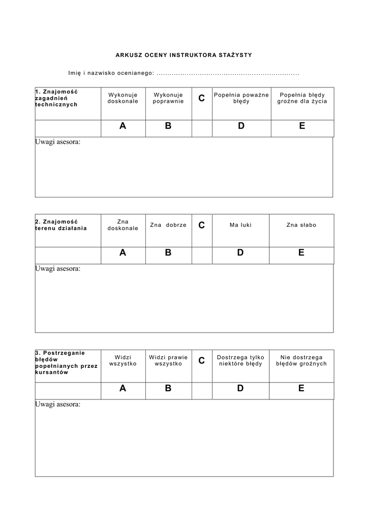 AR K U S Z O C E N Y I N S T R U K TO R A S TAŻ Y S T Y I m i ę i n a z wi s k o o c e n i a n e g o : . . . . . . . . . . . . . . . . . . . . . . . . . . . . . . . . . . . . . . . . . . . . . . . . . . . . . . . . . . . . . . . . . . 1. Znajomość zagadnień technicznych W yk o n u j e doskonale Wykonuje p o p r a wn i e A B Zna doskonale Zna dobrze A B Widzi ws z y s t k o W i d z i p r a wi e ws z y s t k o A B C P o p e ł n i a p o wa ż n e błędy Popełnia błędy g r o ź n e d l a ż yc i a D E Ma luki Zna słabo D E D o s t r z e g a t yl k o niektóre błędy Nie dostrzega b ł ę d ó w g r o ź n yc h D E Uwagi asesora: 2. Znajomość terenu działania C Uwagi asesora: 3. Postrzeganie błędów popełnianych przez k u r s a n t ów Uwagi asesora: C 4 . K o r y g ow a n i e b ł ę d ó w k u r s a n t ów W z o r o wo w odpowi e d n i m czasie K o r yg u j e dobrze wi ę k s z o ś ć błędów A B Szkoli bardzo bezpiecznie Szkoli bezpiecznie A B Tłumaczy wybornie i skutecznie Tłumaczy p o p r a wn i e A B C K o r yg u j e wybiórczo lub w z ł ym m o m e n c i e K o r yg u j e ź l e D E Zdarzają się s yt u a c j e niebezpieczne P r o wo k u j e s yt u a c j e niebezpieczne D E Uwagi asesora: 5 . B e z p i e c z e ń s tw o szkolenia C Uwagi asesora: 6. Umiejętności pedagogiczne Uwagi asesora: C Tłumaczy nie z a ws z e p o p r a wn i e Tłumaczy albo źle albo nie potrafi przekonać D E 7 . Z a d ow o l e n i e k u r s a n t ów Kursanci z a c h wy c e n i Kursanci z a d o wo l e n i A B Kapitan na pokładzie Duży autorytet A Kursanci znudzeni Kursanci z e s t r e s o wa n i D E N i e w ys t a r c z a - j ą c y a u t o r yt e t B r a k a u t o r yt e t u B D E Doskonała prezencja Dobra prezencja Budzi k o n t r o we r s j e s wo i m wy g l ą d e m N i e p r z yp o m i n a instruktora A B D E C Uwagi asesora: 8 . Au t o r y t e t instruktorski C Uwagi asesora: 9. Wizerunek instruktorski (image) Uwagi asesora: C 10. Współpraca z asesorem Doskonała ws p ó ł p r a c a Dobra ws p ó ł p r a c a A B C Słaby kontakt Zły kontakt D E Uwagi asesora: OCENA KOŃCOWA A B C+ C- D E OPINIA/UZASADNIENIE Imię nazwisko i podpis asesora: ........................................................ Miejsce i data ...................................................................................... Oceniamy na skali od A (wzorowo) do E (najgorzej). Ocena C oznacza remis ze wskazaniem. Musi zawierać znak „+” (zalicza) lub „-” (nie zalicza). W przypadku oceny „C” należy obowiązkowo wpisać uwagi. W$