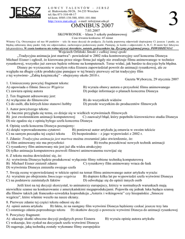 ŁOWCY TALENTÓW – JERSZ ul. Białowieska 50/26, 54-235 Wrocław tel./fax 071-310-48-17 tel.kom. 0505-138-588, 0501-101-866 http://www.mat.edu.pl, e-mail: [email protected] OMNIBUS 2007 7.03.2007 SKOWRONEK – klasa 3 szkoły podstawowej 3 Czas trwania konkursu: 45 minut Witamy Cię. Otrzymujesz od nas 88 punktów – tyle ile masz decyzji do podjęcia. Za każdą poprawną odpowiedź dopisujemy Ci jeszcze 1 punkt, za błędną zabieramy dany punkt. Gdy nie odpowiadasz, zachowujesz podarowany punkt. Pamiętaj, że każda z odpowiedzi A, B, C, D może być fałszywa lub prawdziwa. W czasie konkursu nie wolno używać słowników, notatek, podręczników itp. Życzymy przyjemnej pracy. POWODZENIA! Wojciech Orliński Smoki z całkiej innej epoki „Tradycyjna animacja jest martwa”- powiedział w 2002 roku kontrowersyjny szef koncernu Disneya Michael Eisner i ogłosił, że kierowana przez niego firma już nigdy nie zrealizuje filmu animowanego w technice rysunkowej, wszystko już zawsze będzie robione na komputerach. Teraz widać, jak bardzo ta decyzja była błędna. Disney po wyrzuceniu w zeszłym roku Eisnera zapowiedział powrót do animacji rysunkowej, ale ze względu na długie cykle produkcyjne panujące w tej branży pierwszy od lat tradycyjny film z tej wytwórni- „Żabią księżniczkę” - obejrzymy około 2010 r. Gazeta Wyborcza, 29 stycznia 2007 1. Umieszczony powyżej fragment tekstu: A) opowiada o filmie Smocze Wzgórze B) wyraża obawy autora o przyszłość filmu animowanego C) zawiera opinię autora D) podaje informacje o planach koncernu Disneya 2. Ten fragment adresowany jest: A) wyłącznie do filmowców B) do wszystkich widzów C) do osób, dla których kino stanowi hobby D) przede wszystkim do producentów filmowych 3. Autor powyższego tekstu: A) bacznie przygląda się temu, co dzieje się w wielkich wytwórniach filmowych B) jest zwolennikiem animacji komputerowej C) zauważył błąd, który popełniło kierownictwo studia Disneya D) nie zgadza się z opinią byłego szefa koncernu Disneya 4. Opinię szefa koncernu Disneya poznajemy: A) dzięki wprowadzonemu cytatowi B) ponieważ autor artykułu ją omawia w swoim tekście C) na samym początku tej części tekstu D) bezpośrednio – z jego wypowiedzi z 2002 r. 5. Zdanie: Tradycyjna animacja jest martwa można zrozumieć jako stwierdzenie, że: A) film animowany nie ma przyszłości B) trzeba poszukiwać nowych technik animacji C) rysunkowy film animowany nie jest już dla widza atrakcyjny D) tylko animacja komputerowa pozwoli filmowi animowanemu rozwijać się 6. Z tekstu można dowiedzieć się, że: A) wytwórnia Disneya będzie produkować wyłącznie filmy robione techniką komputerową B) Michael Eisner zmienił zdanie C) rysunkowy film animowany wraca do łask D) wytwórnia Disneya zmieniła swojego szefa 7. Swoją ocenę wypowiedzianej w tekście opinii na temat filmu animowanego autor artykułu wyraża: A) wyraźnie po obejrzeniu Smoczego wzgórza B) dopiero kilka lat po wypowiedzi szefa wytwórni Disneya C) na podstawie zaistniałych faktów D) odwołując się do opinii innych osób Jeśli ktoś na tej decyzji skorzystał, to animatorzy europejscy, którzy w normalnych warunkach mają niewielkie szanse na konkurowanie z amerykańskimi megaprodukcjami. Pojawiła się jednak luka będąca szansą dla filmów takich jak francusko-szwedzka koprodukcja „Asterix i wikingowie” czy hiszpańskie „Smocze wzgórze”, które właśnie weszło na nasze ekrany. 8. Pierwsze zdanie tej części tekstu odnosi się do: A) opinii autora artykułu B) faktu, że na następny film wytwórni Disneya będziemy czekać jeszcze trzy lata C) ostatniego zdania poprzedniego tekstu D) skutków decyzji o powrocie wytwórni Disneya do animacji rysunkowej 9. Powyższy fragment: A) ukazuje skutki uboczne decyzji podjętych przez Eisnera B) wyraża opinię autora artykułu C) wskazuje, kto zyskał na decyzjach szefa wytwórni Disneya D) sugeruje, jaką techniką zostały wykonane filmy europejskie 10. Z powyższego fragmentu dowiemy się, że: A) „Smocze wzgórze” przewyższa znacznie produkcje amerykańskie B) film o smokach można już oglądać w kinach C) „Smocze wzgórze” jest filmem wyprodukowanym w Hiszpanii D) filmy o Asterixie i o smokach są pierwszymi produkcjami europejskimi zrobionymi techniką komputerową 11. Zgodnie z powyższym tekstem filmy europejskie nie mogły konkurować z amerykańskimi, gdyż: A) były nudne B) brakowało w nich ciekawych postaci C) były do siebie zbyt podobne D) były zbyt nowatorskie 12. Nazwanie filmów amerykańskich megaprodukcjami oznacza, że: A) były one drogie B) duże sumy zostały przeznaczone na reklamę tych filmów C) do pracy nad filmami zatrudniono bardzo wiele osób D) czas trwania tego filmu jest dłuższy niż przeciętnie 13. Na podstawie powyższego artykułu można wywnioskować, że słowo koprodukcja: A) oznacza wspólna produkcja B) można zastąpić wyrazem współpraca C) odnosi się do techniki, w jakiej film jest realizowany D) oznacza konkurencję producentów 14. Dwa filmy, o których mowa w tym fragmencie artykułu, łączy to, że oba są: A) dziełami europejskimi B) megaprodukcjami C) filmami zrobionymi techniką animacji rysunkowej D) wykorzystują nieobecność amerykańskich dzieł na ekranach 15. Na podstawie powyższego artykułu można wywnioskować, że określenie kontrowersyjny w odniesieniu do szefa koncernu Disneya oznacza: A) znakomity B) stojący na straży tradycji C) przewidujący D) nie przez wszystkich szanowany „Smocze wzgórze” nie jest filmem popychającym rozwój animacji od strony technicznej. To po prostu klasyczny film rysunkowy, taki sam, jakie robiono 20, 40 czy 60 lat temu. I tak jak tamte filmy nadaje się do pokazywania nawet naprawdę małym dzieciom – takim, dla których typowa trójwymiarowa animacja jest zbyt straszna. Błąd Disneya spowodował, że do 2010 r. na tradycyjną animację monopol będ