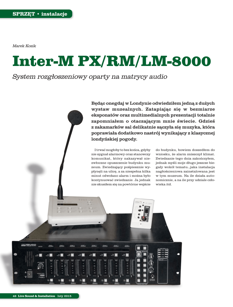 SPRZĘT • instalacje Marek Kozik Inter-M PX/RM/LM-8000 System rozgłoszeniowy oparty na matrycy audio Będąc onegdaj w Londynie odwiedziłem jedną z dużych wystaw muzealnych. Zatapiając się w bezmiarze eksponatów oraz multimedialnych prezentacji totalnie zapomniałem o otaczającym mnie świecie. Gdzieś z zakamarków sal delikatnie sączyła się muzyka, która poprawiała dodatkowo nastrój wynikający z klasycznej londyńskiej pogody. I trwać mogłoby to bez końca, gdyby nie sygnał alarmowy oraz stanowczy komunikat, który nakazywał niezwłoczne opuszczenie budynku muzeum. Zwiedzający pośpiesznie wypłynęli na ulicę, a za niespełna kilka minut odwołano alarm i można było kontynuować zwiedzanie. Ja jednak nie skusiłem się na powtórne wejście 48 Live Sound & Installation luty 2015 do budynku, bowiem doszedłem do wniosku, że alarm zniszczył klimat. Zwiedzanie tego dnia zakończyłem, jednak myśli moje długo jeszcze biegały wokół tematu…jaka instalacja nagłośnieniowa zainstalowana jest w tym muzeum. Na ile działa autonomicznie, a na ile przy udziale człowieka itd. INTER-M PX/RM/LM-8000 Inter-M PX-8000 to matryca audio 8 x 8, która mieści się w obudowie o wysokości 3U. Na tylnej płycie PX-8000 znajdują się wszelkie gniazda wejściowe oraz wyjściowe, jak również część regulatorów nastawianych w zasadzie tylko podczas instalacji urządzenia. Historia ta przypomniała mi się, bowiem w moje ręce trafił system, a w zasadzie matryca, PX-8000 z dodatkowym wyposażeniem, dedykowana do systemów instalacyjnych. Urządzenia, o których będzie mowa wyprodukowała koreańska firma Inter-M, która to od 30 lat zajmuje się produkcją systemów publicznego rozgłaszania, mikserów, wzmacniaczy oraz kamer przemysłowych. PX-8000 Sercem każdego systemu rozgłaszania może być mikser, ale dużo lepszym rozwiązaniem jest matryca audio. Matryca Inter-M PX-8000 mieści się w obudowie o wysokości 3U, wykonanej z blachy stalowej. Przednia płyta przygotowana jest do zamocowania w szafie instalacyjnej. Urządzenie polakierowano na czarny matowy kolor, zaś opisy wykonano w kolorze jasnoszarym. Kolor czarny z szarym nie stanowi zbyt kontrastowej pary, jednak urządzenie jest z klasy tych, które raz się konfiguruje i nie dotyka. Trzeba przyznać, że opisy są wykonane bardzo precyzyjnie. Obudowa na swojej górnej ściance ma otwory wentylacyjne, przez które odbywa się chłodzenie elektroniki. Pomimo instalacyjnego charakteru w zestawie znajdziemy nogi gumowe, w które w razie potrzeby możemy wyposażyć obudowę. NA TYLNEJ PŁYCIE OBUDOWY PX-8000 znajdują się wszelkie gniazda wejściowe oraz wyjściowe, jak również część regulatorów nastawianych w zasadzie tylko podczas instalacji urządzenia. PX8000 jest matrycą 8 x 8, czyli wyposażoną w osiem wejść oraz osiem wyjść audio. Wejścia audio BGM (background music) wykonane są w formie gniazd RCA. Na tylnej płycie znajduje się osiem par wejść, zaś obok każdej pary znajdziemy potencjometr poziomu sygnału wejściowego LEVEL. Zbalansowane wyjścia sygnału audio poszczególnych stref wykonane są w formie gniazd EURO BLOCK. Wyjść jest również osiem, zaś obok każdego z nich znajdziemy parę potencjometrów regulacji barwy – BASS oraz TREBLE. Matrycę PX-8000 wyposażono również w wyjście sygnału w formie gniazda DB25, na pinach którego wyprowadzono sygnały równoważne z sygnałami wyjść indywidualnych. Dodatkowo matryca może zostać wyposażona w sterownik naścienny LM-8000 dla każdej strefy, stąd na tylnej płycie umieszczono osiem gniazd RJ45. Obok nich znajdują się cztery kolejne gniazda RJ45, służące do podłączenia pulpitów mikrofonowych RM-8000. Gniazda pulpitów mają swój priorytet działania – najwyższy ma wejście nr. 1, zaś najniższy – nr. 4. Obok gniazd pulpitów umieszczono potencjometry regulacji poziomu sygnału wejściowego. PX-8000 dysponuje własnym wejściem mikrofonowym do rozgłaszania komunikatów. Przed komunikatem głosowym, jak i po nim, można aktywować sygnał gongu. Wyłącznik kodowy konfiguracji rodzaju gongu znajdziemy na tylnej płycie obudowy. Umieszczono tam również wyłącznik napięcia fantomowego dla mikrofonu, który – jak widać – może być zarówno przetwornikiem dynamicznym, jak i pojemnościowym. PX-8000 wyposażony jest również w system automatycznego odtwarzania komunikatów alarmowych o maksymalnej długości 30 sek. Odtwarzanie komunikatu dla poszczególnych stref odbywa się po zwarciu wejścia konkretnej strefy do Na układ elektroniczny matrycy PX-8000 składa się osiem płyt drukowanych, połączonych ze sobą za pośrednictwem taśm wieloprzewodowych. luty 2015 Live Sound & Installation 49 SPRZĘT • instalacje masy. Wejścia alarmowe FIRE ALARM, służące do „odpalania” komunikatów, wykonano w formie gniazda EUROBLOCK i umieszczono na tylnej płycie obudowy. Do sterowania potrzebny jest więc jeden styk NO, sterowany przez system P. Poż danej strefy. Jeżeli osiem stref wyjściowych to za mało, można urządzenia PX-8000 łączyć ze sobą kaskadowo, zwiększając liczbę nagłaśnianych stref. Jedna z matryc musi być wtedy skonfigurowana jako Master, zaś pozostałe jako Slave. Przełącznik Master/ Slave umieszczono na tylnej płycie obudowy, zaś obok niego znajdziemy dwa gniazda DB25 wejść i wyjść sygnałów, które należy odpowiednio połączyć pomiędzy urządzeniami. W instrukcji użytkownika znajdziemy opis koniecznych połączeń. Ostatnim elementem tylnej płyty jest zamocowany na stałe przewód zasilania sieciowego z sieci napięcia przemiennego 230 V. NA PRZEDNIM PANELU PX-8000 znajdują się regulatory, przełączniki oraz gniazda, które wykorzystuje się nie tylko w momencie instalacji, ale również podczas codziennej pracy systemu. W centralnej części przedniej płyty znajduje się osiem 45-milimetrowych tłumików poziomu głośności stref dla kana