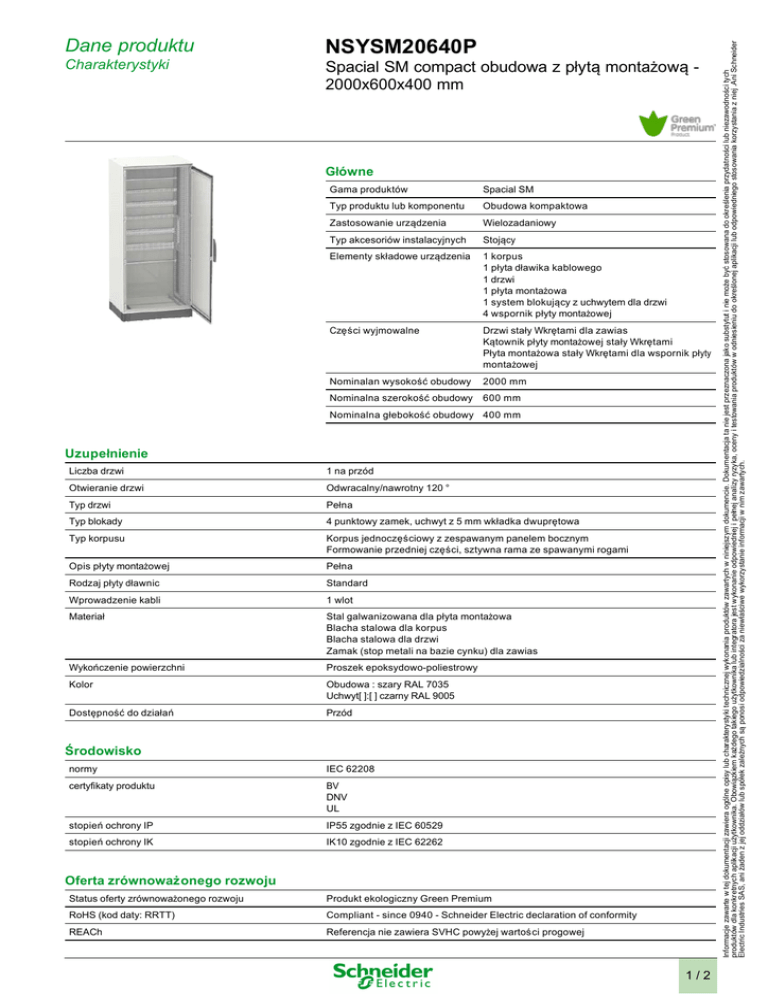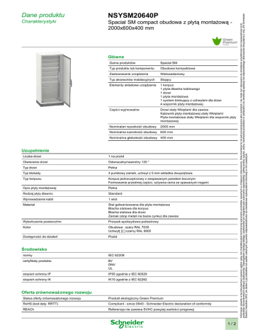NSYSM20640P Charakterystyki Spacial SM compact obudowa z płytą montażową 2000x600x400 mm Główne Gama produktów Spacial SM Typ produktu lub komponentu Obudowa kompaktowa Zastosowanie urządzenia Wielozadaniowy Typ akcesoriów instalacyjnych Stojący Elementy składowe urządzenia 1 korpus 1 płyta dławika kablowego 1 drzwi 1 płyta montażowa 1 system blokujący z uchwytem dla drzwi 4 wspornik płyty montażowej Części wyjmowalne Drzwi stały Wkrętami dla zawias Kątownik płyty montażowej stały Wkrętami Płyta montażowa stały Wkrętami dla wspornik płyty montażowej Nominalan wysokość obudowy 2000 mm Nominalna szerokość obudowy 600 mm Nominalna głebokość obudowy 400 mm Uzupełnienie Liczba drzwi 1 na przód Otwieranie drzwi Odwracalny/nawrotny 120 ° Typ drzwi Pełna Typ blokady 4 punktowy zamek, uchwyt z 5 mm wkładka dwuprętowa Typ korpusu Korpus jednoczęściowy z zespawanym panelem bocznym Formowanie przedniej części, sztywna rama ze spawanymi rogami Opis płyty montażowej Pełna Rodzaj płyty dławnic Standard Wprowadzenie kabli 1 wlot Materiał Stal galwanizowana dla płyta montażowa Blacha stalowa dla korpus Blacha stalowa dla drzwi Zamak (stop metali na bazie cynku) dla zawias Wykończenie powierzchni Proszek epoksydowo-poliestrowy Kolor Obudowa : szary RAL 7035 Uchwyt[ ]:[ ] czarny RAL 9005 Dostępność do działań Przód Środowisko normy IEC 62208 certyfikaty produktu BV DNV UL stopień ochrony IP IP55 zgodnie z IEC 60529 stopień ochrony IK IK10 zgodnie z IEC 62262 Oferta zrównoważonego rozwoju Status oferty zrównoważonego rozwoju Produkt ekologiczny Green Premium RoHS (kod daty: RRTT) Compliant - since 0940 - Schneider Electric declaration of conformity REACh Referencja nie zawiera SVHC powyżej wartości progowej 1/2 Informacje zawarte w tej dokumentacji zawiera ogólne opisy lub charakterystyki technicznej wykonania produktów zawartych w niniejszym dokumencie. Dokumentacja ta nie jest przeznaczona jako substytut i nie może być stosowana do określenia przydatności lub niezawodności tych produktów dla konkretnych aplikacji użytkownika. Obowiązkiem każdego takiego użytkownika lub integratora jest wykonanie odpowiedniej i pełnej analizy ryzyka, oceny i testowania produktów w odniesieniu do określonej aplikacji lub odpowiedniego stosowania korzystania z niej .Ani Schneider Electric Industries SAS, ani żaden z jej oddziałów lub spółek zależnych są ponosi odpowiedzialności za niewłaściwe wykorzystanie informacji w nim zawartych. Dane produktu Profil ekologiczny produktu Dostępny Instrukcje dotyczące zakończenia okresu eksploatacji produktu Bez potrzeby specjalnych działań recyklingowych Contractual warranty Okres 18 miesięcy 2/2